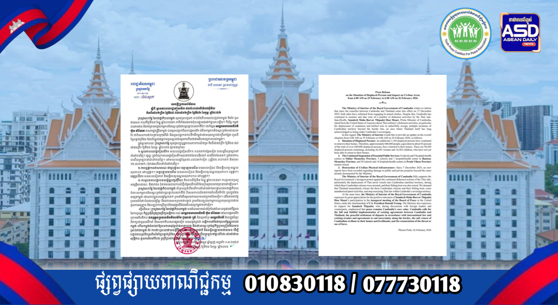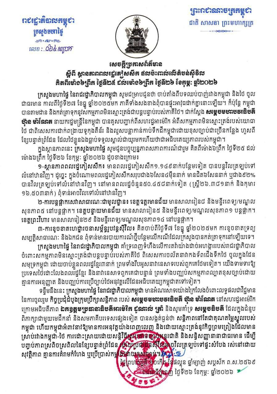 ក្រសួងមហាផ្ទៃ|សេចក្តីប្រកាសព័ត៌មាន ស្តីពីស្ថានភាពពលរដ្ឋភៀសសឹក និងផល ប៉ះពាល់លើតំបន់ស៊ីវិល គិតត្រឹមព្រឹក ថ្ងៃទី២៦ ខែកុម្ភៈ ឆ្នាំ២០២៦! Press Release on the Situation of Displaced Persons and Impact on Civilian Areas as of the morning of 26 February 2026.