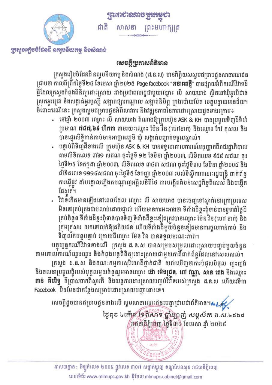 ចំពោះដីដែលតំណាងរបស់ឧកញ៉ា លី សាយឃាង អះអាងថាជាដីរបស់លោកនោះគឺមានទំហំ ៧៨៧ហិកតា មានឯកសារទិញលក់តាំងពីឆ្នាំ ២០០៣-២០០៤ និង មានការបញ្ជាក់ដឹងឮ បោះត្រាដោយអគ្គនាយដ្ឋានសុរិយោដី និងភូមិបាលត្រឹមត្រូវ  ព្រមទាំងសេចក្តីប្រកាសព័ត៌មានរបស់ក្រសួងដែនដី នគរូបនីយកម្ម និងសំណង់ នៅថ្ងៃទី៣០ ខែមេសា ឆ្នាំ២០២៥ ដែលបញ្ជាក់ច្បាស់ណាស់ថាដីទំហំ ៧៨៧ហិកតា ជាដីរបស់ក្រុមហ៊ុន ASK&KH ហើយអ្នកស្រី ពៅ វណ្ណា ក៏ត្រូវបានគេរកឃើញថាមានការញុះញ៉ង់ ចលនាប្រមូលផ្តុំ ដែលប្រាស់ចាកស្មារតី និងយន្តការដោះស្រាយវិវាទរបស់ក្រសួង ដ.ន.ស។