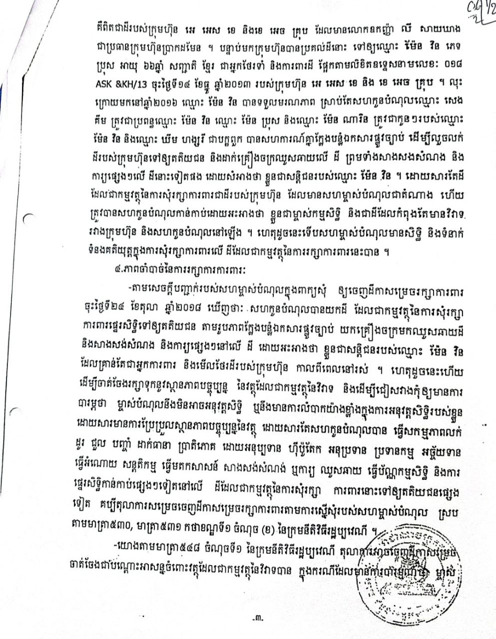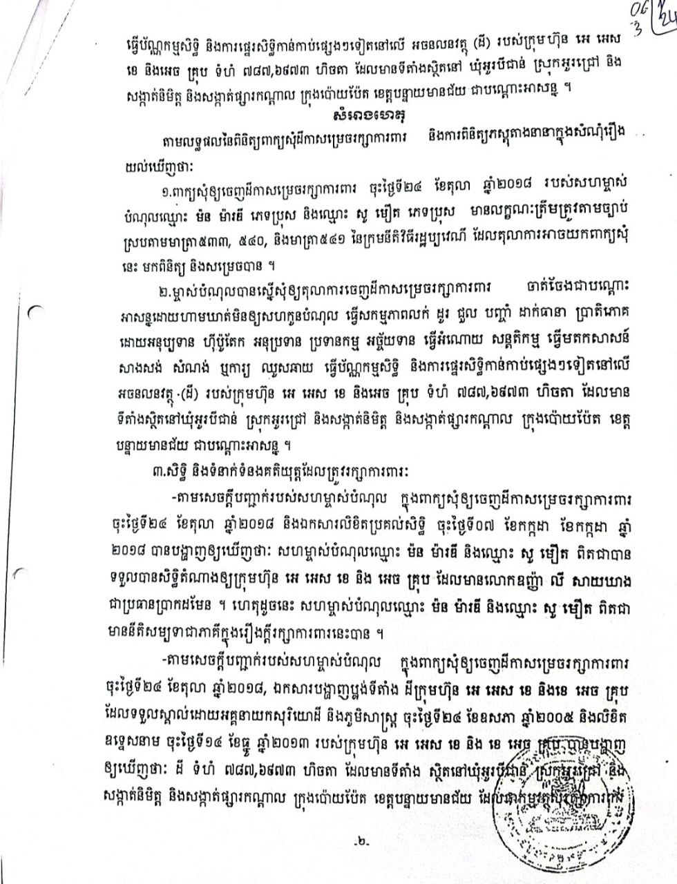 ជ៉ំការលើឡើងរបស់តំណាងឧកញ៉ា លី សាយឃាង នេះភ្នាក់របស់យើងបានធ្វើការទំនាក់ទំនងទៅលោក តុល សារិន មេឃ៉ំអូរបីជាន់លោកបានប្រាប់ លោកចូលធ្វើមេឃ៉ំក្នុងឆ្នាំ២០១៨ ហើយអ្នកសារព័ត៌មានសួរទៀតថាចុះហេតុអ្វីបានជាមានហត្ថលេខារបស់លើលិខិតផ្ទេសិទ្ធក្នុងឆ្នាំ២០០៤ ទៅវិញ? តែលោកមិនឆ្លើយតប!