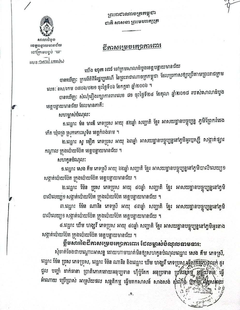 ក្នុងករណីនេះគប្បីរដ្ឋបាលខេត្តបន្ទាយមានជ័យ មានការស៊ើបអង្កេត ជាពិសេសក្រសួងមហាផ្ទៃមេត្តាជួយអន្តរាគមន៍ក្នុងករណីនេះផង។