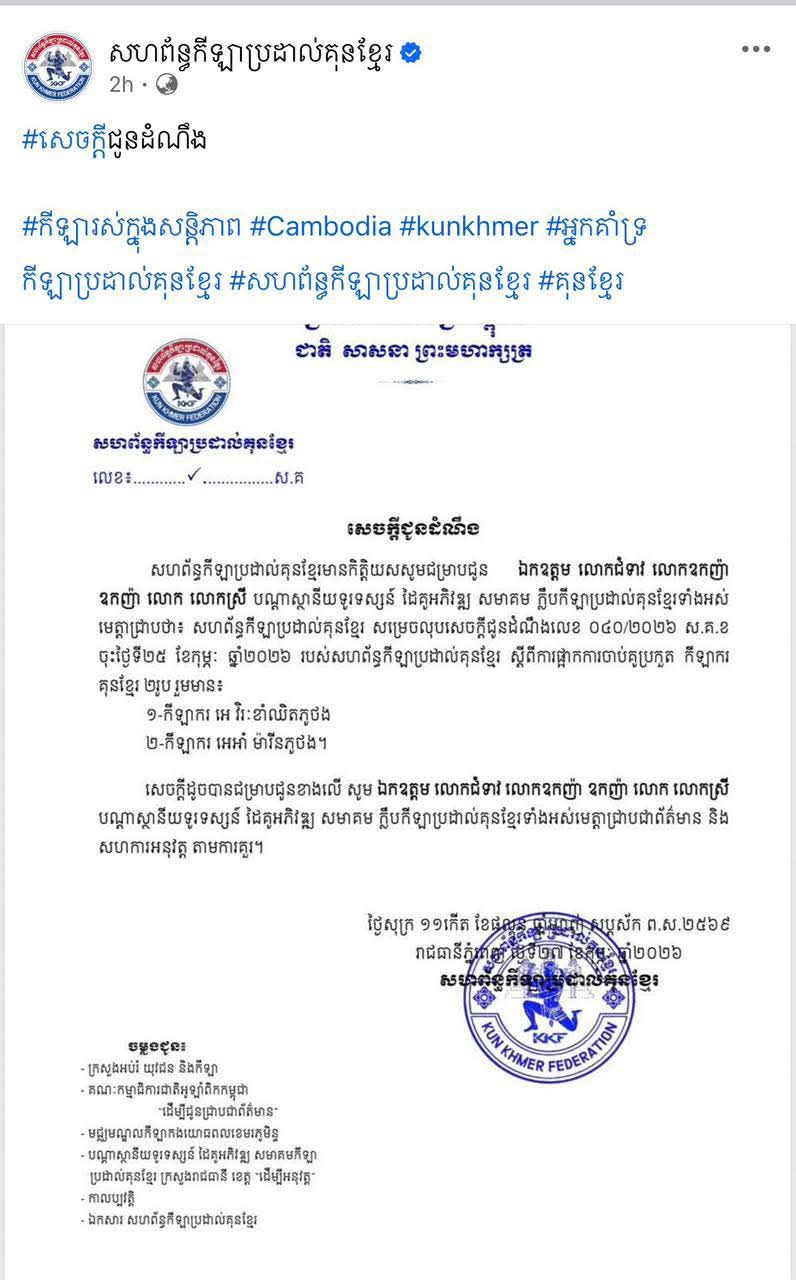 (រាជធានីភ្នំពេញ):បន្ទាប់ពីសម្តេចតេជោ ហ៊ុន សែន ប្រធានព្រឹទ្ធសភានៃព្រះរាជាណាចក្រកម្ពុជា បានធ្វេីការបង្ហោះសំណេរអន្តរាគមន៍កាលពីព្រឹកថ្ងៃទី២៧ ខែកុម្ភះ ឆ្នាំ២០២៦ នេះ ជុំវិញរឿងរ៉ាវរបស់សហព័ន្ធកីឡាគុនខ្មែរសម្រេចពិន័យកីឡាករប្រដាល់២រូបដែលត្រូវជាកូនបង្កេីតរបស់អតីតលោកគ្រូអេង ភូថង មិនអោយចូលរួមប្រកួតរយះពេល៦ខែ មិនដល់ប៉ុន្មានផងស្រាប់តែសហព័ន្ធកីឡាប្រដាល់គុណខ្មែរបានសម្រេចលុបចោលភ្លាមៗនូបសេចក្តីជូនដំណឹងលេខ ០៤០/២០២៦ ស.គ.ខ ចុះថ្ងៃទី២៥ ខែកុម្ភៈ ឆ្នាំ២០២៦ របស់សហព័ន្ធកីឡាប្រដាល់គុនខ្មែរ ស្តីពីការផ្អាកការចាប់គូប្រកួត កីឡាករ គុនខ្មែរ ២រូប រួមមាន៖