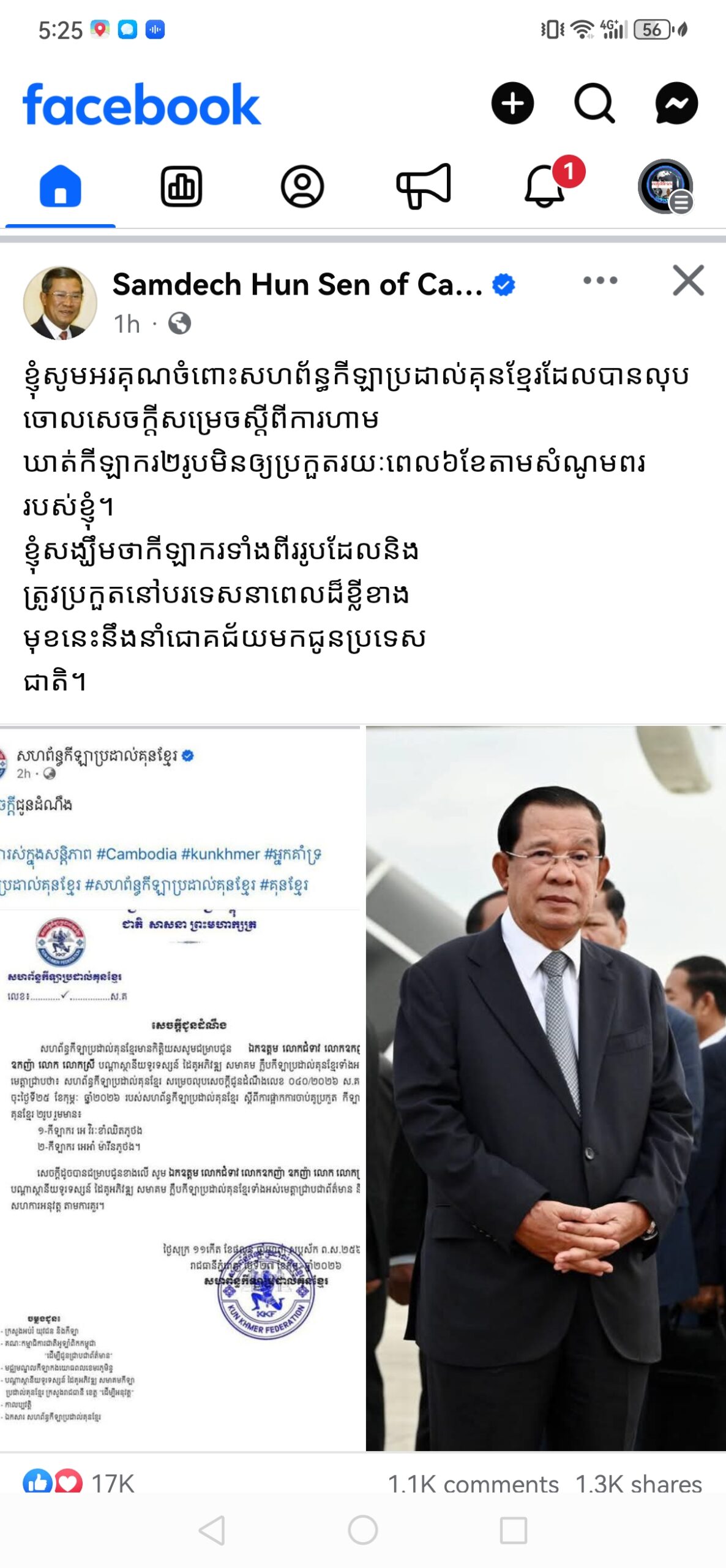 សម្តេចតេជោ ហ៊ុន សែន ថ្លែងអំណរគុណដល់សហព័ន្ធកីឡា ប្រដាល់គុនខ្មែរ ដែលបានលុបចោលសេចក្តីសម្រេចស្តីពី ការហាមឃាត់កីឡាករ២រូបមិនឲ្យប្រកួតរយៈពេល៦ខែតាម សំណូមពររបស់សម្តេច.