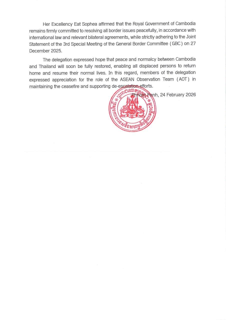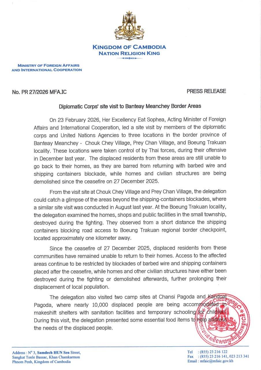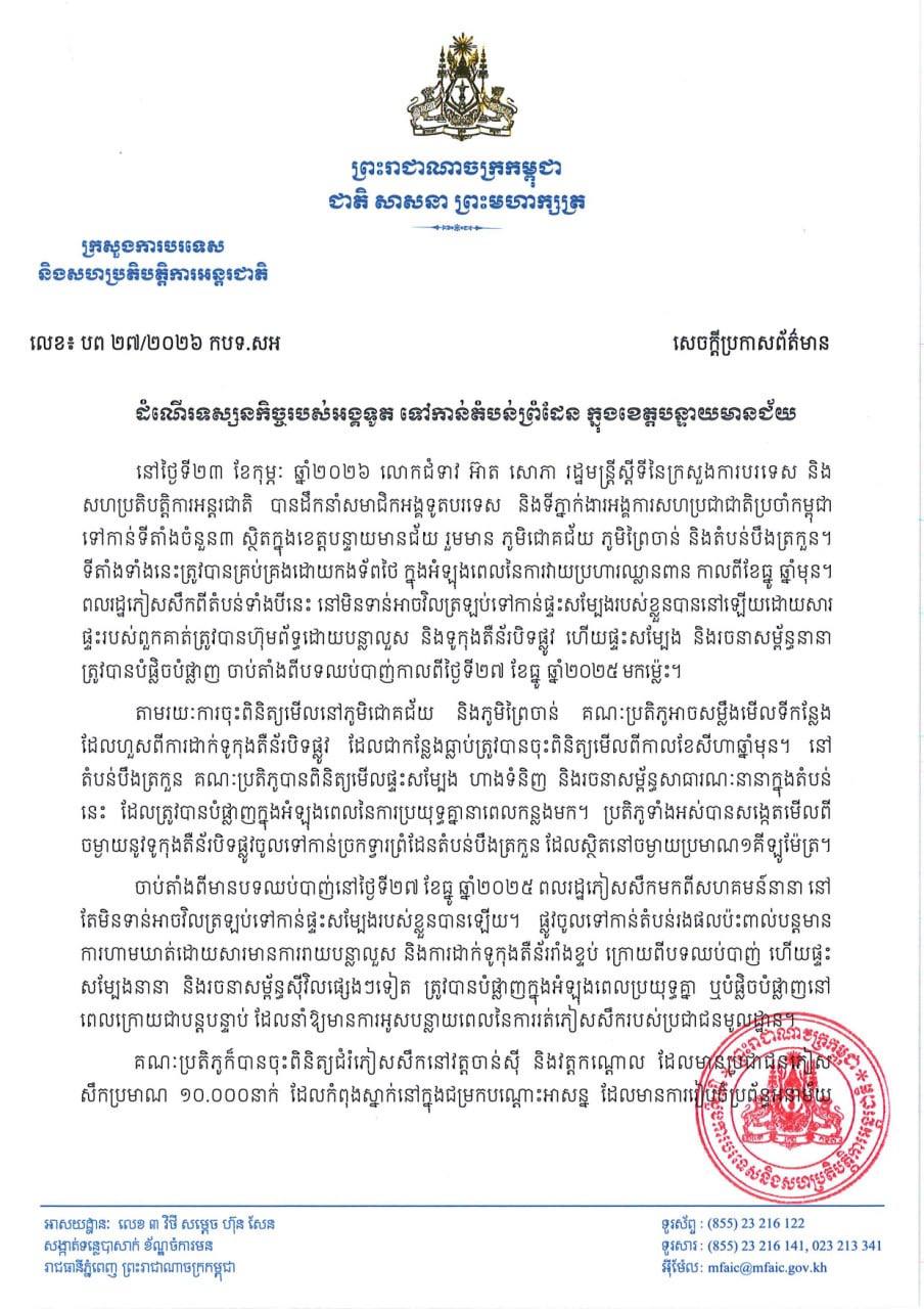 ក្រសួង​ការ​បរទេស ​និង​សហ​ប្រតិបត្តិ​ការ​អន្តរជាតិ​|សេចក្តីប្រកាសព័ត៌មានដំណើរទស្សនកិច្ច របស់អង្គទូត ទៅកាន់តំបន់ព្រំដែន ក្នុងខេត្ត បន្ទាយមានជ័យ