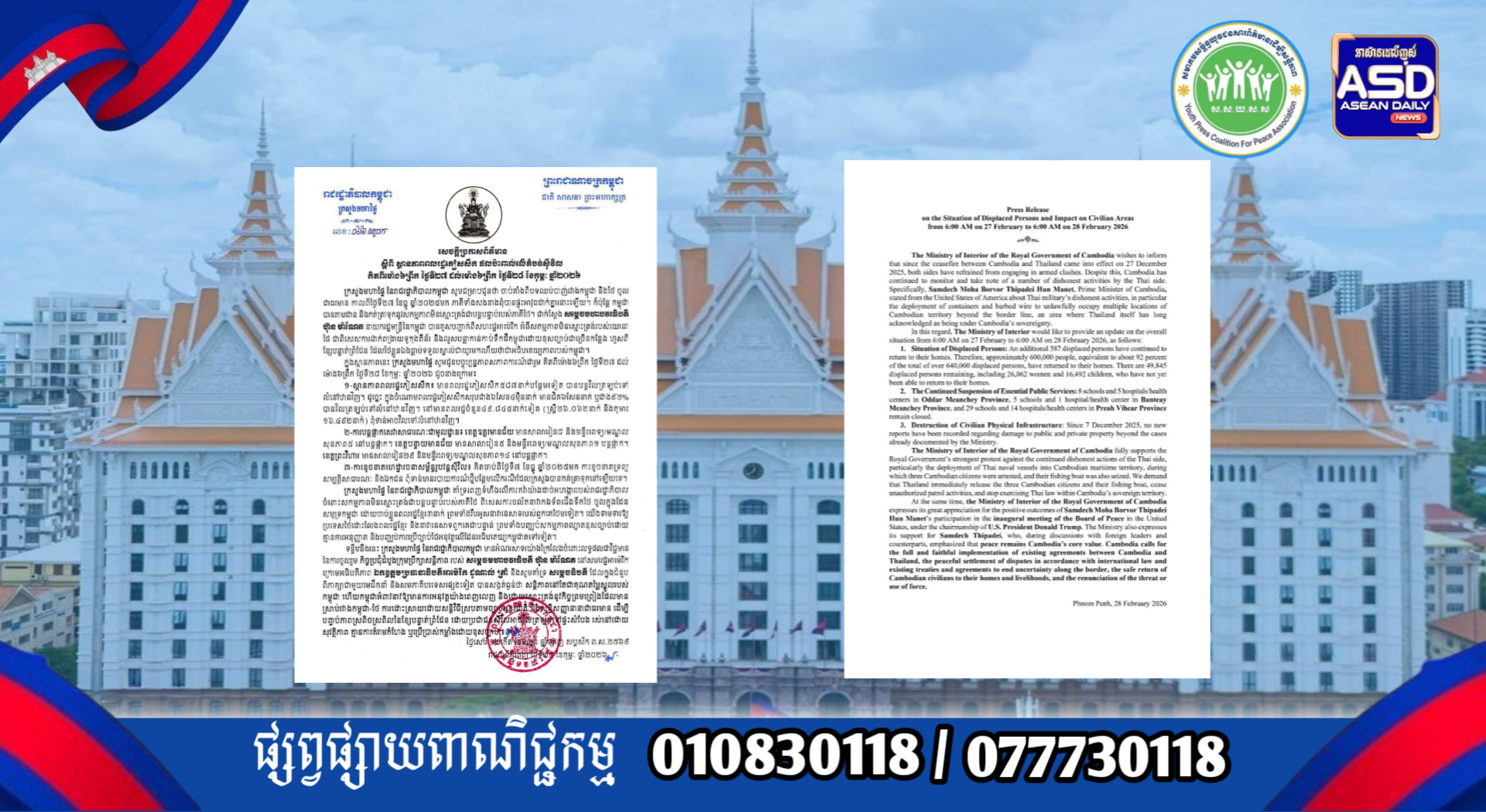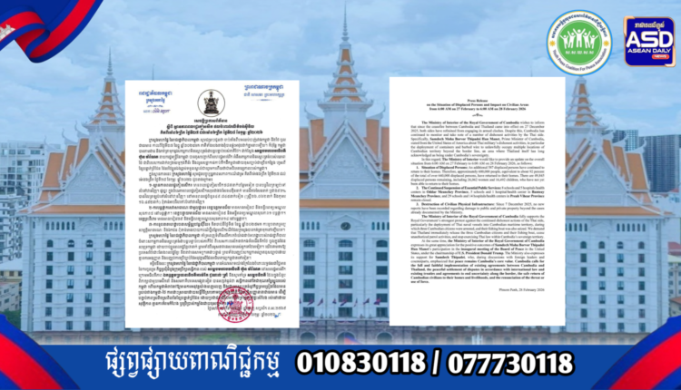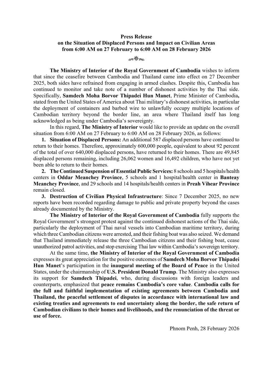ក្រសួងមហាផ្ទៃ|សេចក្តីប្រកាសព័ត៌មាន ស្តីពី ស្ថានភាពពលរដ្ឋភៀសសឹក និងផល ប៉ះពាល់លើតំបន់ស៊ីវិល គិតត្រឹមព្រឹក ថ្ងៃទី២៨ ខែកុម្ភៈ ឆ្នាំ២០២៦។ Press Release on the Situation of Displaced Persons and Impact on Civilian Areas as of the Morning of 28 February 2026.