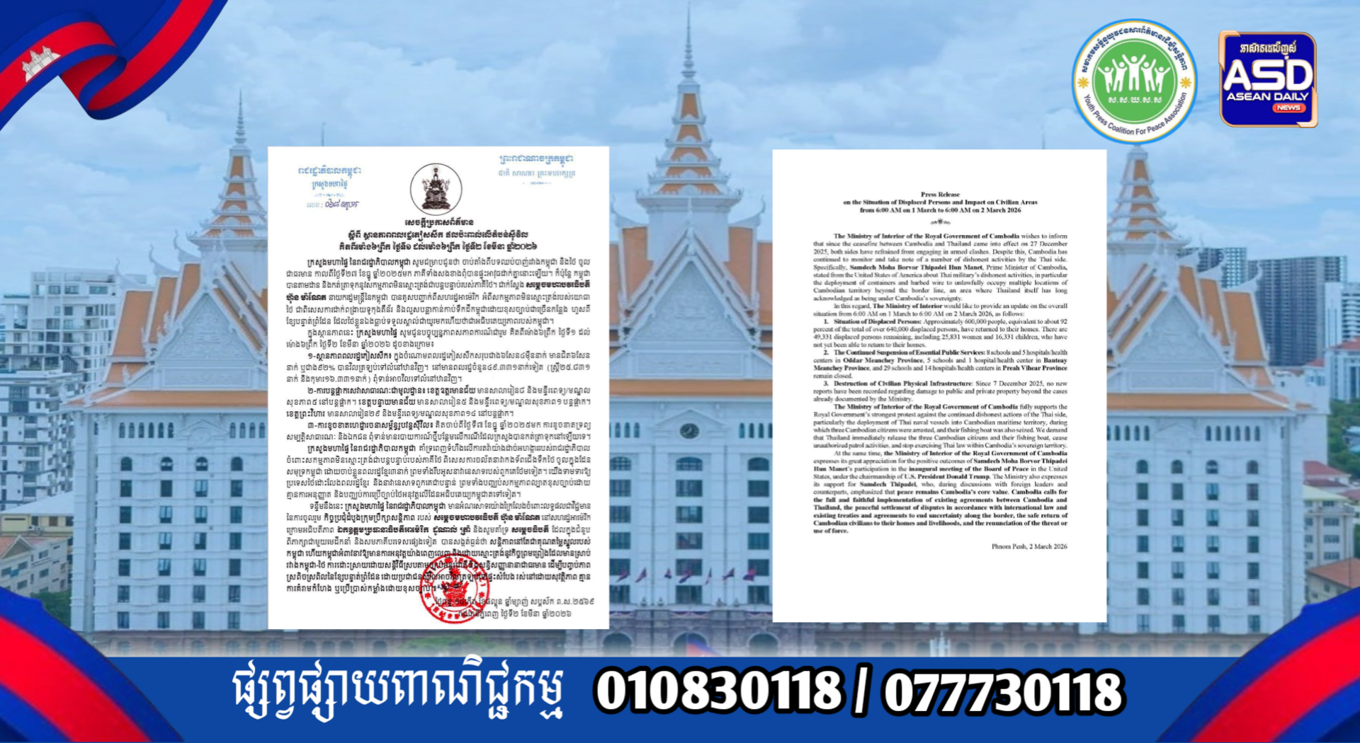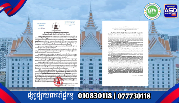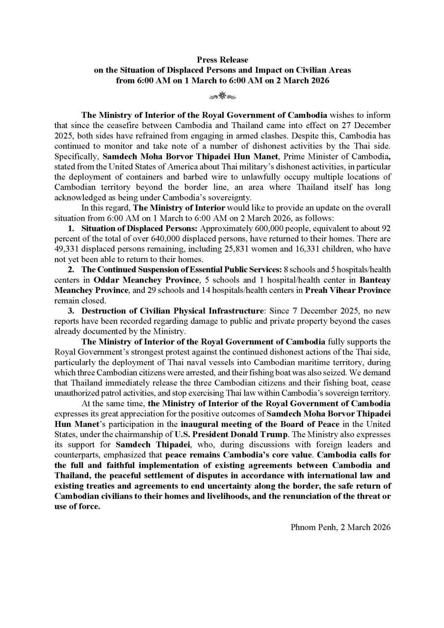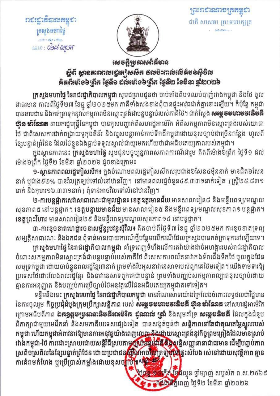 ក្រសួងមហាផ្ទៃ|សេចក្តីប្រកាសព័ត៌មាន ស្តីពីស្ថានភាពពលរដ្ឋភៀសសឹក និងផល ប៉ះពាល់លើតំបន់ស៊ីវិល គិតត្រឹមព្រឹក ថ្ងៃទី២ ខែមីនា ឆ្នាំ២០២៦។ Press Release on the Situation of Displaced Persons and Impact on Civilian Areas as of the Morning of 2 March 2026.