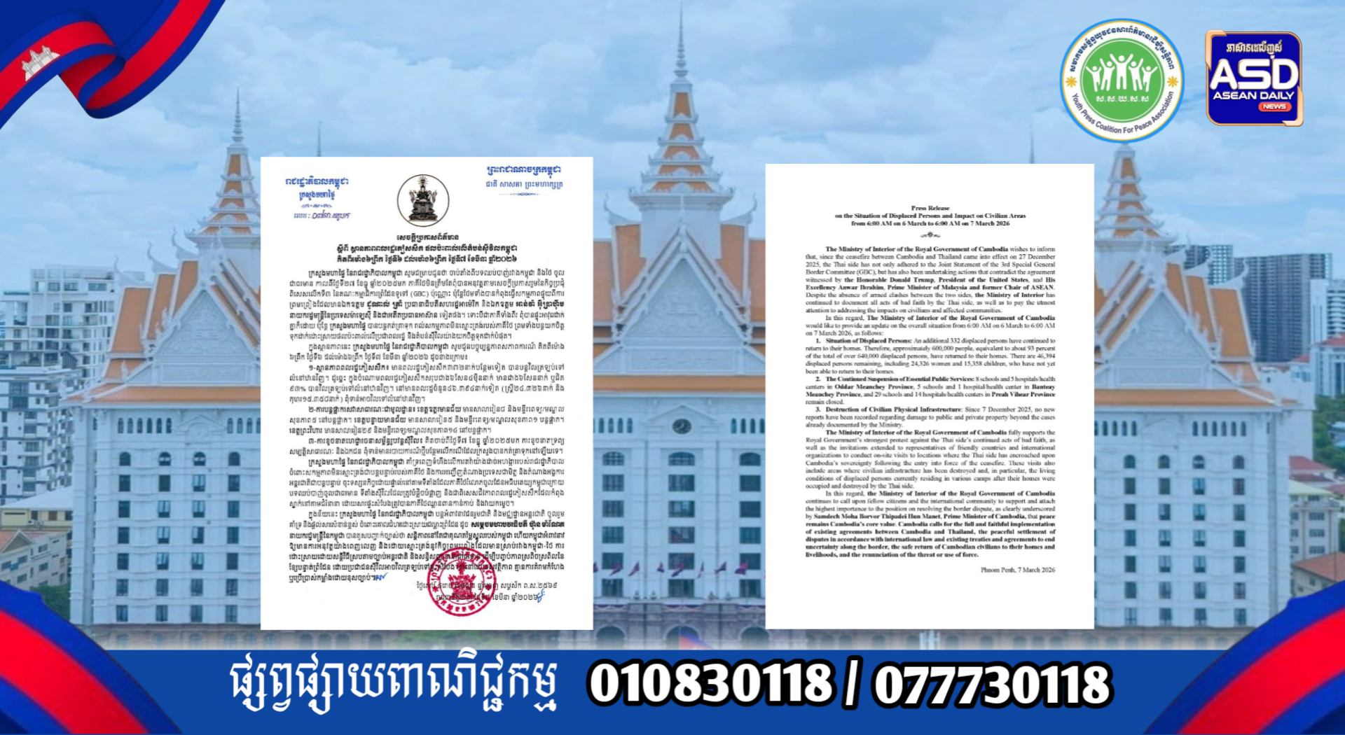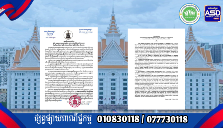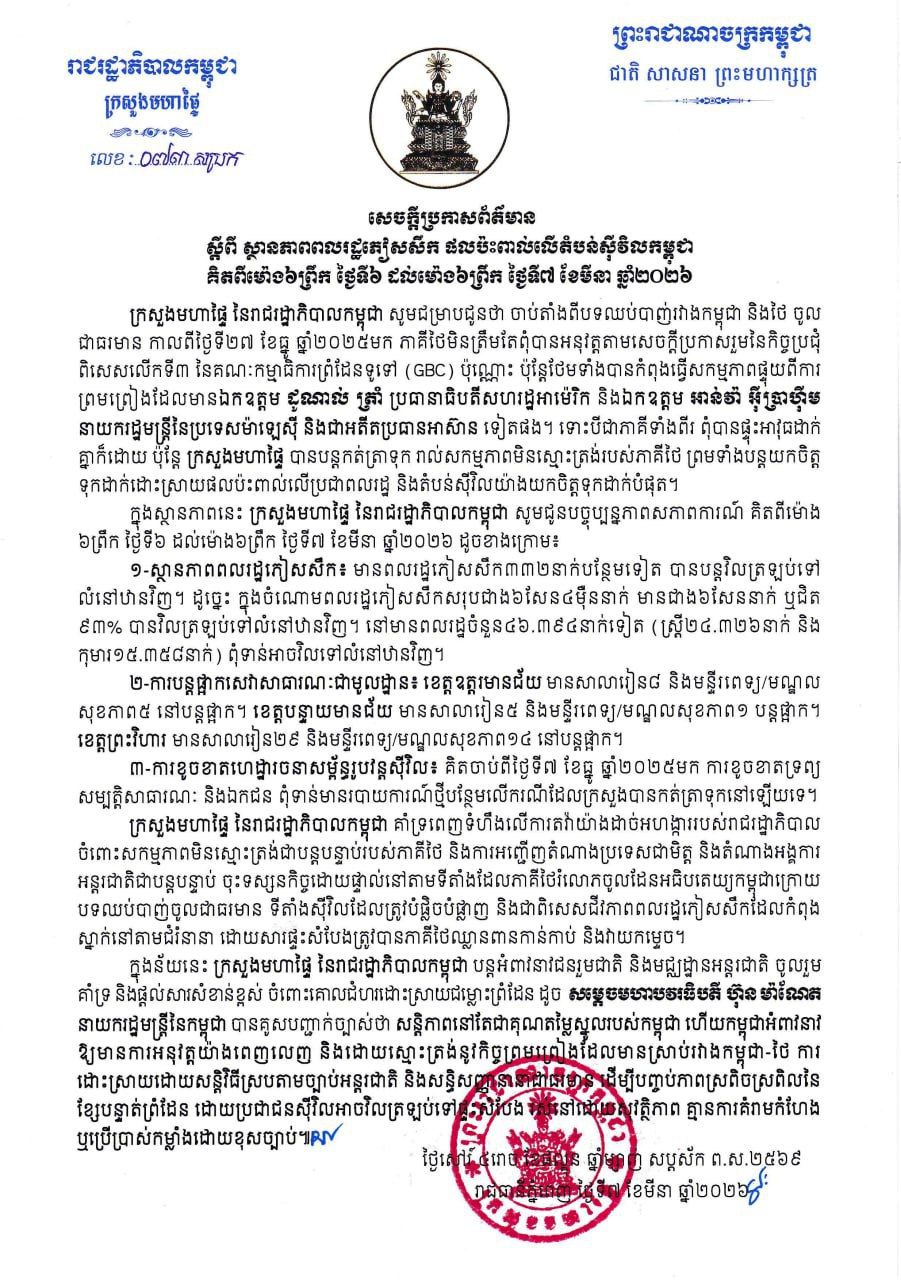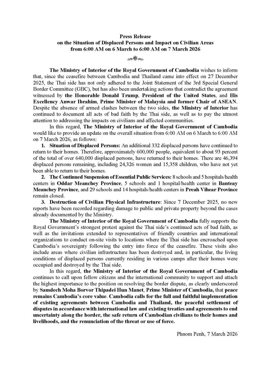ក្រសួងមហាផ្ទៃ|សេចក្តីប្រកាសព័ត៌មាន ស្តីពីស្ថានភាពពលរដ្ឋភៀសសឹក និងផល ប៉ះពាល់លើតំបន់ស៊ីវិល គិតត្រឹមព្រឹក ថ្ងៃទី៧ ខែមីនា ឆ្នាំ២០២៦។ Press Release on the Situation of Displaced Persons and Impact on Civilian Areas as of the Morning of 7 March 2026.