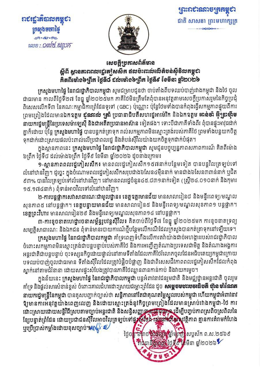 ក្រសួងមហាផ្ទៃ|សេចក្តីប្រកាសព័ត៌មាន ស្តីពីស្ថានភាពពលរដ្ឋ ភៀសសឹក និងផលប៉ះពាល់លើតំបន់ស៊ីវិល គិត ត្រឹមព្រឹក ថ្ងៃទី៩ ខែមីនា ឆ្នាំ២០២៦។ Press Release on the Situation of Displaced Persons and Impact on Civilian Areas as of the Morning of 9 March 2026.