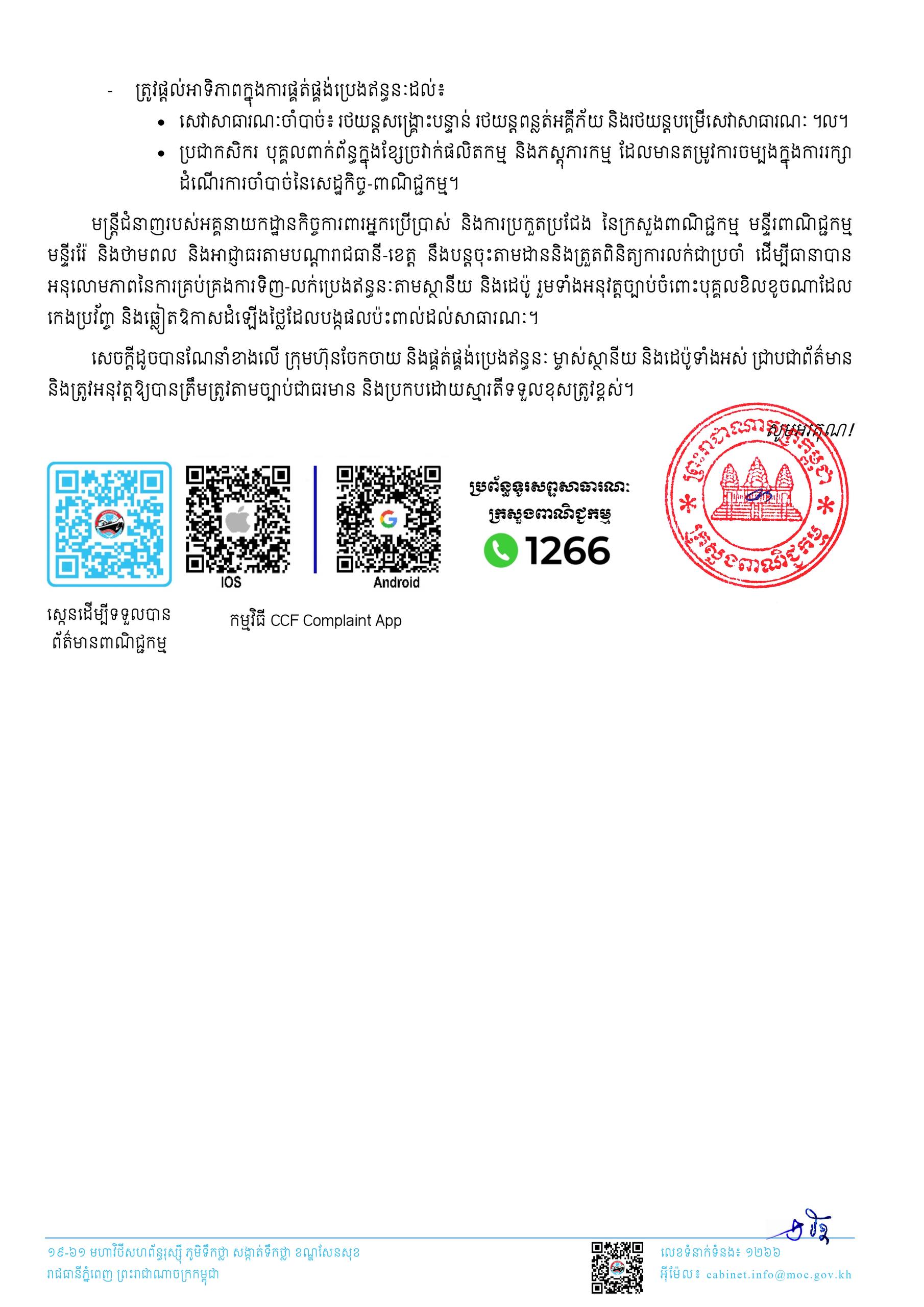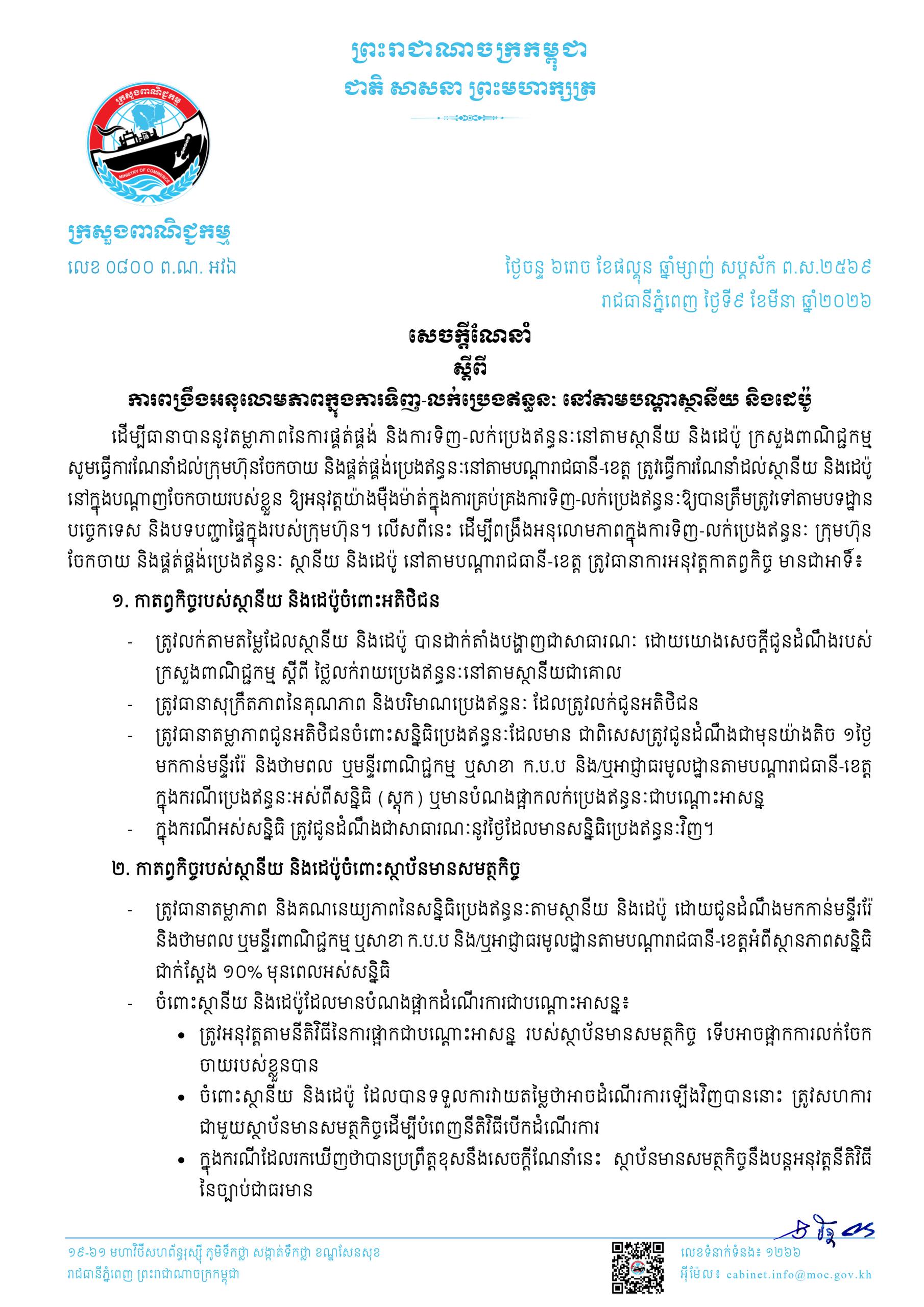 ក្រសួងពាណិជ្ជកម្ម|សេចក្តីណែនាំ ស្តីពី ការពង្រឹងអនុលោមភាពក្នុងការទិញ-លក់ប្រេងឥន្ធនៈ នៅតាមបណ្តាស្ថានីយ និងដេប៉ូ.