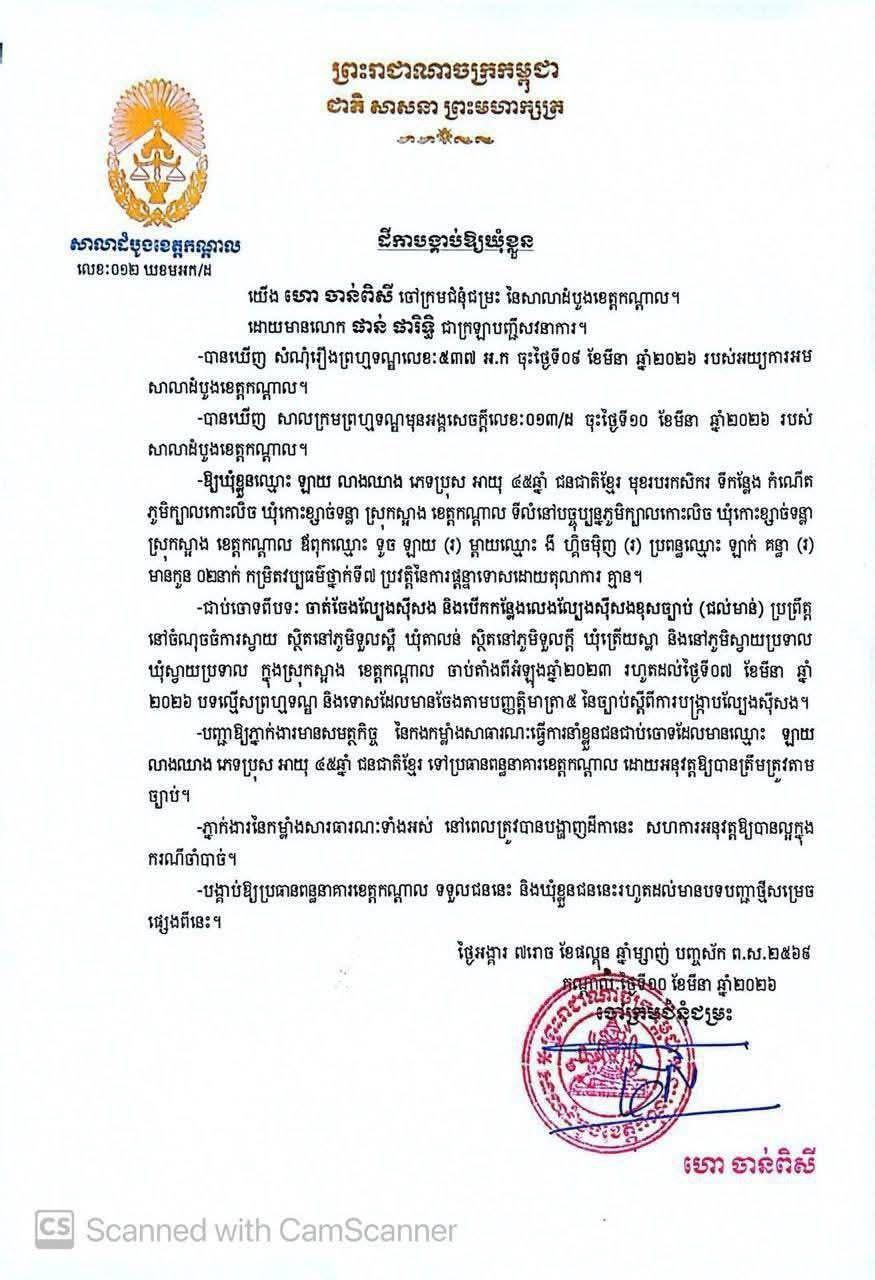 មេខ្លោងល្បែងស៊ីសងខុសច្បាប់ប្រចាំស្រុកស្អាង ឈ្មោះ ឡាយ លាងឈាង ត្រូវបានកម្លាំងអាជ្ញាធរ ខេត្តកណ្តាលចាប់ឃាត់ខ្លួន ខណៈចៅក្រម សាលាដំបូងខេត្តកណ្តាលចេញដីកាឃុំខ្លួន ហើយ!