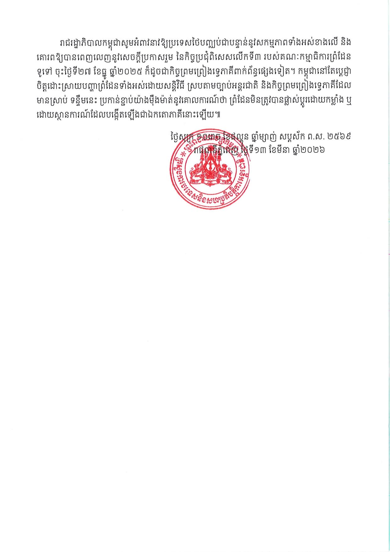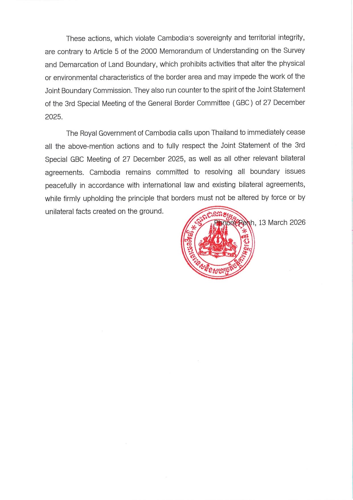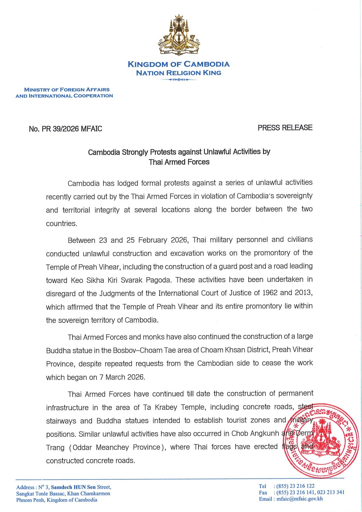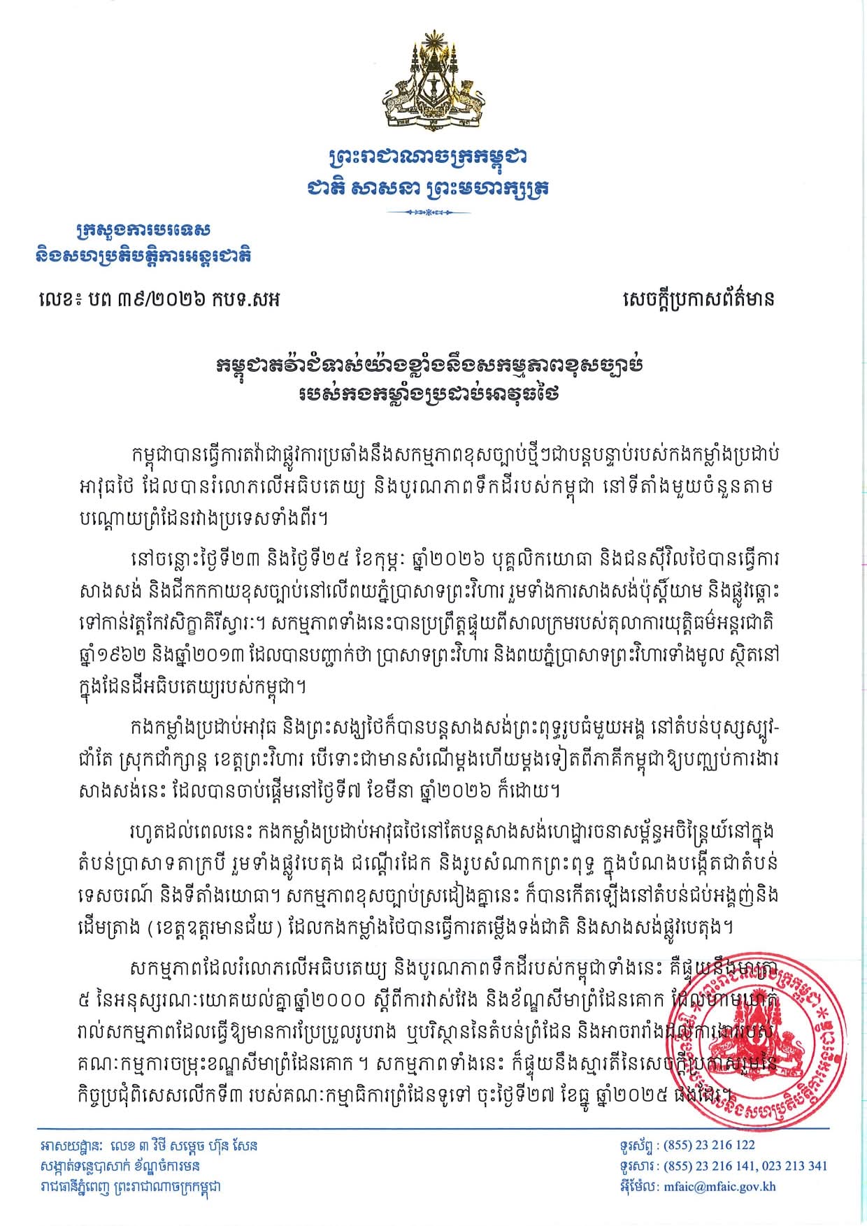 កម្ពុជាតវ៉ាជំទាស់យ៉ាងខ្លាំងនឹងសកម្មភាពខុសច្បាប់ របស់កងកម្លាំងប្រដាប់អាវុធថៃ Cambodia Strongly Protests against Unlawful Activities by Thai Armed Forces.