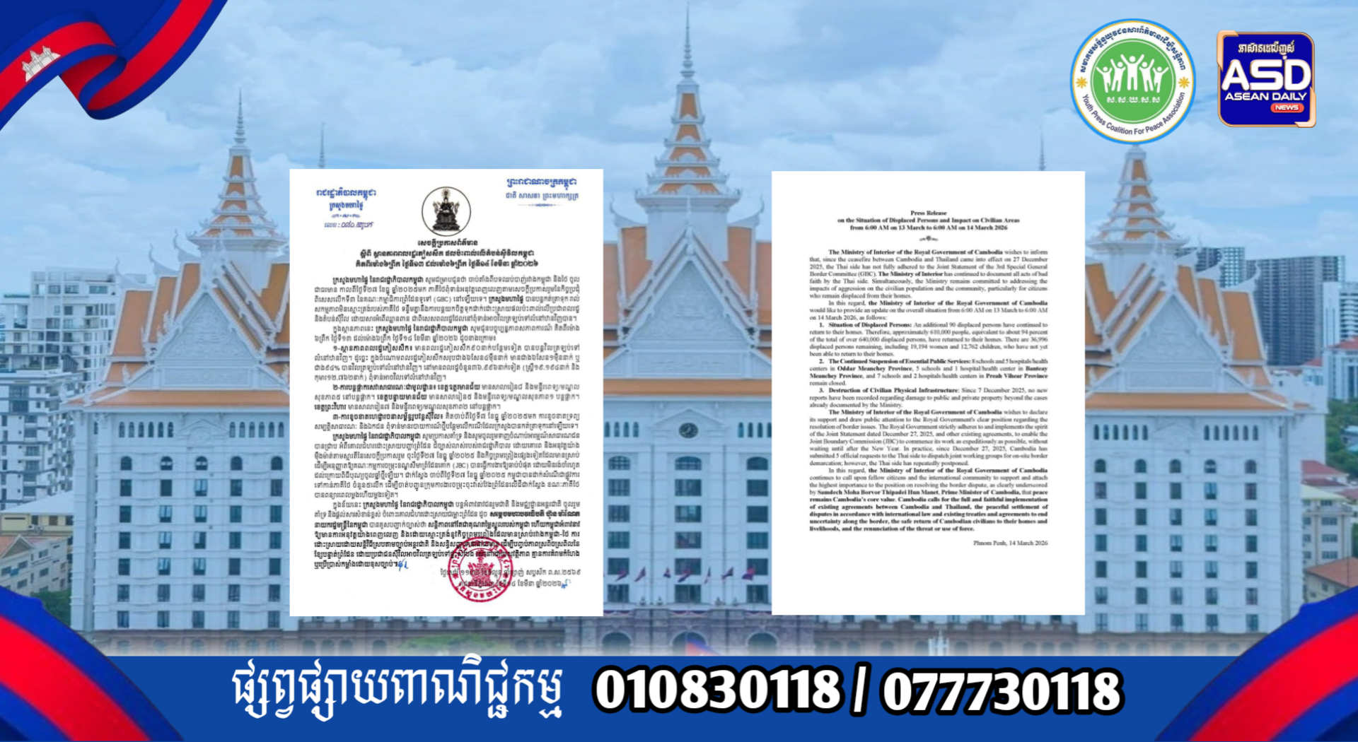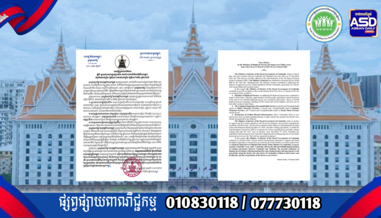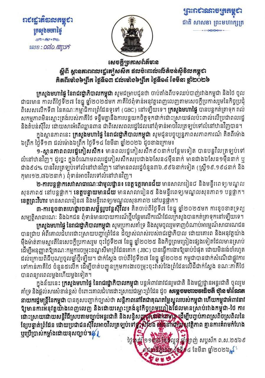 ក្រសួងមហាផ្ទៃ|សេចក្តីប្រកាសព័ត៌មាន ស្តីពីស្ថានភាពពលរដ្ឋភៀសសឹក និងផល ប៉ះពាល់លើតំបន់ស៊ីវិល គិតត្រឹមព្រឹក ថ្ងៃទី១៤ ខែមីនា ឆ្នាំ២០២៦។ Press Release on the Situation of Displaced Persons and Impact on Civilian Areas as of the Morning of 14 March 2026.