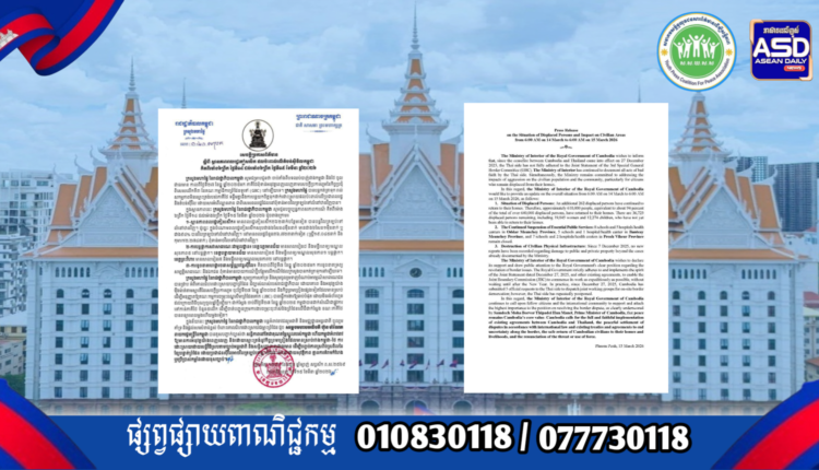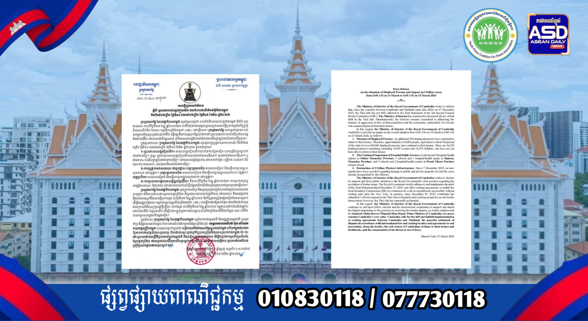 ក្រសួងមហាផ្ទៃ|សេចក្តីប្រកាសព័ត៌មាន ស្តីពី ស្ថានភាព ពលរដ្ឋភៀសសឹក និងផលប៉ះពាល់លើតំបន់ស៊ីវិល គិតត្រឹមព្រឹក ថ្ងៃទី១៥ ខែមីនា ឆ្នាំ២០២៦។ Press Release on the Situation of Displaced Persons and Impact on Civilian Areas as of the Morning of 15 March 2026.