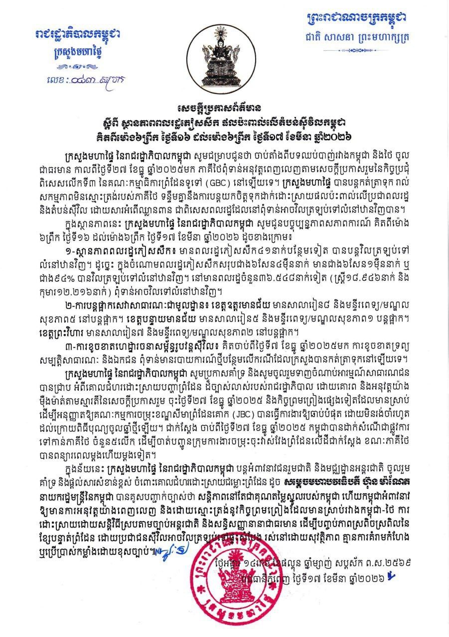 ក្រសួងមហាផ្ទៃ|សេចក្តីប្រកាសព័ត៌មាន ស្តីពីស្ថានភាពពលរដ្ឋ ភៀសសឹក និងផលប៉ះពាល់លើតំបន់ស៊ីវិល គិត ត្រឹមព្រឹក ថ្ងៃទី១៧ ខែមីនា ឆ្នាំ២០២៦។ Press Release on the Situation of Displaced Persons and Impact on Civilian Areas as of the Morning of 17 March 2026.
