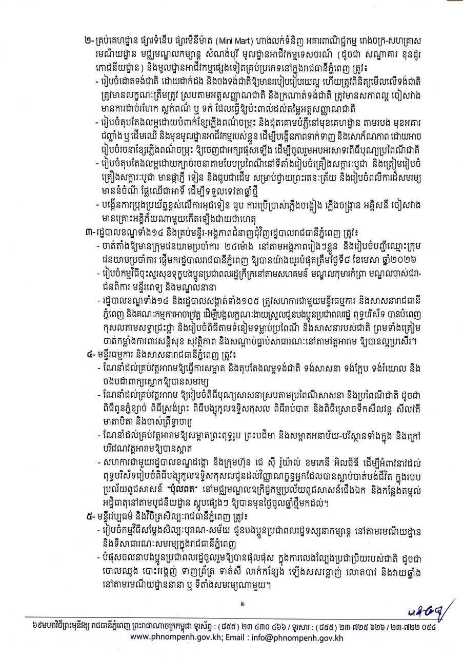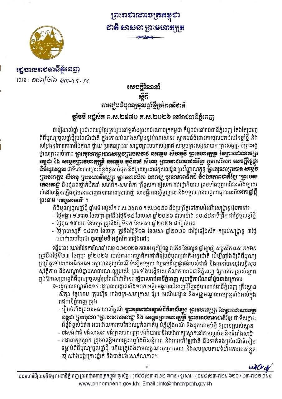 រដ្ឋបាលរាជធានីភ្នំពេញ ណែនាំឱ្យបំផុសចលនា បងប្អូនប្រជាពលរដ្ឋចូលរួមឱ្យបានផុលផុស ក្នុងការលេងល្បែងប្រជាប្រិយរបស់ជាតិដូចជា ចោលឈូង បោះអង្គញ់ ទាញព្រ័ត្រ ទាត់សី លាក់កន្សែង ឡើងសសរខ្លាញ់ លោតបាវ នៅតាមរមណីយដ្ឋាននានា ឬ ទីតាំងសមរម្យណាមួយ ក្នុងឱកាសបុណ្យចូលឆ្នាំថ្មី ប្រពៃណីខ្មែរ នាពេលខាងមុខ។