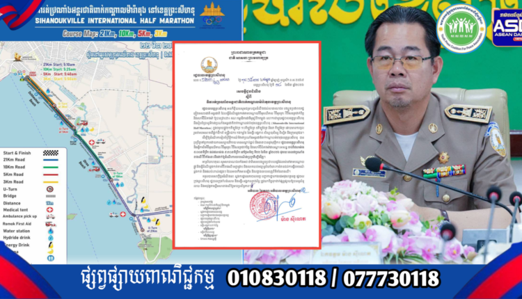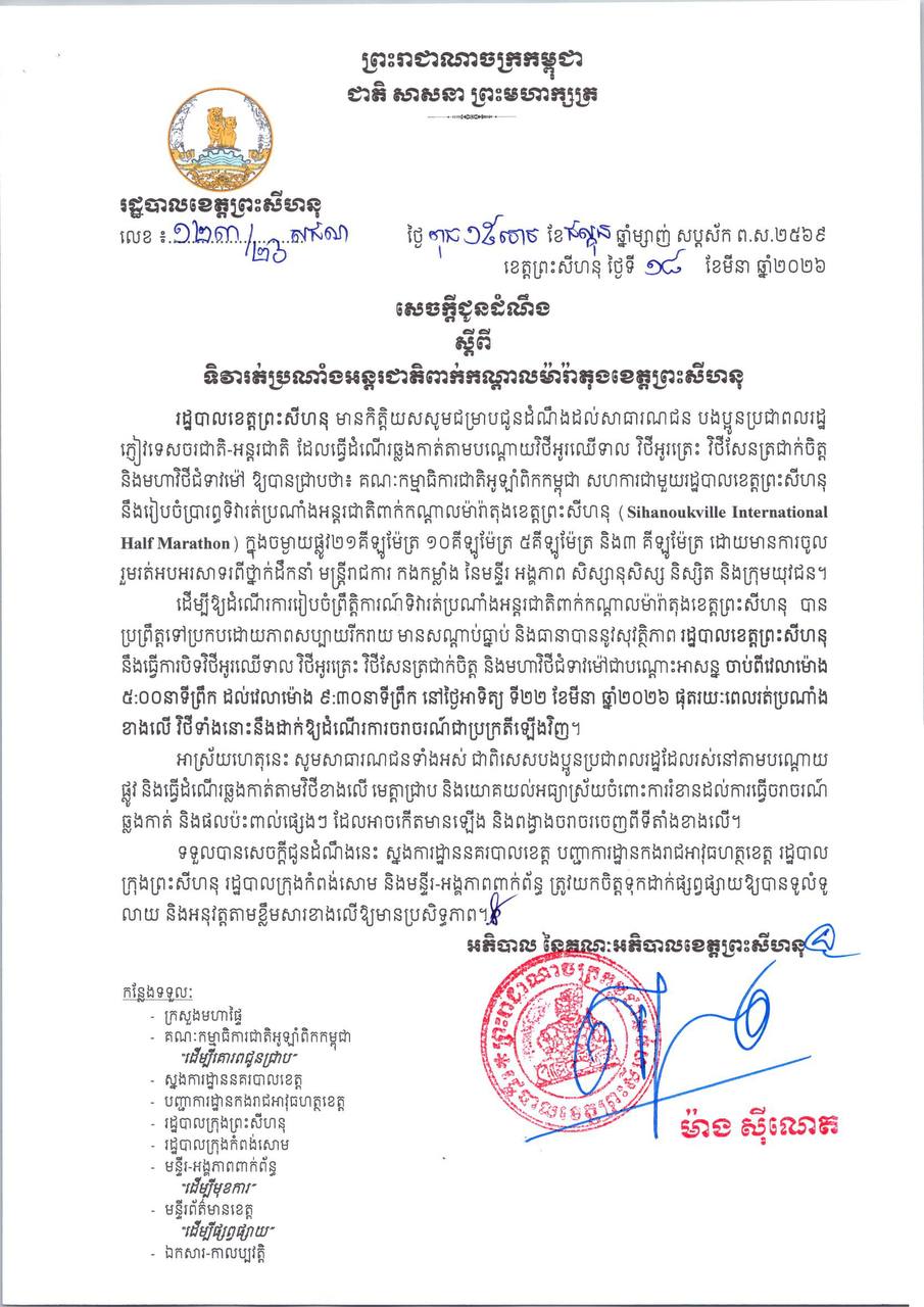 សេចក្តីជូនដំណឹង របស់រដ្ឋបាលខេត្តព្រះសីហនុ ស្តីពីទិវារត់ប្រណាំងអន្តរជាតិ ពាក់កណ្តាលម៉ារ៉ាតុងខេត្តព្រះសីហនុ.