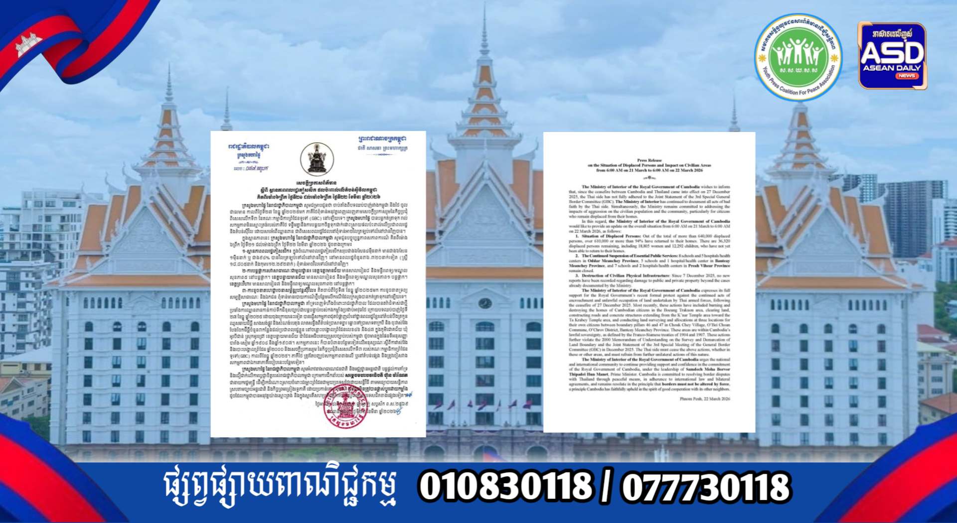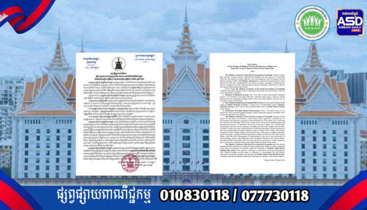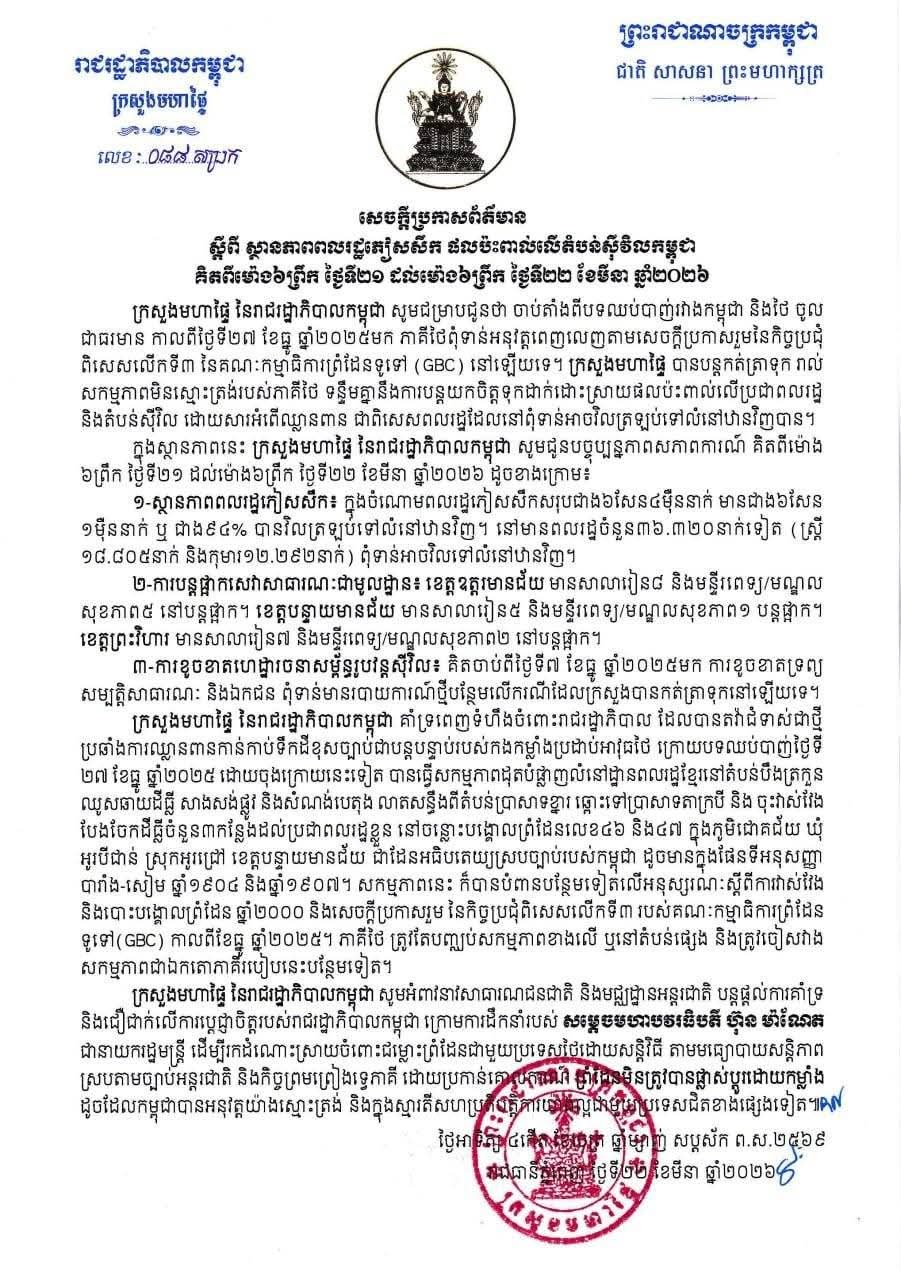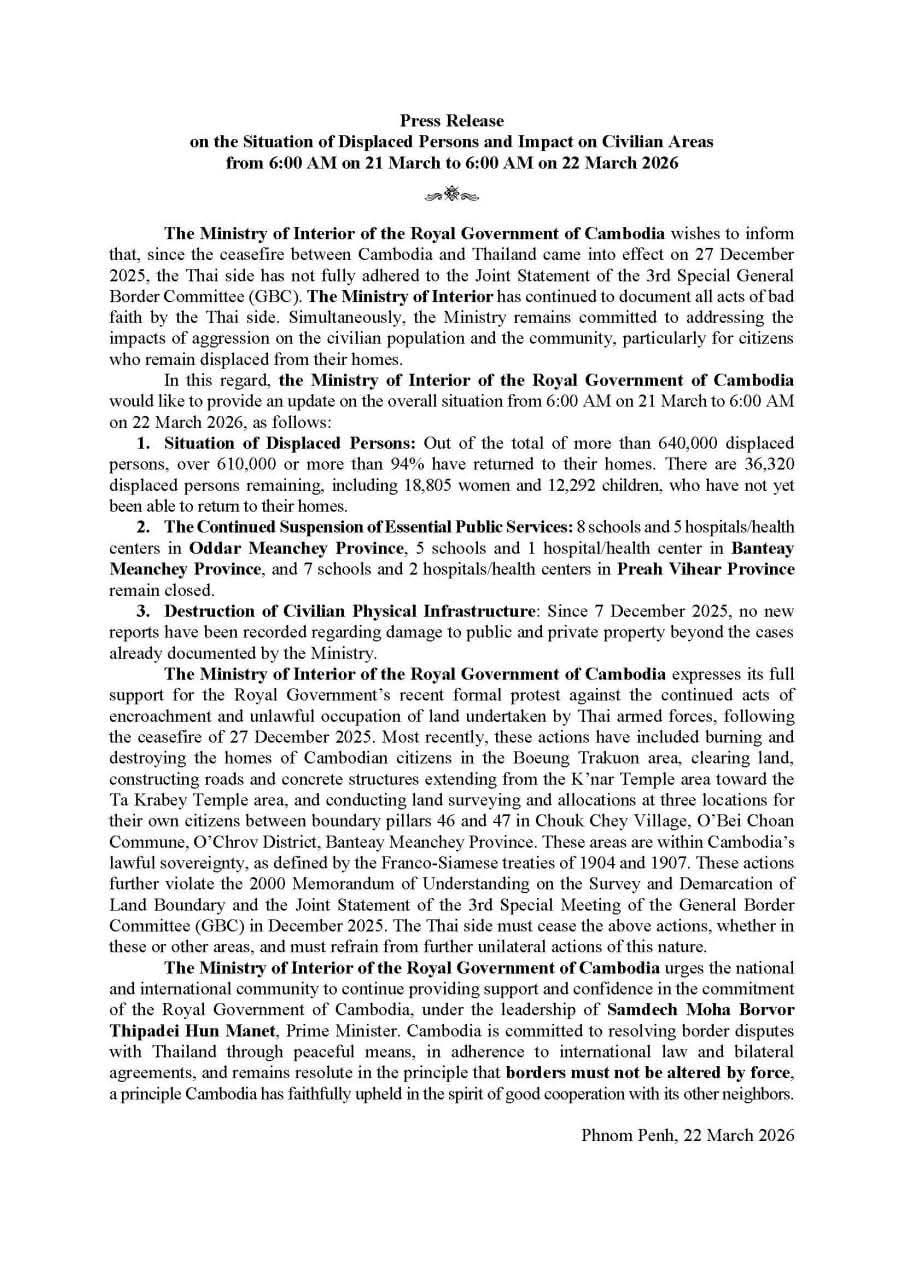 ក្រសួងមហាផ្ទៃ|សេចក្តីប្រកាសព័ត៌មាន ស្តីពី ស្ថានភាព ពលរដ្ឋភៀសសឹក និងផលប៉ះពាល់លើតំបន់ស៊ីវិល គិតត្រឹមព្រឹក ថ្ងៃទី២២ ខែមីនា ឆ្នាំ២០២៦ Press Release on the Situation of Displaced Persons and Impact on Civilian Areas as of the Morning of 22 March 2026.