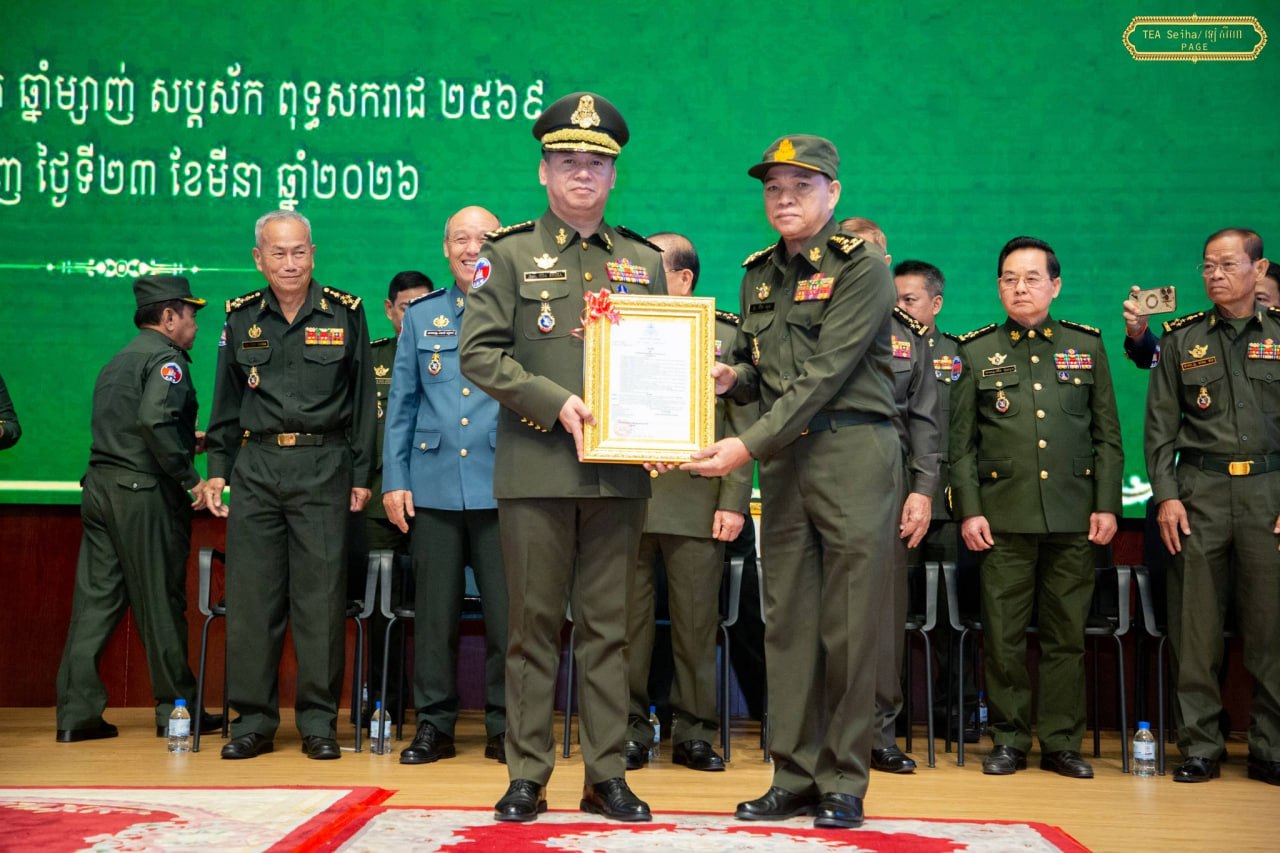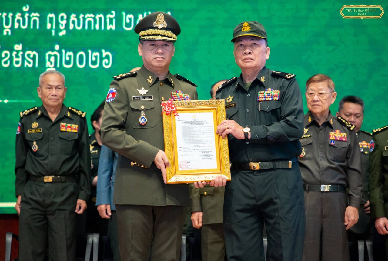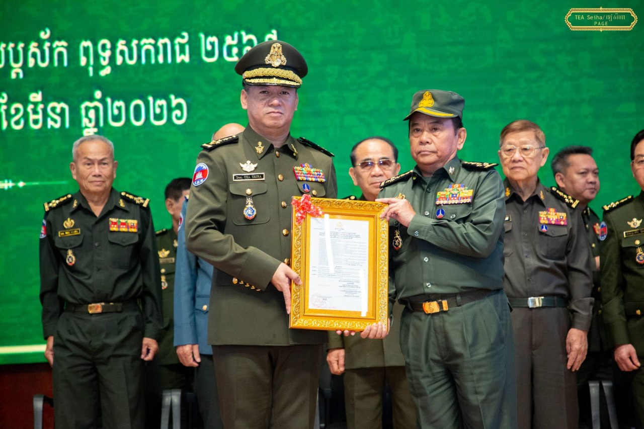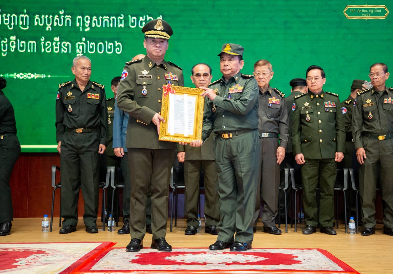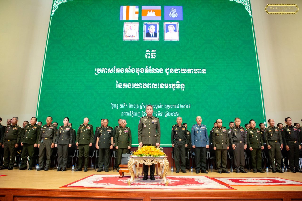 ឯកឧត្តម នាយឧត្តមសេនីយ៍ ទៀ សីហា ឧបនាយករដ្ឋមន្ត្រី រដ្ឋមន្ត្រីក្រសួងការពារជាតិ បានអញ្ជើញជាអធិបតី ក្នុងពិធីប្រកាសតែងតាំងមុខតំណែងនាយទាហាននៃកងយោធពលខេមរភូមិន្ទ ជូនឯកឧត្តម ឧត្តមសេនីយ៍ទាំង៥រូប ដែល ត្រូវបានតែងតាំងមុខតំណែងជារដ្ឋលេខាធិការ អនុរដ្ឋលេខាធិការ អគ្គនាយក អគ្គនាយកដ្ឋានសម្ភារៈបច្ចេកទេស និងនាយក នាយក-ដ្ឋានបុគ្គលិក ក្រសួងការពារជាតិ ដែលប្រព្រឹត្តទៅនៅទីស្ដីការក្រសួង