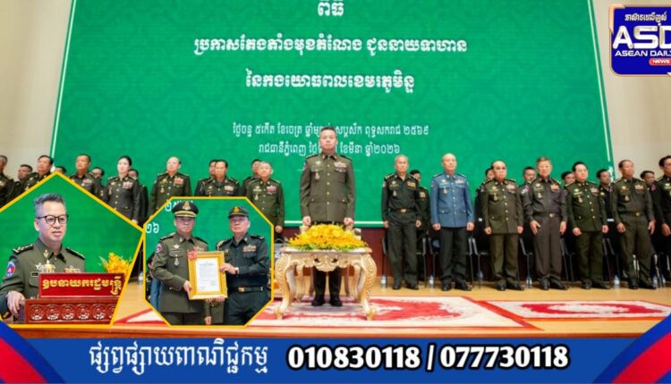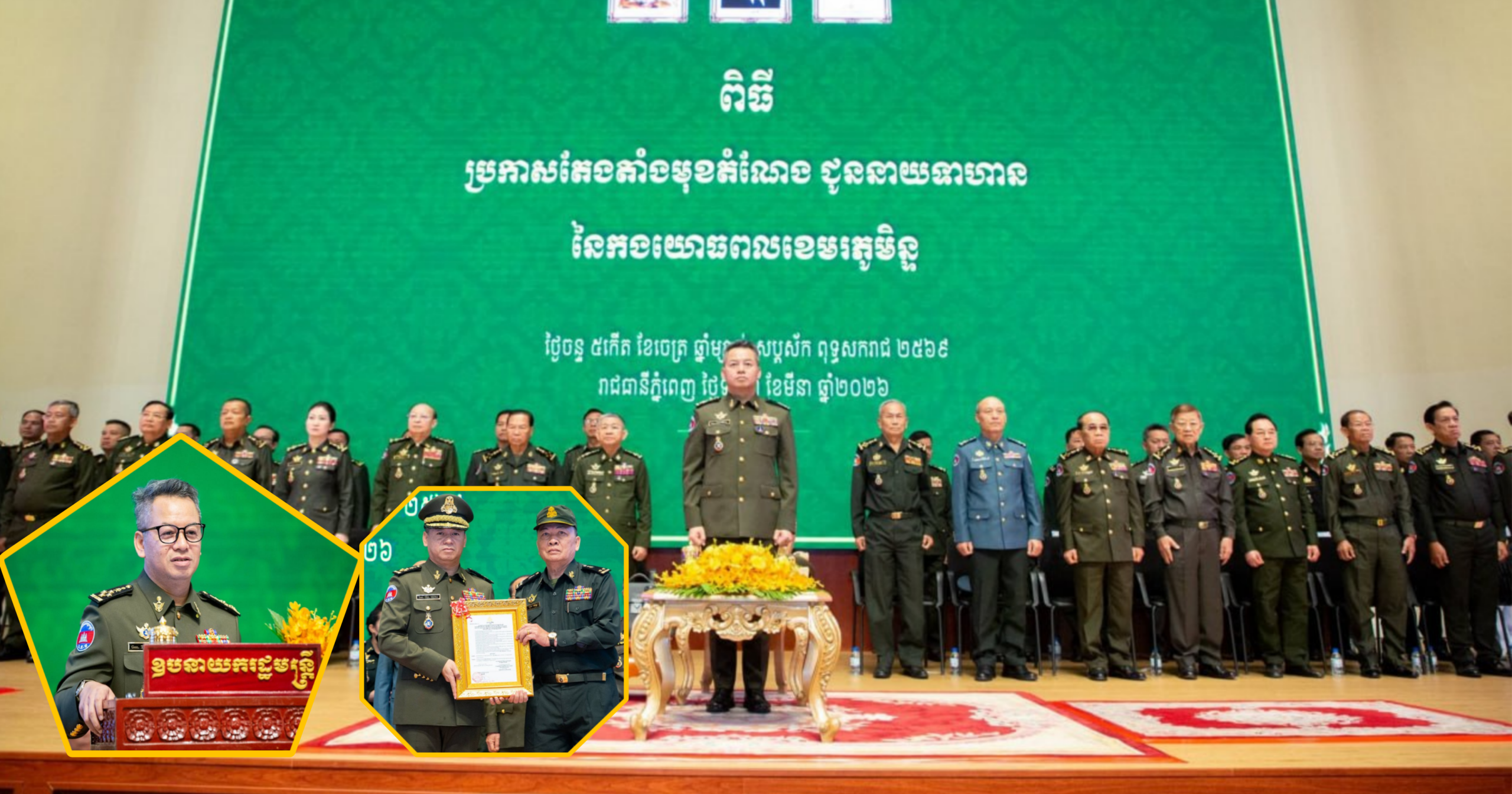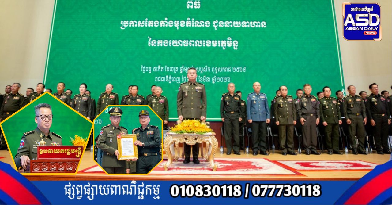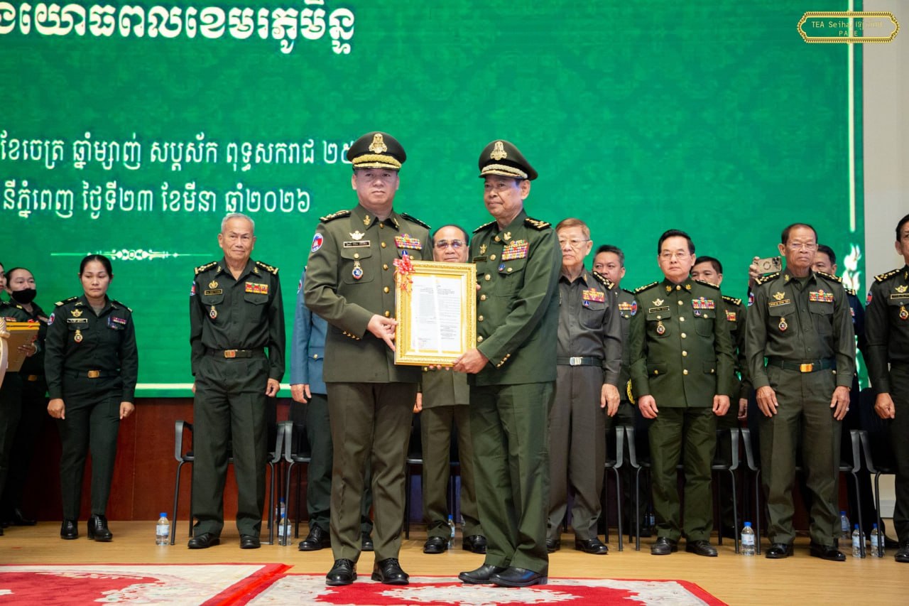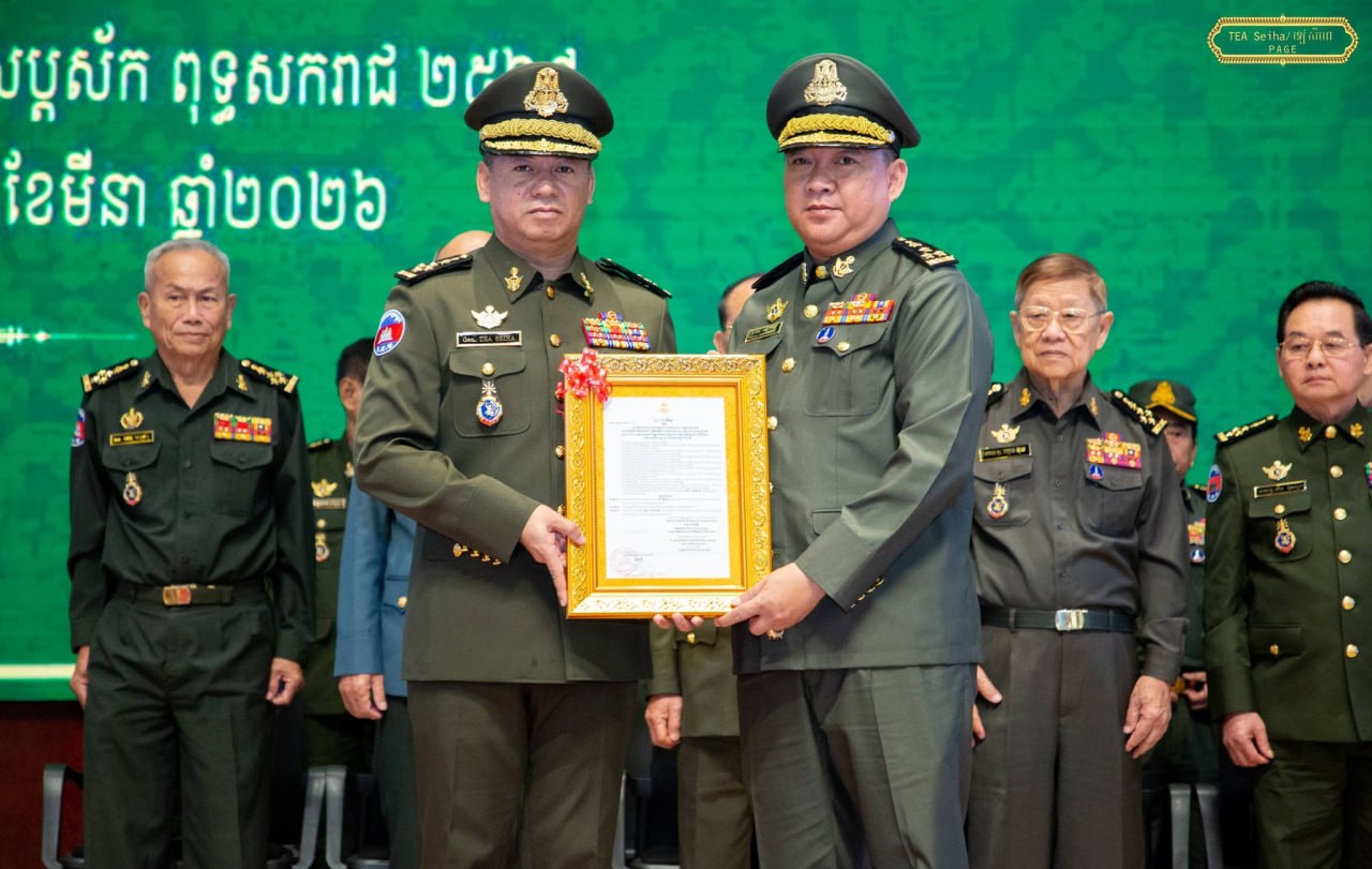 ឯកឧត្តម នាយឧត្តមសេនីយ៍ ទៀ សីហា ឧបនាយករដ្ឋមន្ត្រី រដ្ឋមន្ត្រីក្រសួងការពារជាតិ បានអញ្ជើញជាអធិបតី ក្នុងពិធីប្រកាសតែងតាំងមុខតំណែងនាយទាហាននៃកងយោធពលខេមរភូមិន្ទ ជូនឯកឧត្តម ឧត្តមសេនីយ៍ទាំង៥រូប ដែល ត្រូវបានតែងតាំងមុខតំណែងជារដ្ឋលេខាធិការ អនុរដ្ឋលេខាធិការ អគ្គនាយក អគ្គនាយកដ្ឋានសម្ភារៈបច្ចេកទេស និងនាយក នាយក-ដ្ឋានបុគ្គលិក ក្រសួងការពារជាតិ ដែលប្រព្រឹត្តទៅនៅទីស្ដីការក្រសួង