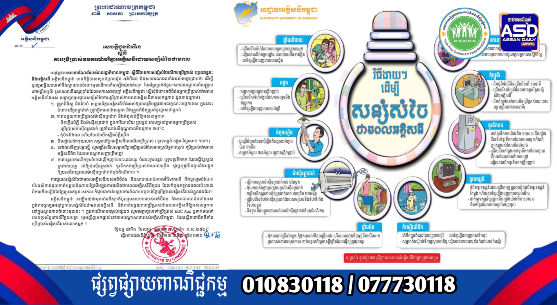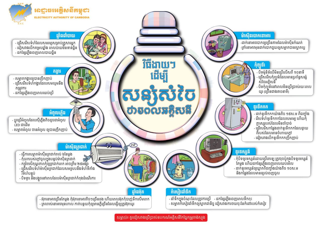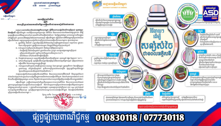 អគ្គិសនីកម្ពុជា អំពាវនាវដល់ប្រជាពលរដ្ឋ សូម ប្រើប្រាស់ឧបករណ៍បរិក្ខារអគ្គិសនី ដោយ សន្សំសំចៃថាមពល ក្នុងស្ថានភាពប្រេងឥន្ធនៈ ឡើងថ្លៃ និងអាកាសផាតុក្តៅ