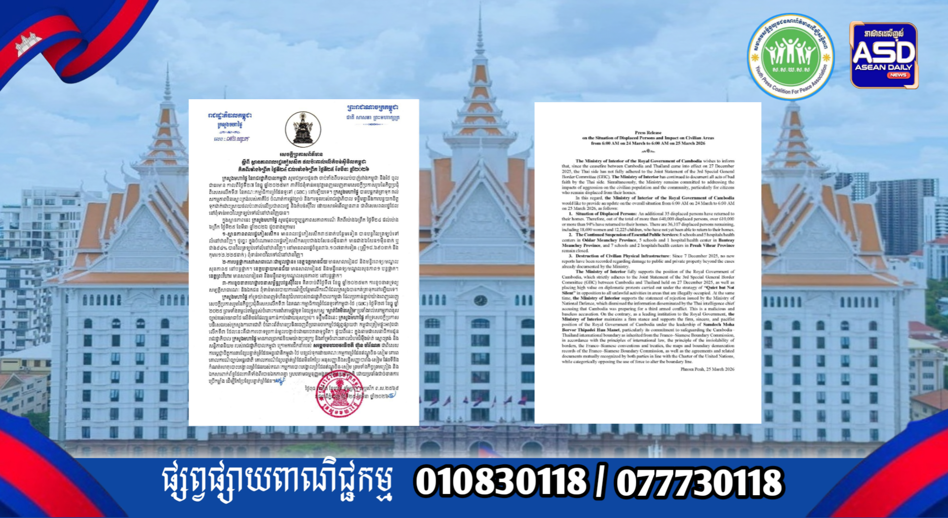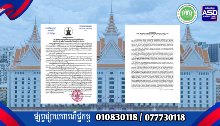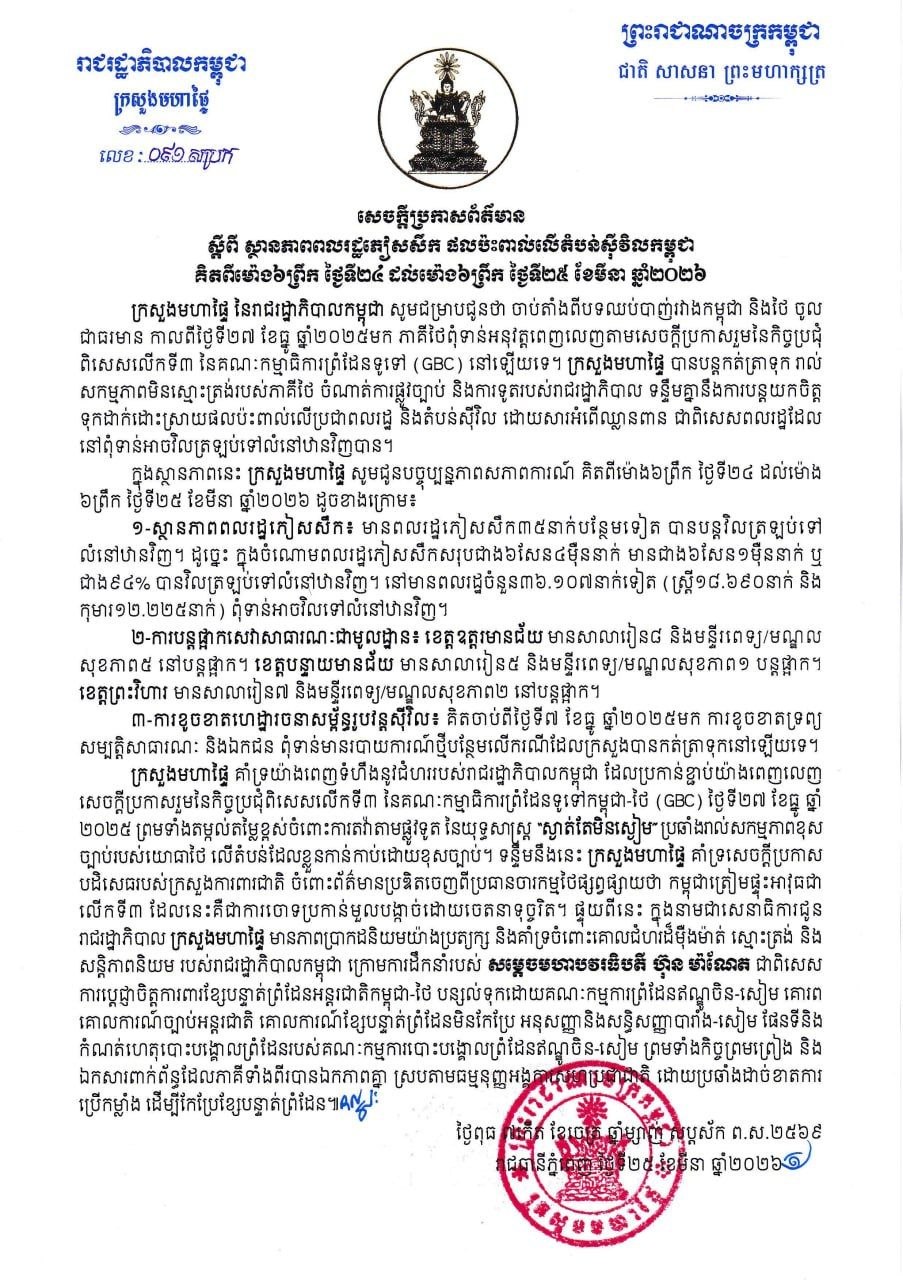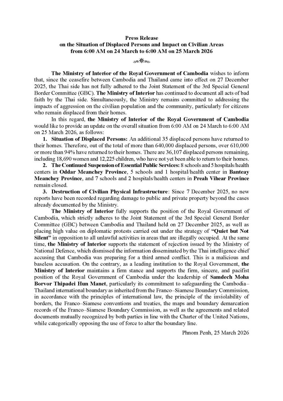 ក្រសួងមហាផ្ទៃ|សេចក្តីប្រកាសព័ត៌មាន ស្តីពីស្ថានភាពពលរដ្ឋភៀសសឹក និងផល ប៉ះពាល់លើតំបន់ស៊ីវិល គិតត្រឹមព្រឹក ថ្ងៃទី២៥ ខែមីនា ឆ្នាំ២០២៦។ Press Release on the Situation of Displaced Persons and Impact on Civilian Areas as of the Morning of 25 March 2026.