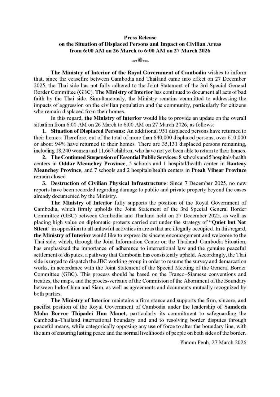ក្រសួងមហាផ្ទៃ|[English Below] សេចក្ដីប្រកាសព័ត៌មាន ស្ដីពី ស្ថានភាពពលរដ្ឋភៀសសឹក និងផលប៉ះពាល់លើតំបន់ស៊ីវិល គិតត្រឹមព្រឹក ថ្ងៃទី២៧ ខែមីនា ឆ្នាំ២០២៦។ Press Release on the Situation of Displaced Persons and Impact on Civilian Areas as of the Morning of 27 March 2026.