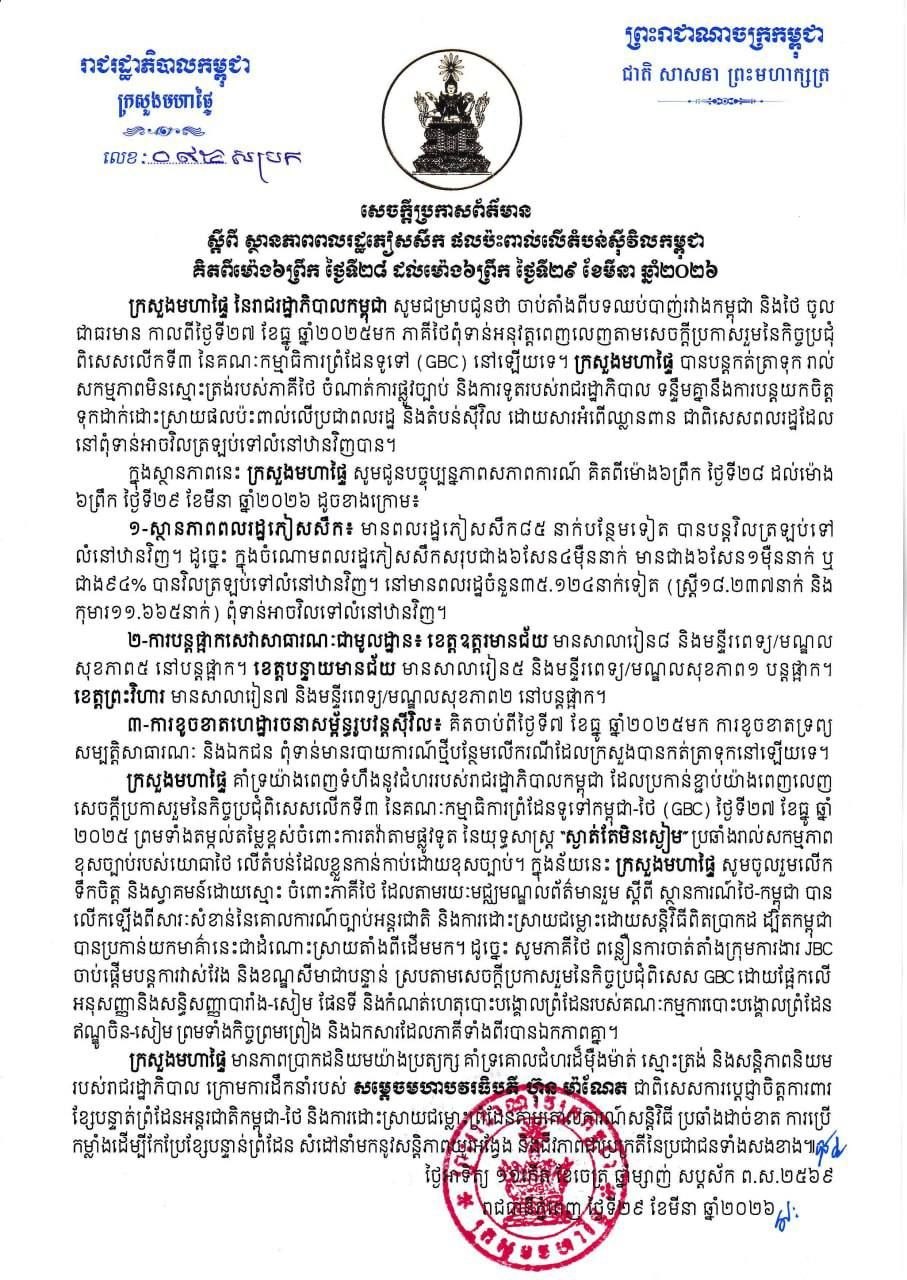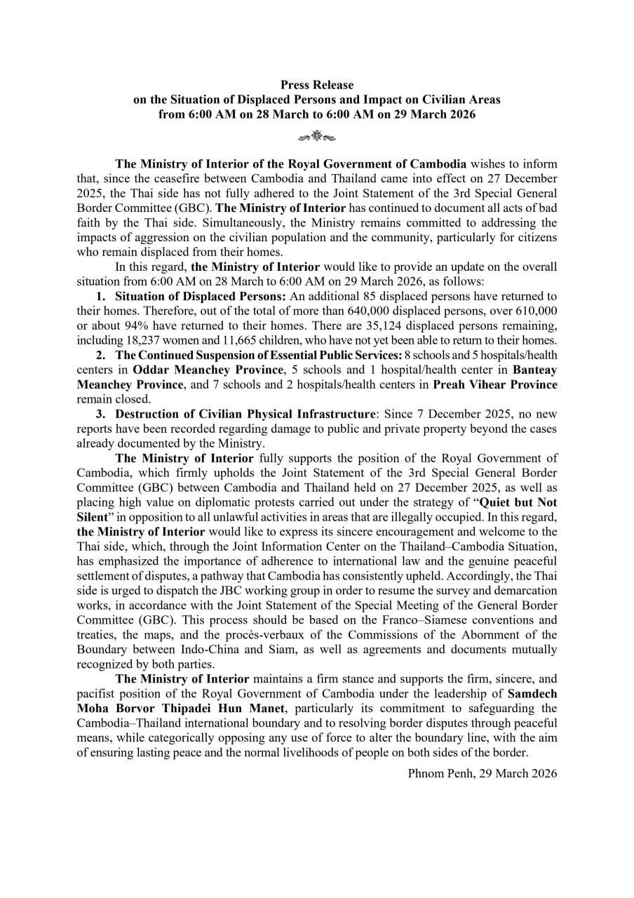 ក្រសួងមហាផ្ទៃ|[English Below] សេចក្តីប្រកាសព័ត៌មាន ស្តីពីស្ថានភាពពលរដ្ឋភៀសសឹក និងផល ប៉ះពាល់លើតំបន់ស៊ីវិល គិតត្រឹមព្រឹក ថ្ងៃទី២៩ ខែមីនា ឆ្នាំ២០២៦។ Press Release on the Situation of Displaced Persons and Impact on Civilian Areas as of the Morning of 29 March 2026.