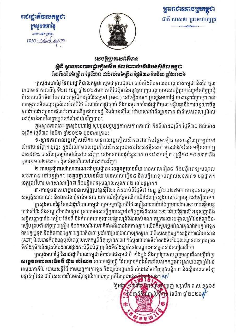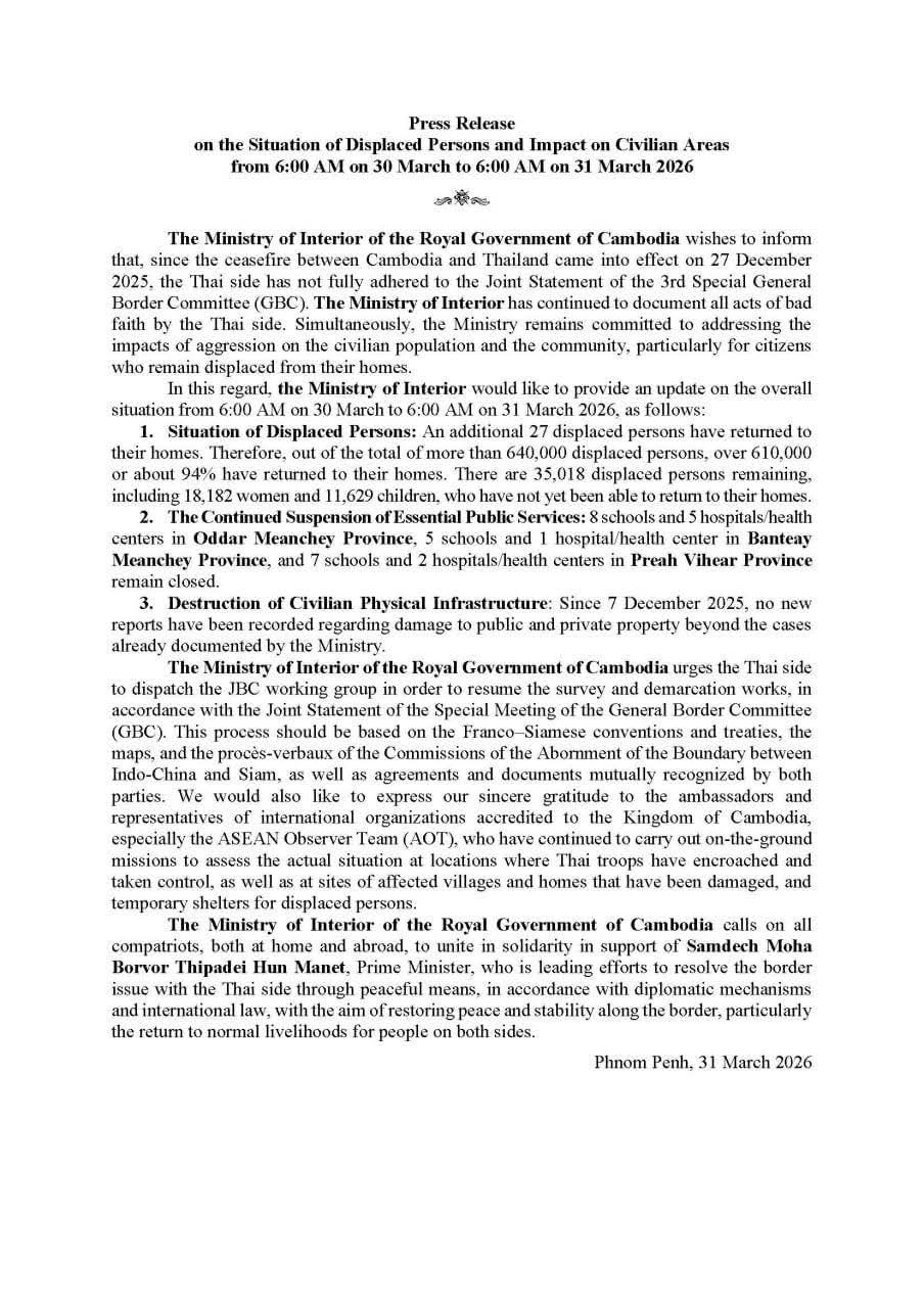 ក្រសួង​មហាផ្ទៃ​|[English Below] សេចក្តីប្រកាសព័ត៌មាន ស្តីពីស្ថានភាព ពលរដ្ឋភៀសសឹក និងផលប៉ះពាល់លើតំបន់ស៊ីវិល គិតត្រឹមព្រឹក ថ្ងៃទី៣១ ខែមីនា ឆ្នាំ២០២៦។ Press Release on the Situation of Displaced Persons and Impact on Civilian Areas as of the Morning of 31 March 2026.