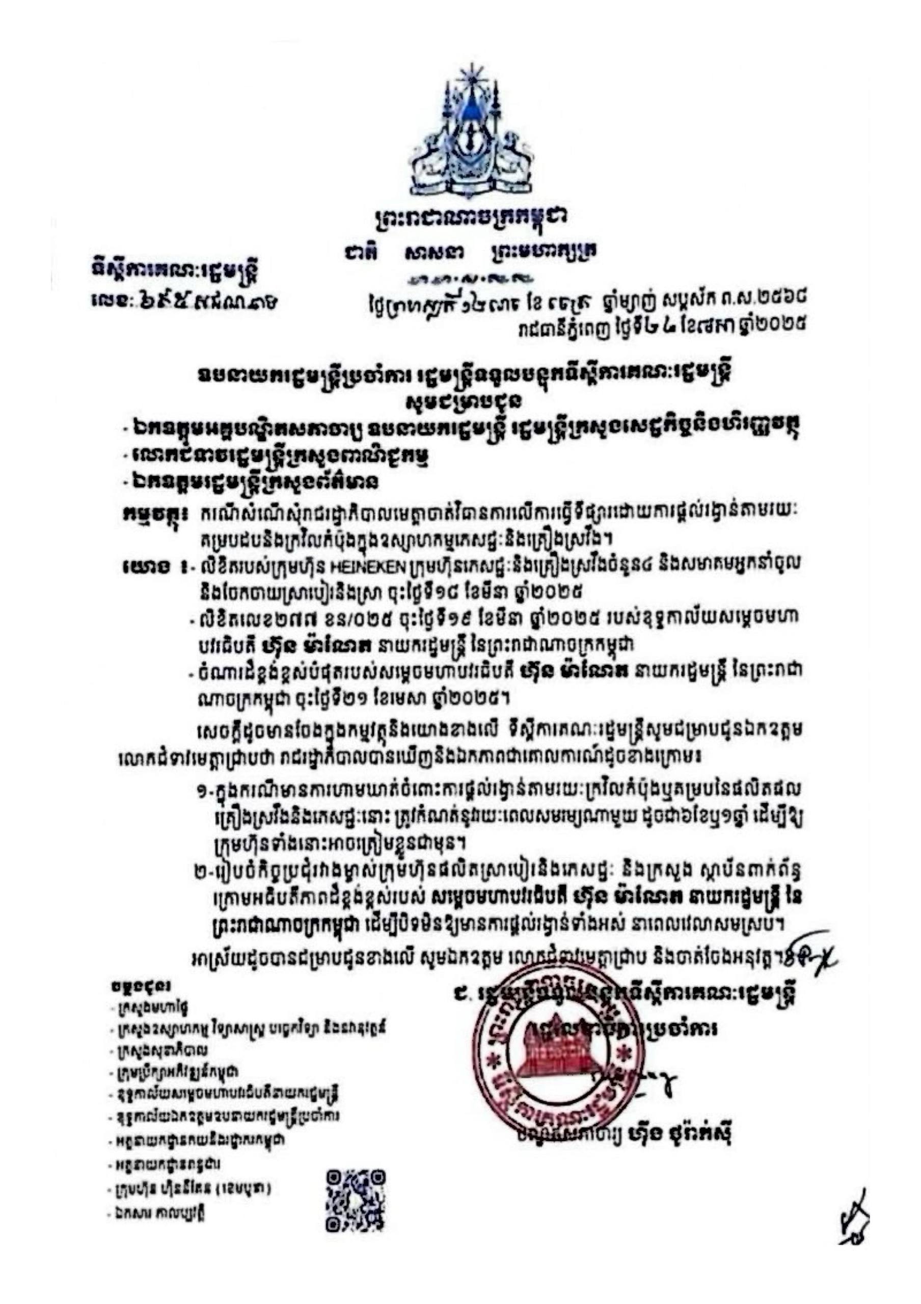 សម្តេចធិបតី ហ៊ុន ម៉ាណែត បានសម្រេចជាគោលការណ៍ឱ្យ ហាមឃាត់ការដាក់រង្វាន់ តាមក្រវិលកំប៉ុង ឬ គម្របដបគ្រឿងស្រវឹង​ ការសម្រេចនេះចាប់តាំងពី ខែមេសា​ ឆ្នាំ២០២៥​ មកម្ល៉េះ។