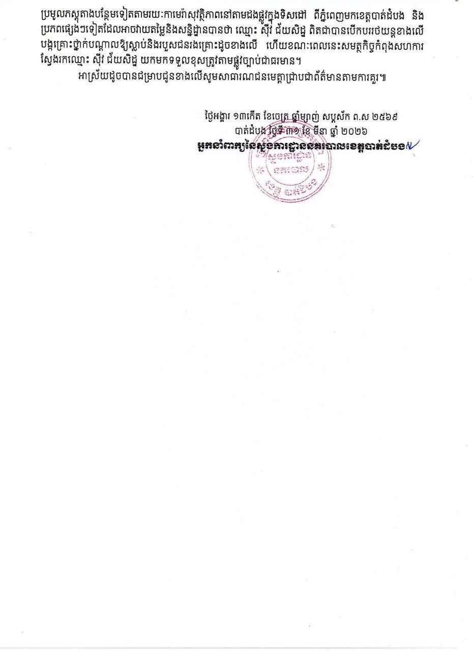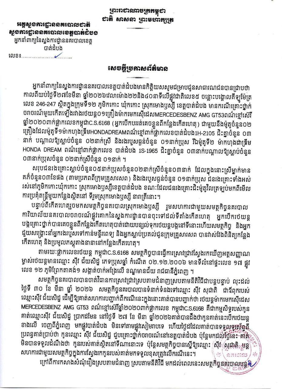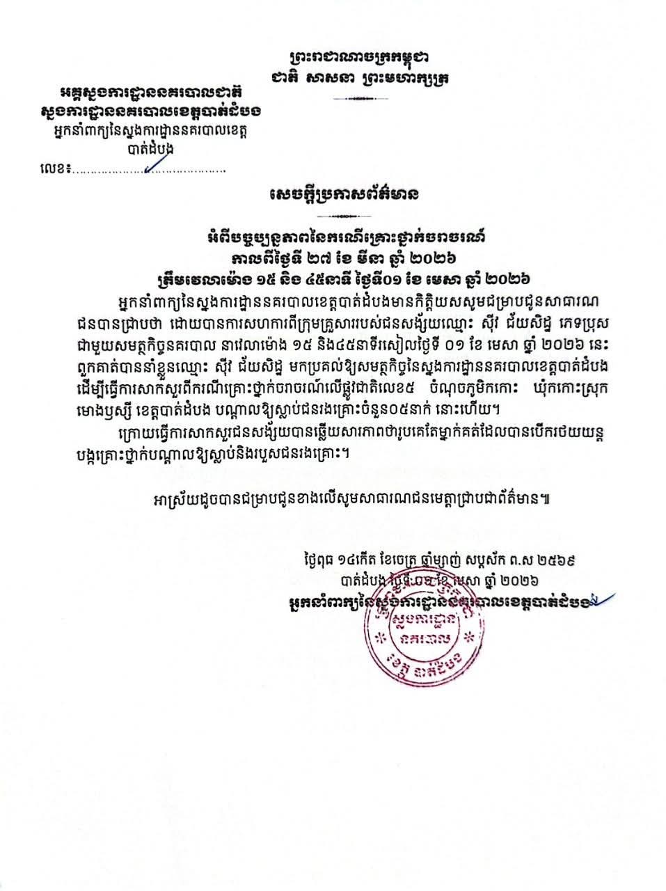 សូមបញ្ជាក់ថាសោកនាដកម្មគ្រោះថ្នាក់ចរាចរណ៍ដែលបង្កឡេីងដោយជនបង្កកេីតឡេីងនៅយប់ថ្ងៃទី២៧ ខែមីនា ឆ្នាំ២០២៦ ក្នុងស្រុកមោង ឫស្សី ខេត្តបាត់ដំបងកាលពីពេលកន្លងទៅថ្មីនេះ។