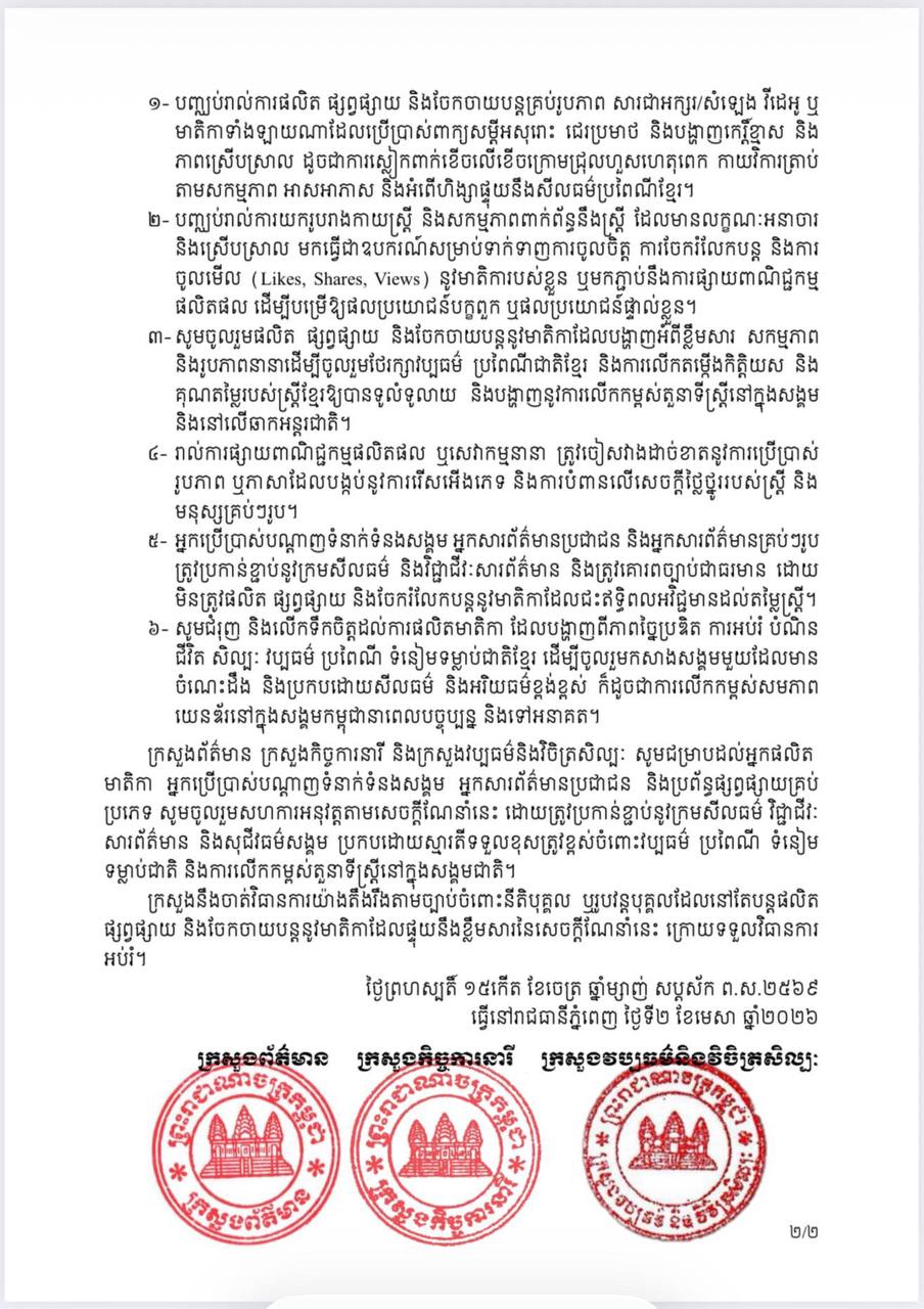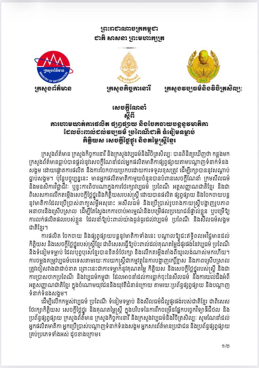 ក្រសួង ៣ រួមគ្នាចេញសេចក្តីណែនាំ ស្តីពីការ ហាមឃាត់ការផលិត ផ្សព្វផ្សាយ និងចែកចាយ បន្តនូវមាតិកា ដែលប៉ះពាល់ដល់វប្បធម៌ ប្រពៃណីជាតិ ទំនៀមទម្លាប់ កិត្តិយស សេចក្តី ថ្លៃថ្នូរ និងតម្លៃស្ត្រីខ្មែរ