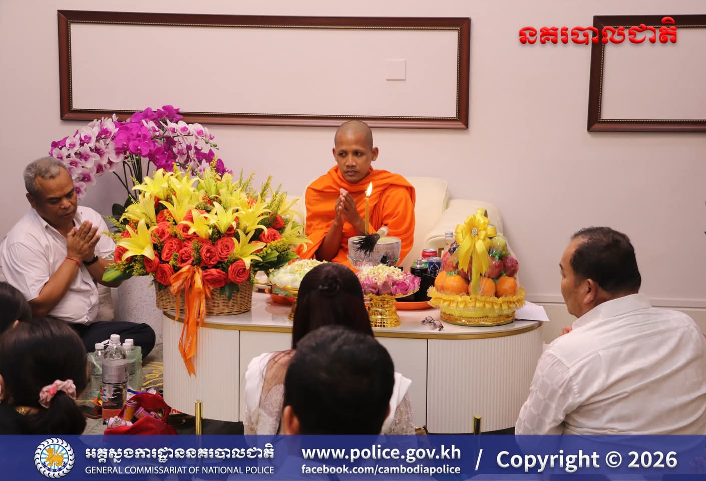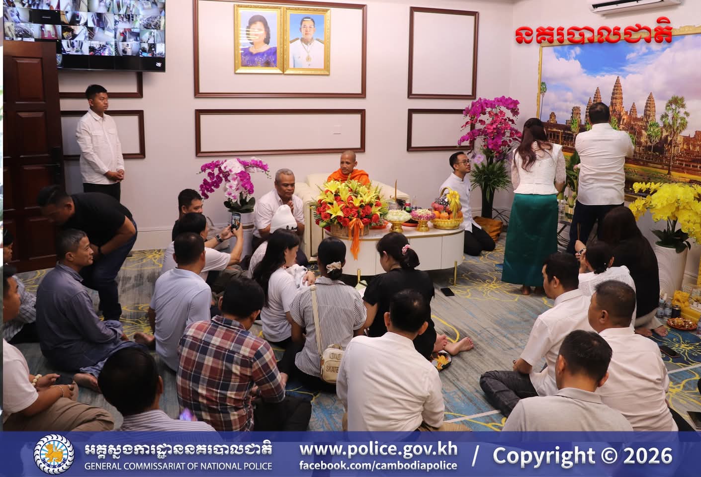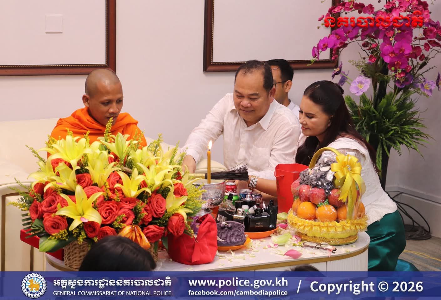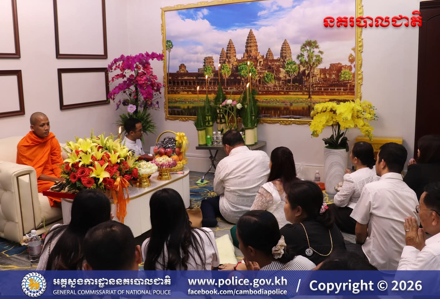 (រាជធានីភ្នំពេញ)៖ ក្នុងបរិយាកាសរីករាយនៃការត្រៀមអបអរសាទរ ពិធីបុណ្យចូលឆ្នាំថ្មីប្រពៃណីជាតិខ្មែរខាងមុខនេះ នាសៀល ថ្ងៃទី០១ ខែមេសា ឆ្នាំ២០២៦នេះ ឯកឧត្តម ឧត្តមសេនីយ៍ឯក ឃីង សារ៉ាត់ នាយកមន្ទីរប្រឆាំងបទល្មើសគ្រឿងញៀននិង លោកជំទាវ ឆាយ សាលីន បាននិមន្តព្រះអង្គធម្មវនរាសី ចន្ទមុន្នី ដើម្បីសូត្រមន្ត លើករាសី និងសុំសេចក្តីសុខសិរីសួស្តី ជ័យមង្គល ដល់ថ្នាក់ដឹកនាំនិងមន្ត្រីនៃមន្ទីរប្រឆាំងបទល្មើសគ្រឿងញៀន និង បានឧទ្ទិសកុសលផលបុណ្យទាំងឡាយ ជូនចំពោះដួងវិញ្ញាណក្ខន្ធ នៃកងកម្លាំងនគរបាលមន្ទីរប្រឆាំងបទល្មើសគ្រឿងញៀនដែល បានពលីដើម្បីបុព្វហេតុជាតិមាតុភូមិផងដែរ។