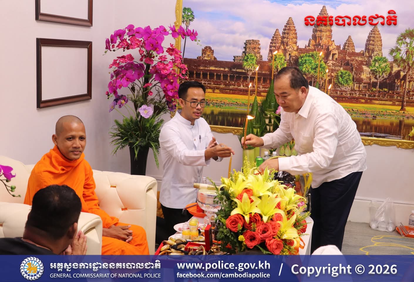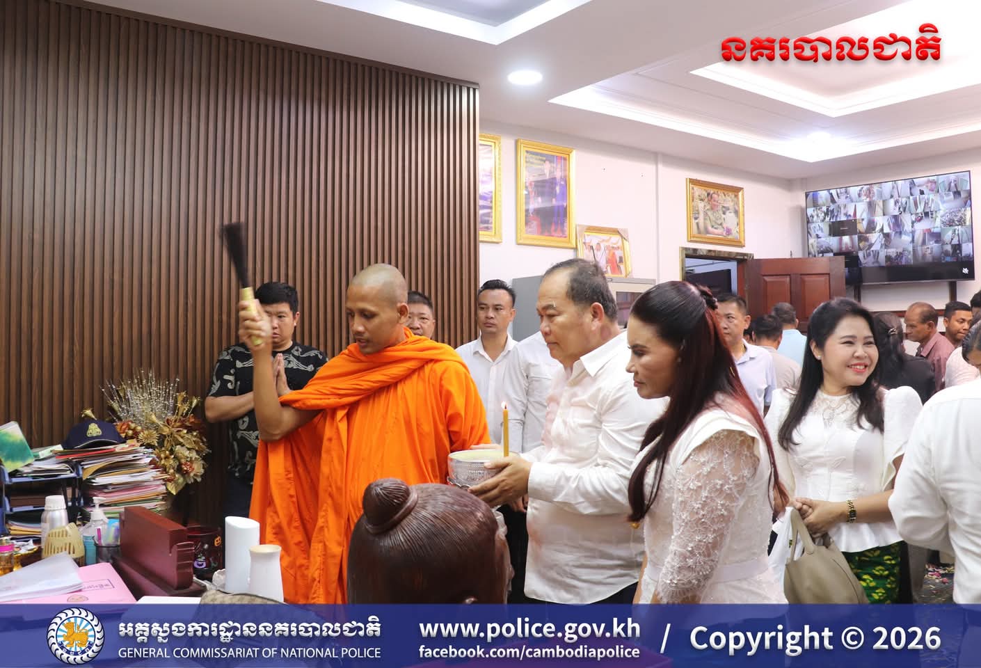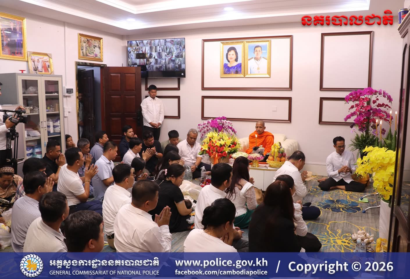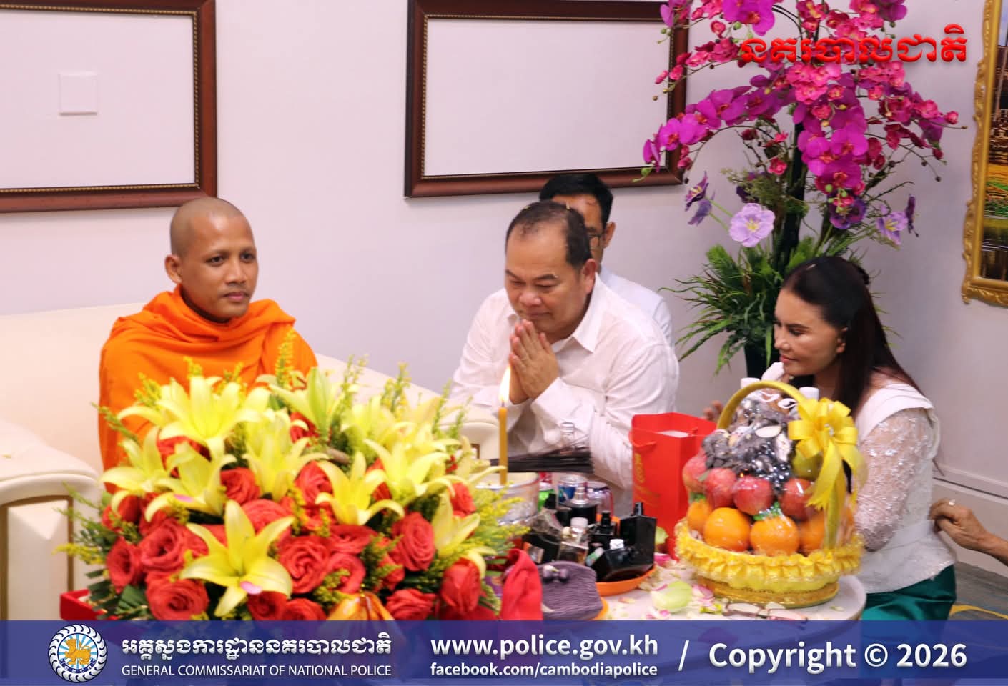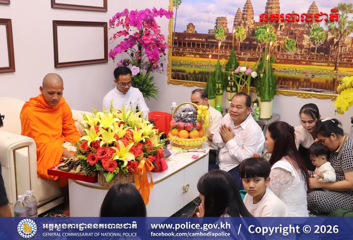 (រាជធានីភ្នំពេញ)៖ ក្នុងបរិយាកាសរីករាយនៃការត្រៀមអបអរសាទរ ពិធីបុណ្យចូលឆ្នាំថ្មីប្រពៃណីជាតិខ្មែរខាងមុខនេះ នាសៀល ថ្ងៃទី០១ ខែមេសា ឆ្នាំ២០២៦នេះ ឯកឧត្តម ឧត្តមសេនីយ៍ឯក ឃីង សារ៉ាត់ នាយកមន្ទីរប្រឆាំងបទល្មើសគ្រឿងញៀននិង លោកជំទាវ ឆាយ សាលីន បាននិមន្តព្រះអង្គធម្មវនរាសី ចន្ទមុន្នី ដើម្បីសូត្រមន្ត លើករាសី និងសុំសេចក្តីសុខសិរីសួស្តី ជ័យមង្គល ដល់ថ្នាក់ដឹកនាំនិងមន្ត្រីនៃមន្ទីរប្រឆាំងបទល្មើសគ្រឿងញៀន និង បានឧទ្ទិសកុសលផលបុណ្យទាំងឡាយ ជូនចំពោះដួងវិញ្ញាណក្ខន្ធ នៃកងកម្លាំងនគរបាលមន្ទីរប្រឆាំងបទល្មើសគ្រឿងញៀនដែល បានពលីដើម្បីបុព្វហេតុជាតិមាតុភូមិផងដែរ។