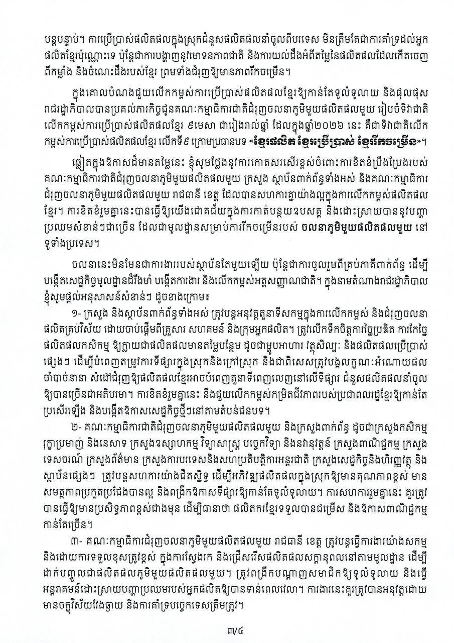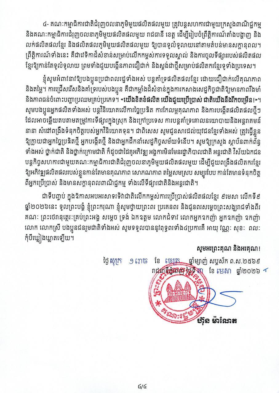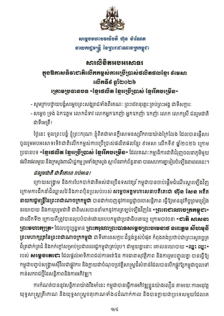 សម្តេចបវរធិបតី ហ៊ុន ម៉ាណែត ចេញសារលិខិត អបអរសាទរ ក្នុងឱកាសទិវាជាតិលើកកម្ពស់ ការប្រើប្រាស់ផលិតផលខ្មែរ ៩មេសា លើកទី៩ ឆ្នាំ២០២៦ ក្រោមប្រធានបទ «ខ្មែរផលិត ខ្មែរ ប្រើប្រាស់ ខ្មែររីកចម្រើន»