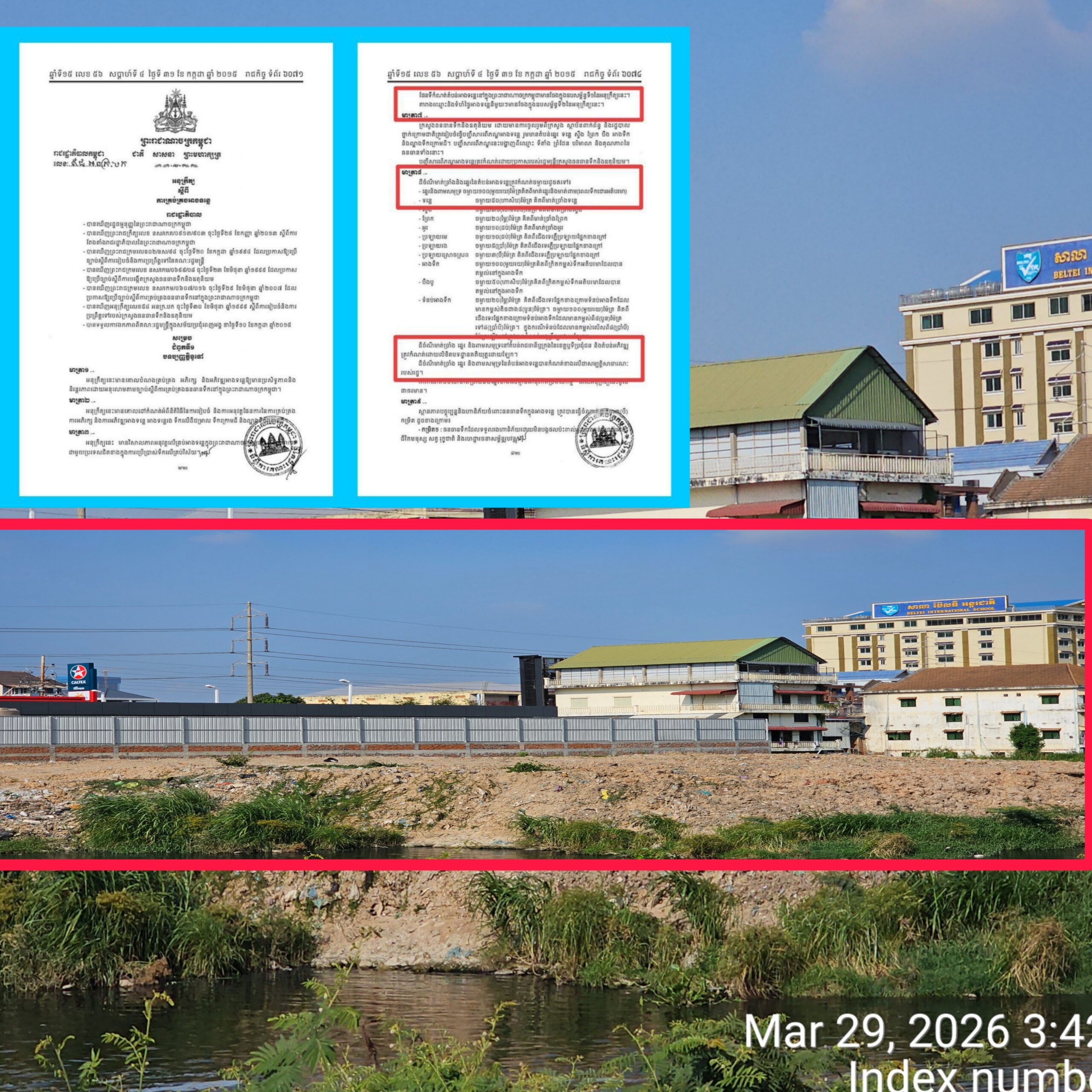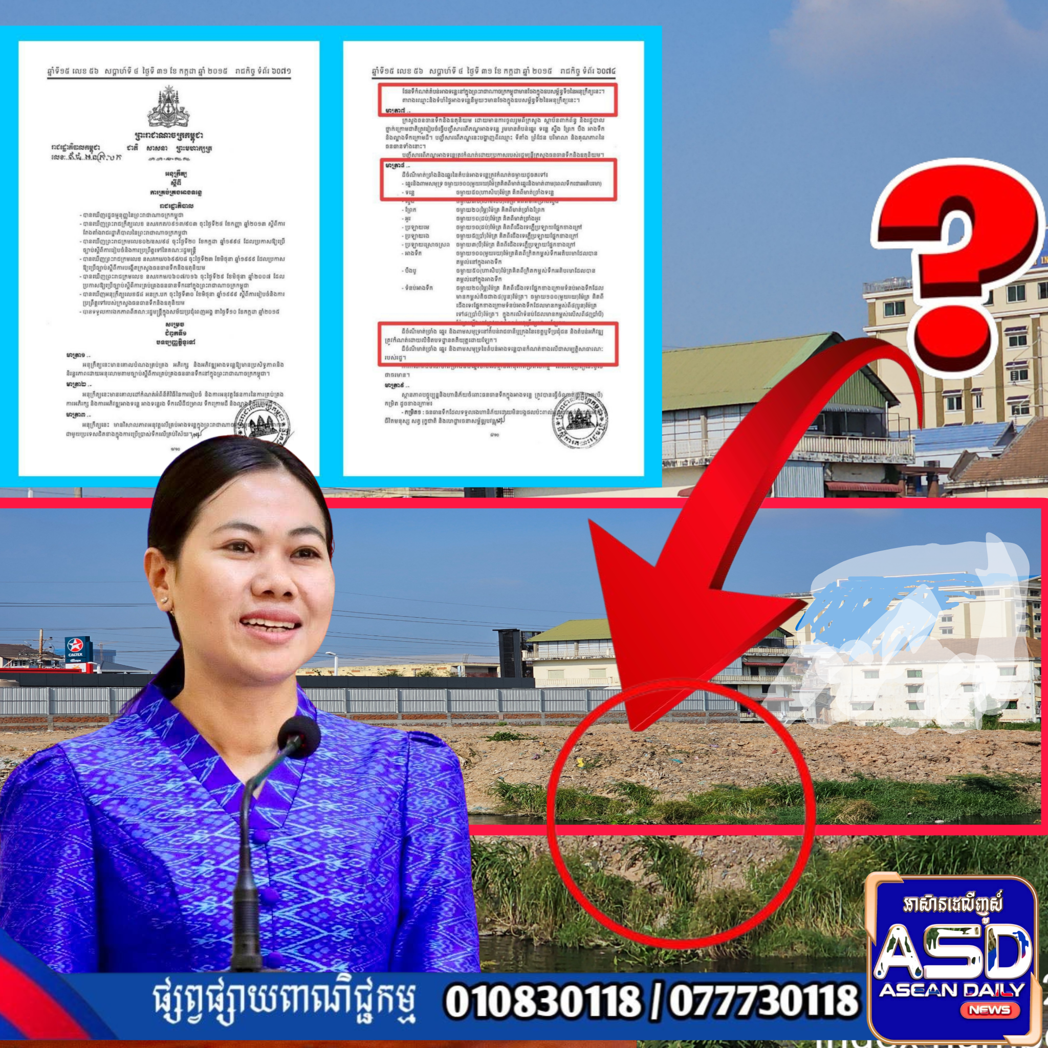 អង្គភាពសារព័ត៌មានយើងស្នើសុំឯកឧត្តមឧបនាយករដ្ឋមន្ត្រី សាយ សំអាល់ រដ្ឋមន្ត្រី រៀបចំដែនដី នគរូបនីយកម្ម និងសំណង់រាជធានីភ្នំពេញ សូមមេត្តាជួយបើកបង្ហាញ ម្ចាស់កម្មសិទ្ធិអចលនទ្រព្យ ដែលចាក់ដីចូលមាត់ច្រាំងទន្លេ សាងសង់សំណង់រឹងបុកគ្រឹះ រំលោភបំពានដីមាត់ច្រាំងទន្លេ ដែលមានទីតាំងខាងលើ ថាមានប្លង់ស្របច្បាប់ឬមួយយ៉ាងណា ? ហើយដីនោះមានទទឹងនិងបណ្តោយប៉ុន្មានម៉ែត្រ ដោយក្តីអនុគ្រោះ ។