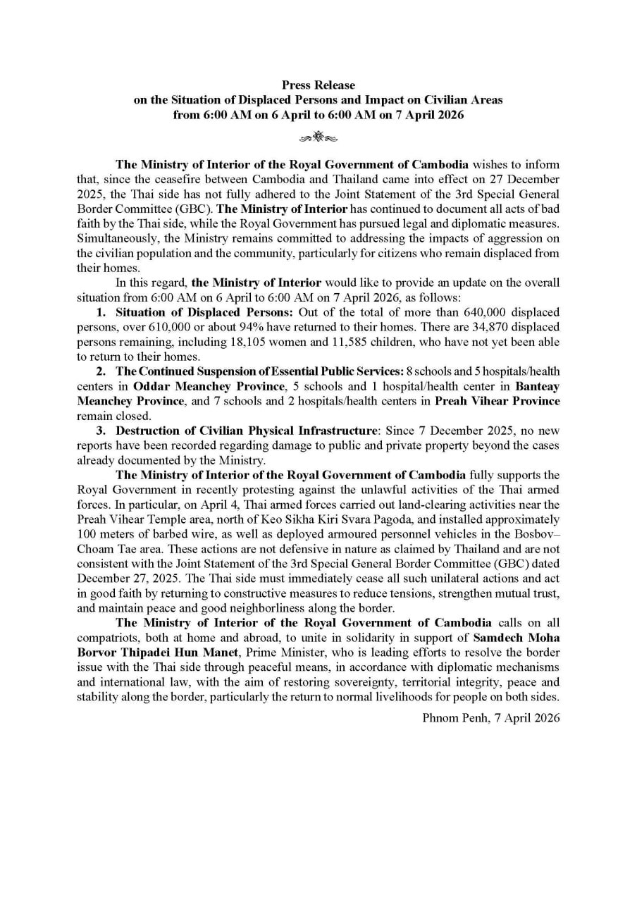 ក្រសួងមហាផ្ទៃ|[English Below] សេចក្តីប្រកាសព័ត៌មាន ស្តីពីស្ថានភាពពលរដ្ឋភៀសសឹក និងផល ប៉ះពាល់លើតំបន់ស៊ីវិល គិតត្រឹមព្រឹកថ្ងៃទី៧ ខែមេសា ឆ្នាំ២០២៦។ Press Release on the Situation of Displaced Persons and Impact on Civilian Areas as of the Morning of 7 April 2026.