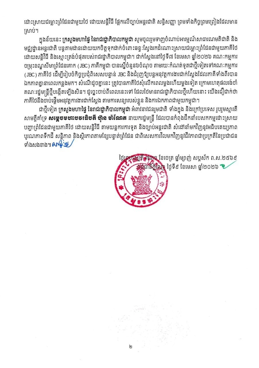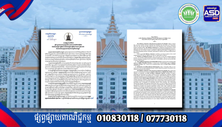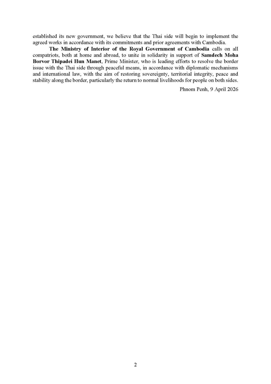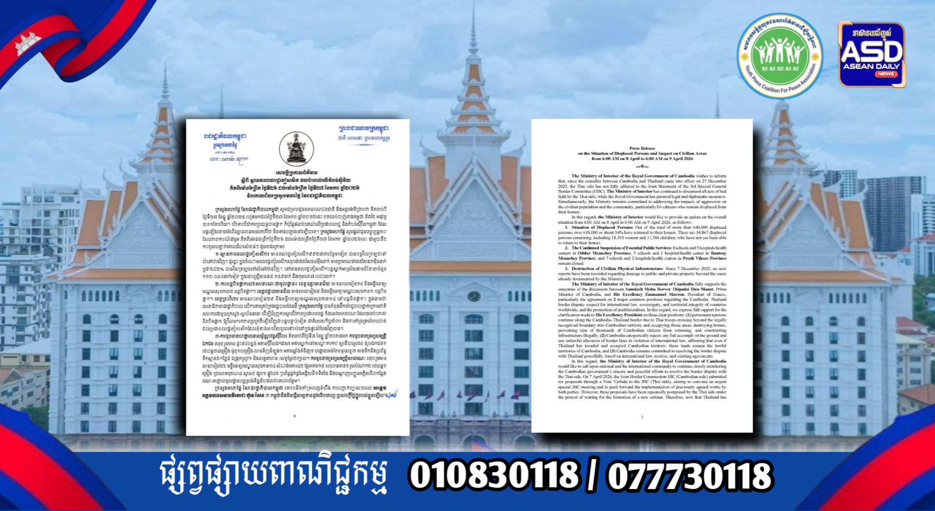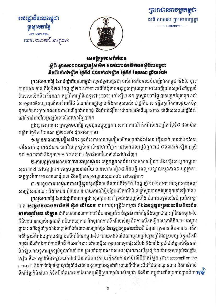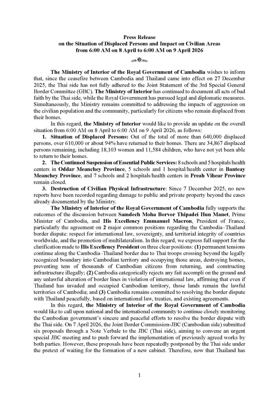 ក្រសួងមហាផ្ទៃ|[English Below] សេចក្តីប្រកាសព័ត៌មាន ស្តីពីស្ថានភាពពលរដ្ឋភៀសសឹក និងផល ប៉ះពាល់លើតំបន់ស៊ីវិល គិតត្រឹមព្រឹកថ្ងៃទី៩ ខែមេសា ឆ្នាំ២០២៦។ Press Release on the Situation of Displaced Persons and Impact on Civilian Areas as of the Morning of 9 April 2026.