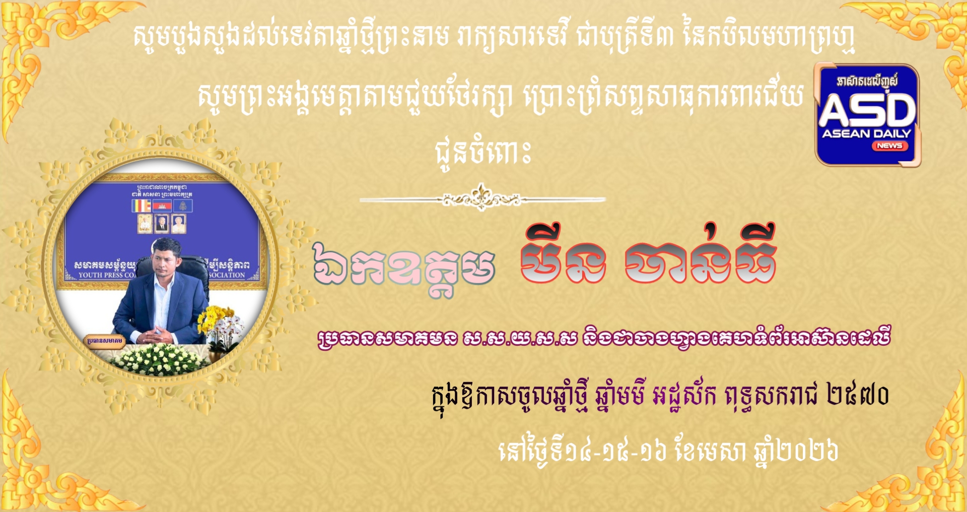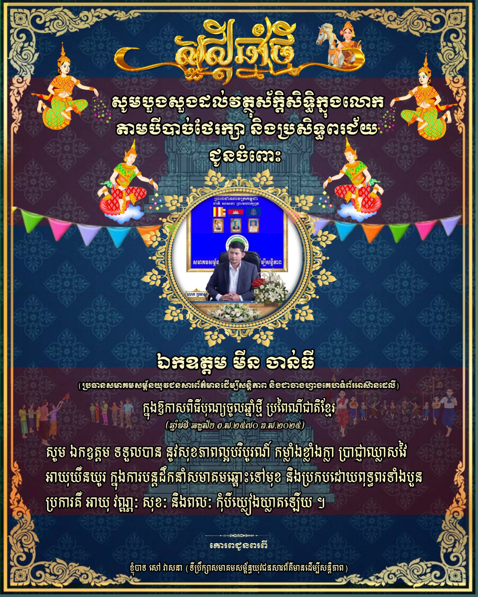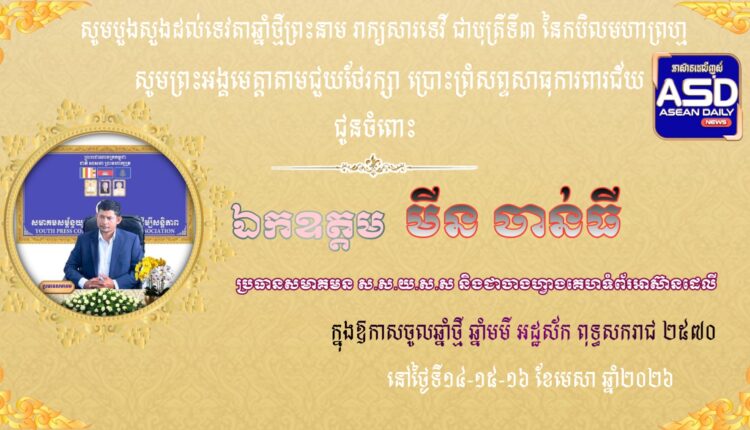 សារលិខិតជូនពរ ឯកឧត្តម មីន ចាន់ធី ប្រធានសមាគមសម្ព័ន្ធយុវជនសារព័ត៌មានដើម្បីសន្តិភាព និងចាងហ្វាងគេហទំព័រអាស៊ានដេលេី ក្នុងឱកាសពិធីបុណ្យចូលឆ្នាំថ្មី ប្រពៃណីជាតិខ្មែរ ឆ្នាំមមី អដ្ឋស័កព.ស ២៥៧០ ដែលនឹងឈានចូល មកដល់នាពេលខាងមុខនេះ