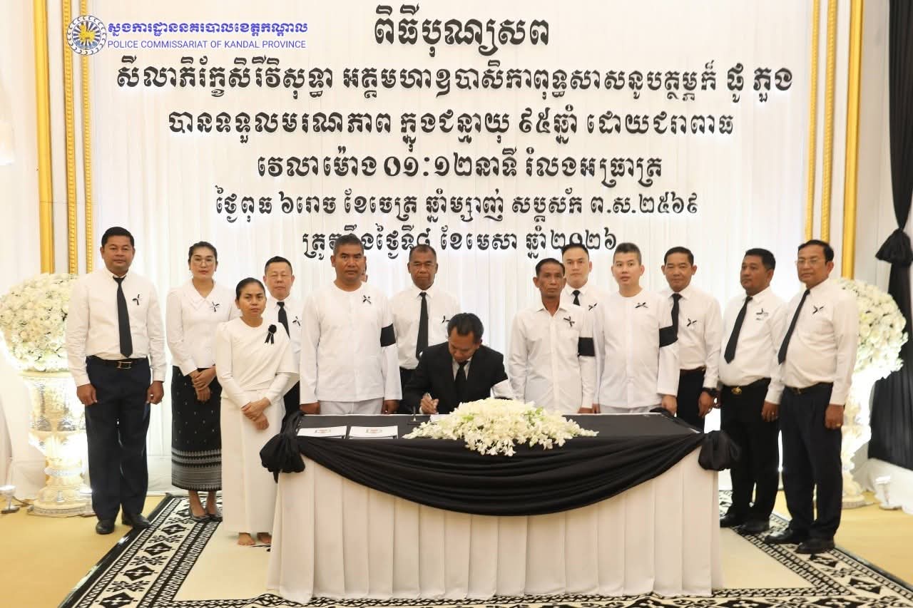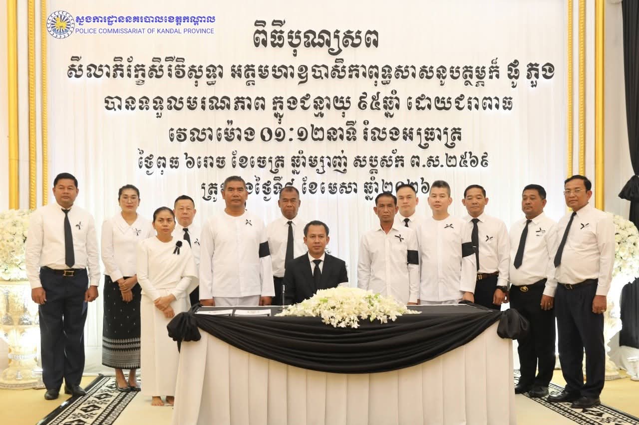 លោកឧត្តមសេនីយ៍ទោ ឈឿន សុចិត្ត ស្នងការនគរបាលខេត្តកណ្តាលបានដឹកនាំប្រតិភូនៃស្នងការដ្ឋាននគរបាលខេត្តកណ្តាល អញ្ជើញចូលរួមគោរពវិញ្ញាណក្ខន្ធសពសីលាភិរ័ក្ខសិរីវិសុទ្ធា អគ្គមហាឧបាសិកាពុទ្ធសាសនូបត្ថម្ភក៍ ផូ ភួង ត្រូវជាម្តាយបង្កើតរបស់ ឯកឧត្តម នាយឧត្តមសេនីយ៍ ស ថេត អគ្គស្នងការនគរបាលជាតិ ដែលបានទទួលមរណភាពកាលពីថ្ងៃពុធ ៦រោច ខែចេត្រ ឆ្នាំម្សាញ់ សប្តស័ក ព.ស.២៥៦៩ ត្រូវនឹងថ្ងៃទី៨ ខែមេសា ឆ្នាំ២០២៦ វេលាម៉ោង១:១២នាទីរំលងអធ្រាត្រ ក្នុងជន្មាយុ៩៥ឆ្នាំ ដោយជរាពាធ។