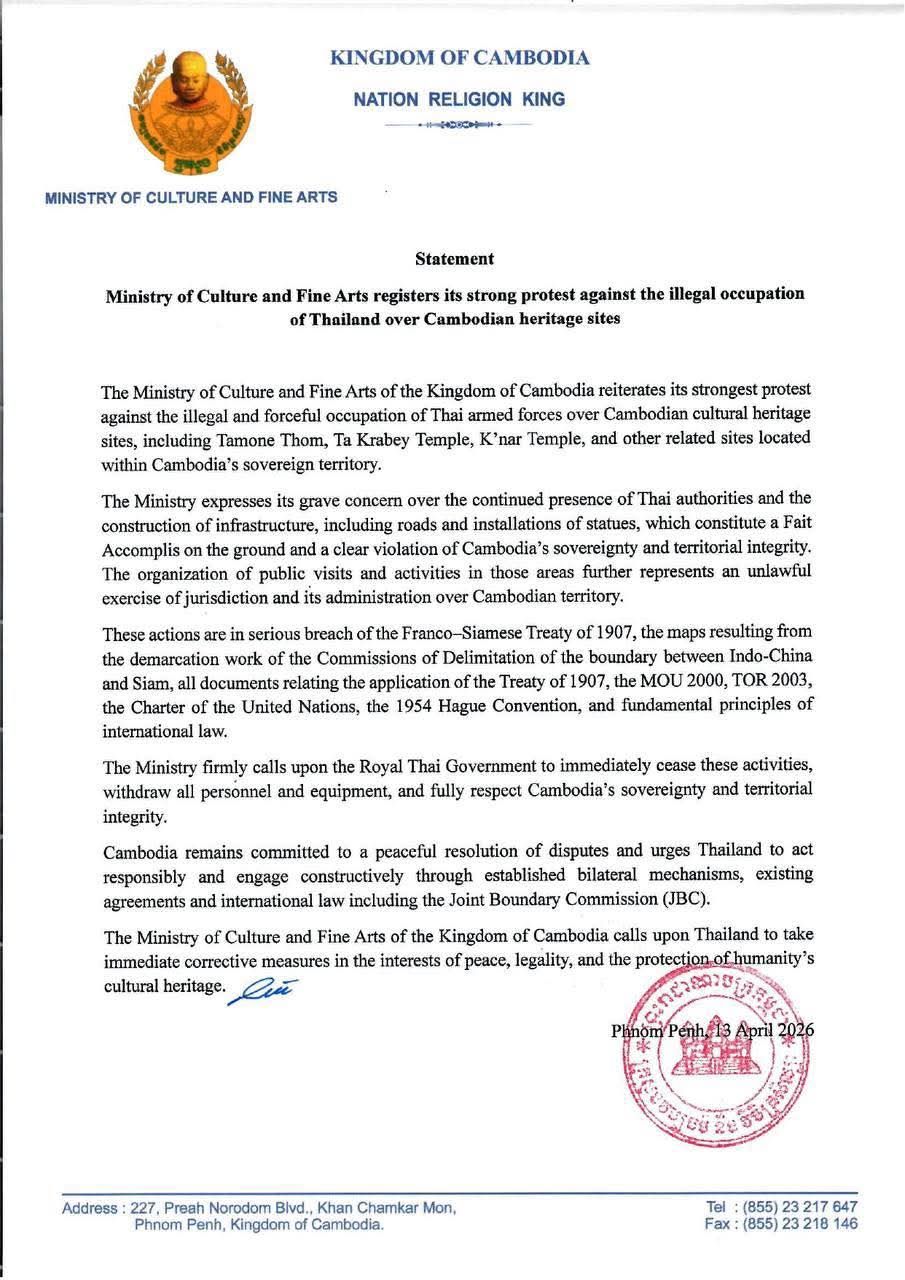ក្រសួងវប្បធម៌ និងវិចិត្រសិល្បៈ នៃព្រះរាជាណាចក្រកម្ពុជា សូមបញ្ជាក់ឡើងវិញនូវការតវ៉ាយ៉ាងមុតមាំ ចំពោះការកាន់កាប់ដោយខុសច្បាប់ និងដោយប្រើកងកម្លាំងប្រដាប់អាវុធរបស់ថៃមកលើតំបន់បេតិកភណ្ឌវប្បធម៌របស់កម្ពុជា រួមមាន ប្រាសាទតាមាន់ធំ ប្រាសាទតាក្របី ប្រាសាទខ្នារ និងតំបន់ពាក់ព័ន្ធផ្សេងៗទៀត ដែលស្ថិតក្នុងដែនអធិបតេយ្យភាពរបស់កម្ពុជា។