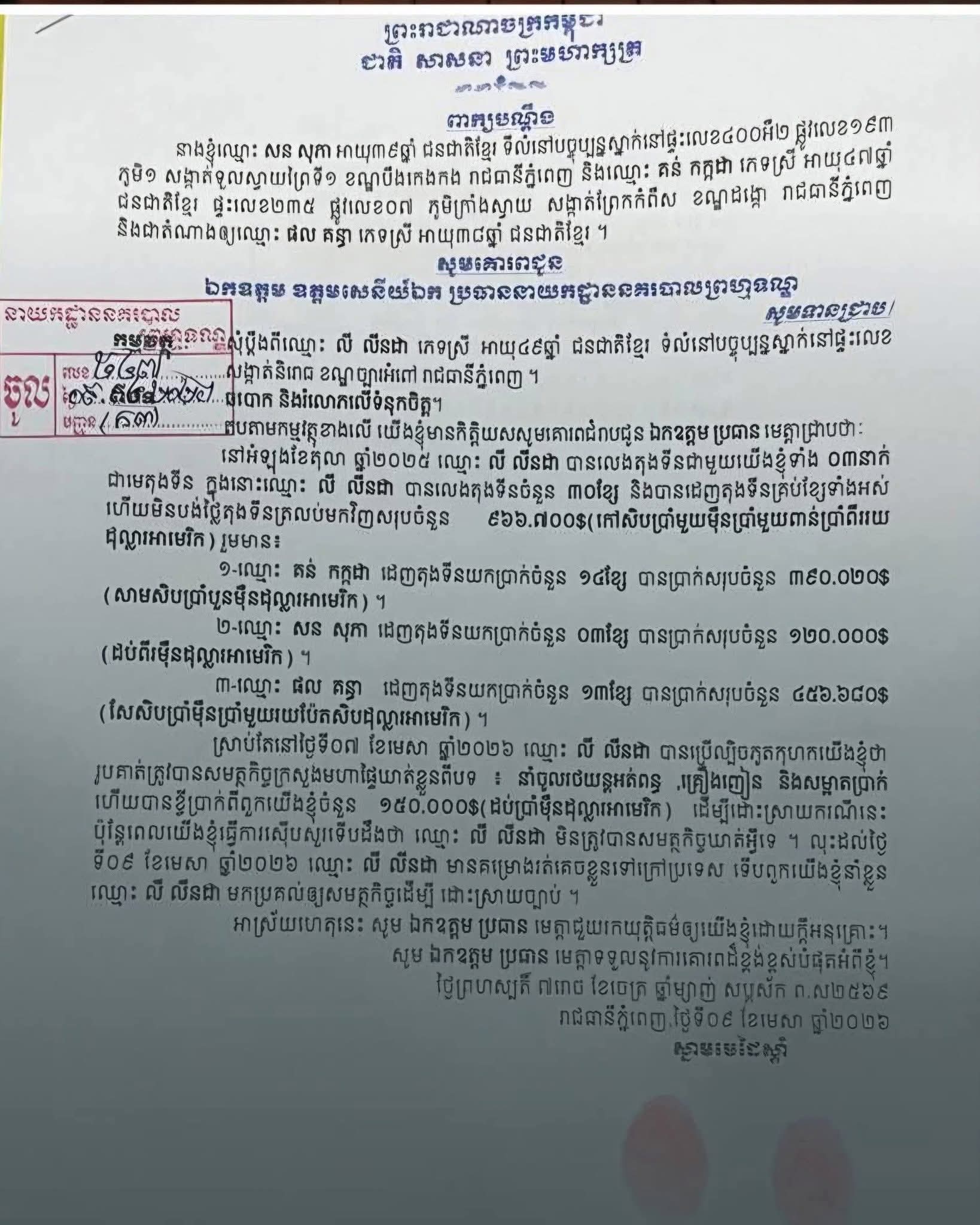 នារីហាយសូម្នាក់ ដេញតុងទីន ៣០ក្បាល សរុបលុយជិត ១លានដុល្លារ មិនបង់វិញ ត្រូវមេតុងតីនឃាត់ខ្លួនប្រគល់ជូន សមត្ថកិច្ច ពេលព្យាយាមគេចខ្លួនទៅក្រៅប្រទេស នាងឈ្មោះ លី លីនដា។