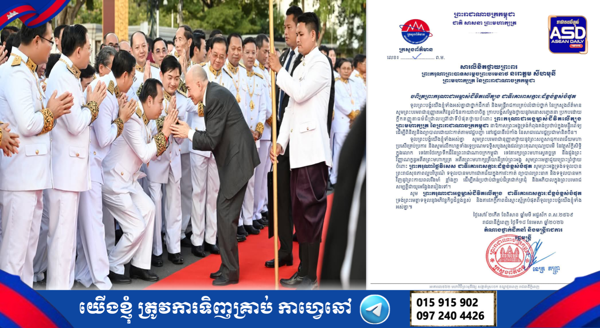 ឯកឧត្តម នេត្រ ភក្ត្រា រដ្ឋមន្ត្រីក្រសួងព័ត៌មាន ថ្នាក់ដឹកនាំ និងមន្ត្រីរាជការទាំងអស់ នៃក្រសួងព័ត៌មាន សូមក្រាបបង្គំទូលថ្វាយព្រះពរ ព្រះករុណាព្រះបាទសម្តេចព្រះបរមនាថ នរោត្តម សីហមុនី ព្រះមហាក្សត្រ នៃព្រះរាជាណាចក្រកម្ពុជា ជាទីគោរពសក្ការៈដ៏ខ្ពង់ខ្ពស់បំផុត សូមទ្រង់បានប្រកបដោយជោគជ័យក្នុងការព្យាបាលព្រះរោគដោយវះកាត់ នៅមន្ទីរពេទ្យរដ្ឋធានីប៉េកាំង នៃសាធារណរដ្ឋប្រជាមានិតចិន
