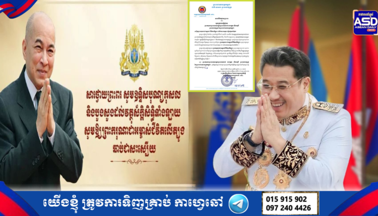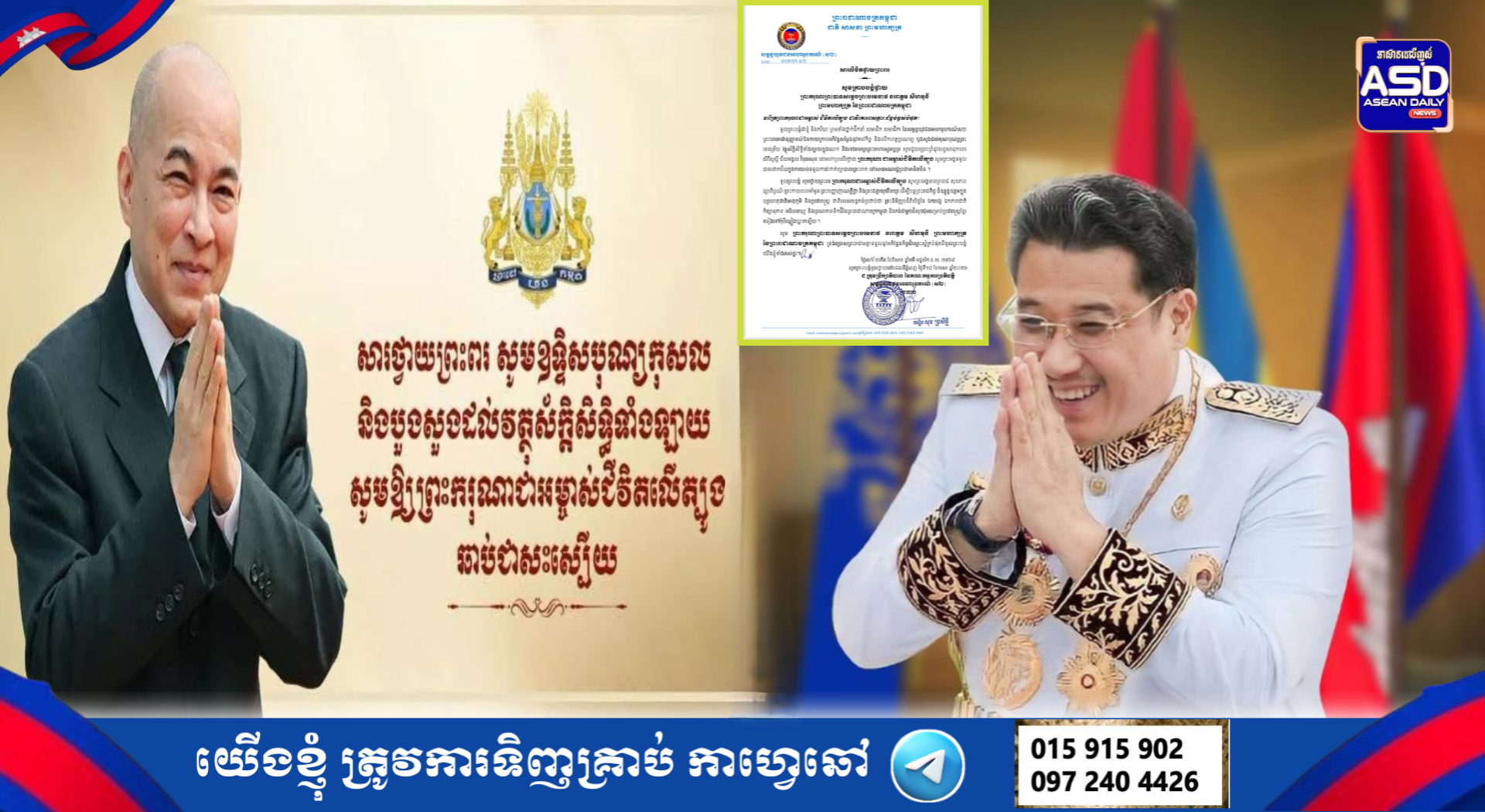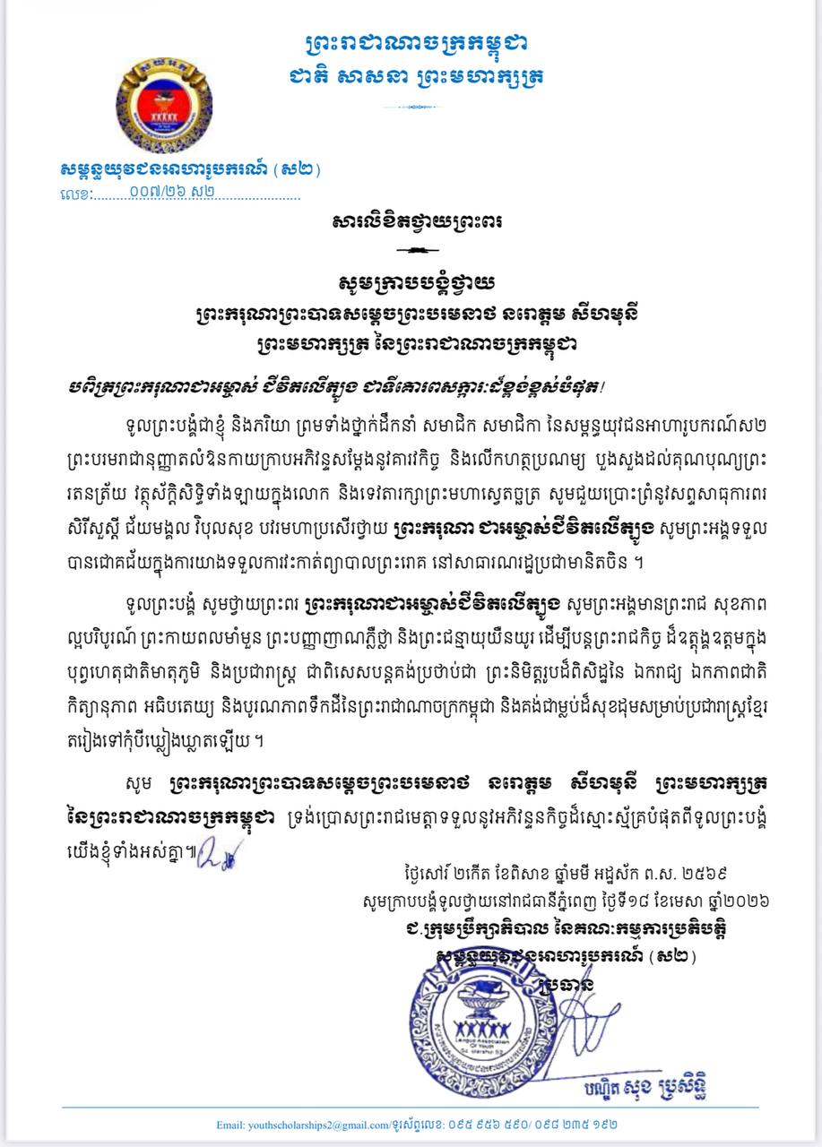 ឯកឧត្តម សុខ ប្រសិទ្ធិ ប្រធានក្រុមប្រឹក្សាភិបាល នៃគណៈកម្មការប្រតិបត្តិសម្ពន្ធយុវជនអាហារូបក រណ៍ស២ ព្រះបរមរាជានុញ្ញាតលំឱនកាយក្រាប អភិវន្ទសម្តែងនូវគារវកិច្ច និងលើកហត្ថប្រណម្យ បួងសួងដល់គុណបុណ្យព្រះរតនត្រ័យ វត្ថុ ស័ក្តិសិទ្ធិទាំងឡាយក្នុងលោក និងទេវតា រក្សាព្រះមហាស្វេតច្ឆត្រ សូមជួយប្រោះព្រំនូរ សព្ទសាធុការពរ សិរីសួស្តី ជ័យមង្គល វិបុលសុខ បវរមហាប្រសើរថ្វាយ ព្រះករុណា ជាអម្ចាស់ជីវិត លើត្បូង សូមព្រះអង្គទទួលបានជោគជ័យក្នុង ការយ៉ាងទទួលការវះកាត់ព្យាបាលព្រះរោគ នៅ សាធារណរដ្ឋប្រជាមានិតចិន ។