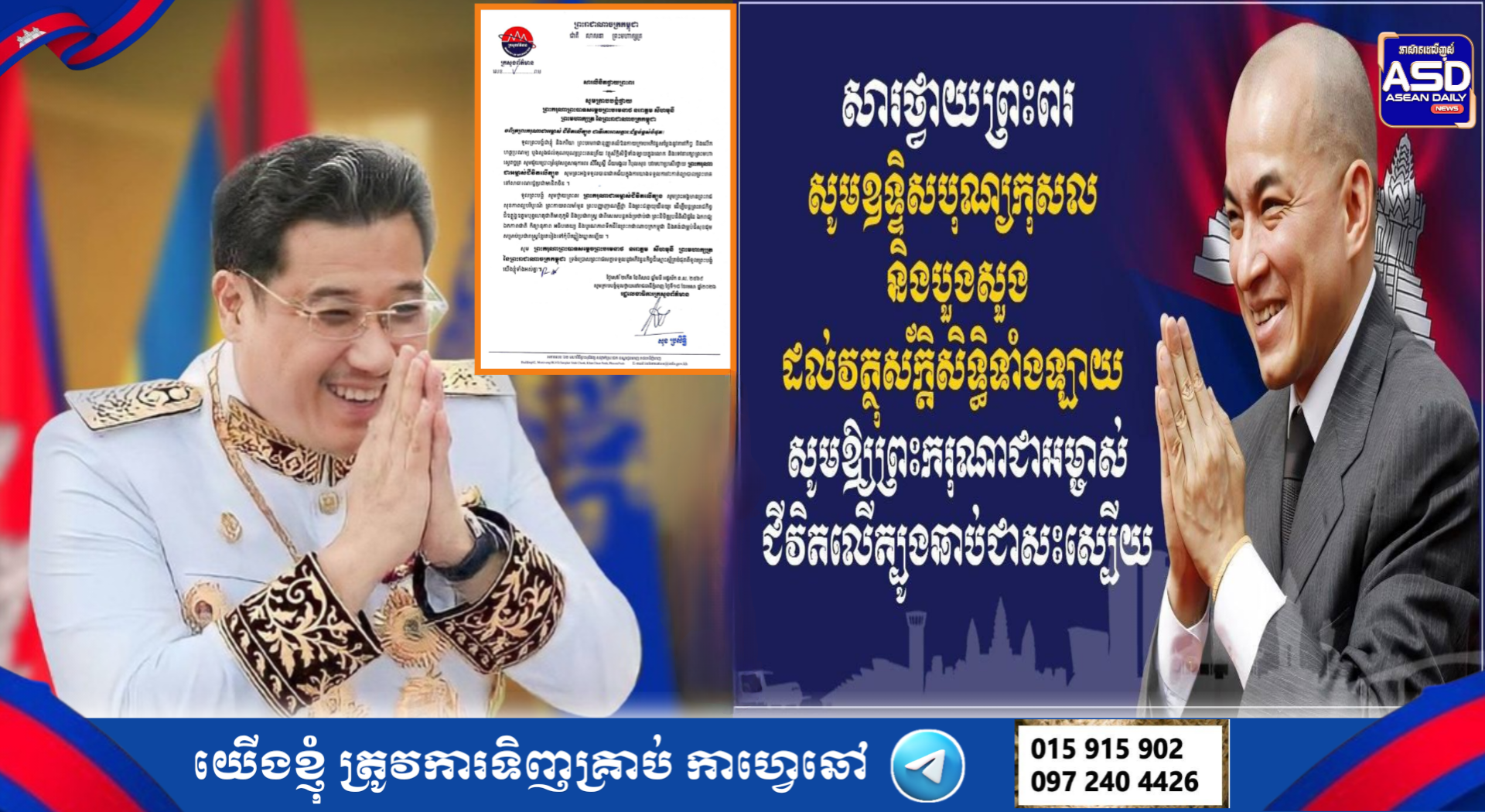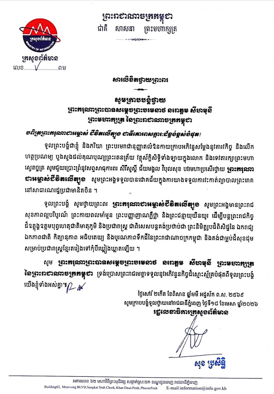 ឯកឧត្តម សុខ ប្រសិទ្ធិ រដ្ឋលេខាធិការ ក្រសួងព័ត៌មាន ព្រះបរមរាជានុញ្ញាតលំឱនកាយ ក្រាបអភិវន្ទសម្តែងនូវគារវកិច្ច និងលើក ហត្ថប្រណម្យ បួងសួងដល់គុណបុណ្យ ព្រះរតនត្រ័យ វត្ថុស័ក្តិសិទ្ធិទាំងឡាយក្នុងលោក និងទេវតារក្សាព្រះមហាស្វេតច្ឆត្រ សូមជួយ ប្រោះព្រំនូរសព្ទសាធុការពរ សិរីសួស្តី ជ័យមង្គល វិបុលសុខ បររមហាប្រសើរថ្វាយ ព្រះករុណា ជា អម្ចាស់ជីវិតលើត្បូង សូមព្រះអង្គទទួលបាន ជោគជ័យក្នុងការយាងទទួលការវះកាត់ព្យាបាល ព្រះរោគ នៅសាធារណរដ្ឋប្រជាមានិតចិន ។