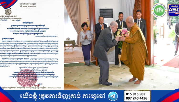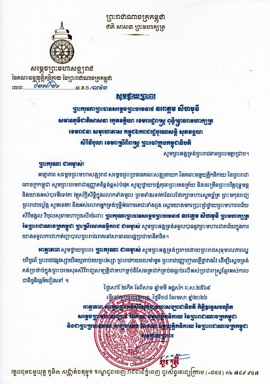 សម្តេចព្រះមហាសង្ឃរាជ នៃគណៈធម្មយុត្តិកនិកាយ នៃព្រះរាជាណាចក្រកម្ពុជា|សារលិខិតថ្វាយព្រះពរ សូមចម្រើនពរថ្វាយ ព្រះករុណាព្រះបាទសម្តេចព្រះបរមនាថ នរោត្តម សីហមុនី ព្រះមហាក្សត្រ នៃព្រះរាជាណាចក្រកម្ពុជា ជាទីស្រលាញ់រាប់អានដ៏ខ្ពង់ខ្ពស់បំផុតក្នុង ព្រះធម៌!