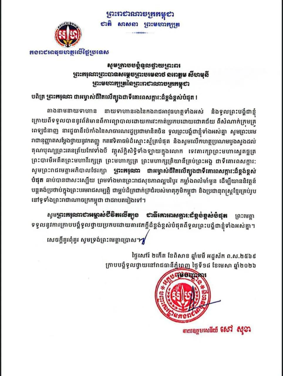ឧត្តមសេនីយ៍ត្រី ហេង ប៊ុនទី មេបញ្ជាការ កងរាជអាវុធហត្ថខេត្តព្រះសីហនុ ព្រមទាំងនាយទាហាន នាយទាហានរង និងពលទាហាននៃកងរាជអាវុធហត្ថទាំងមូល សូមក្រាបបង្គំទូលថ្វាយព្រះពរ ព្រះករុណា ព្រះបាទសម្តេចព្រះបរមនាថ នរោត្តម សីហមុនី ព្រះមហាក្សត្រ នៃព្រះរាជាណាចក្រកម្ពុជា ជាទីគោរពសក្ការៈដ៏ខ្ពង់ខ្ពស់បំផុត ឆាប់បានជាសះស្បើយ ដែលត្រូវបានព្យាបាលដោយវះកាត់ប្រកបដោយជោគជ័យ នៅមន្ទីរពេទ្យរដ្ឋធានីប៉េកាំង នៃសាធារណរដ្ឋប្រជាមានិតចិន។