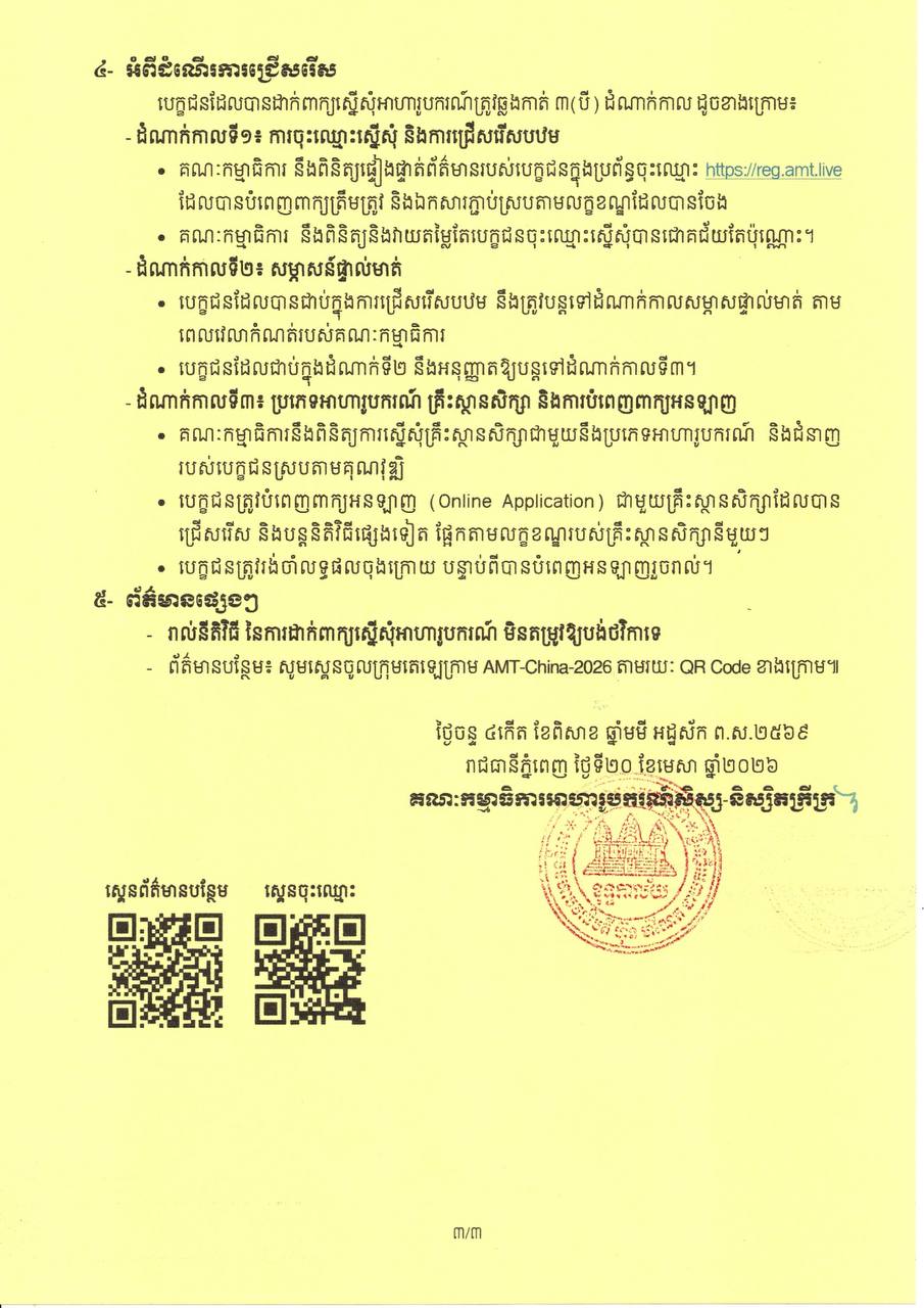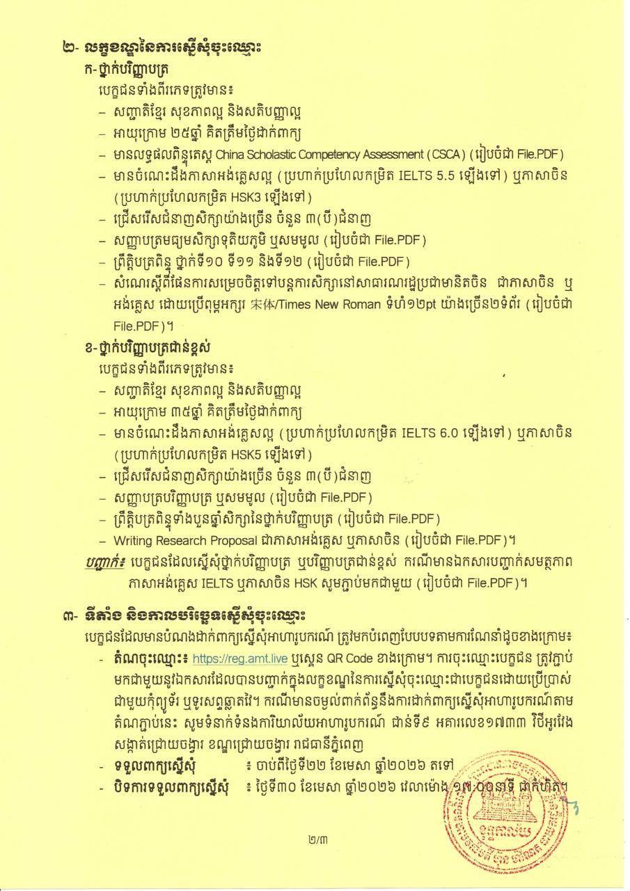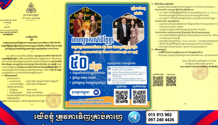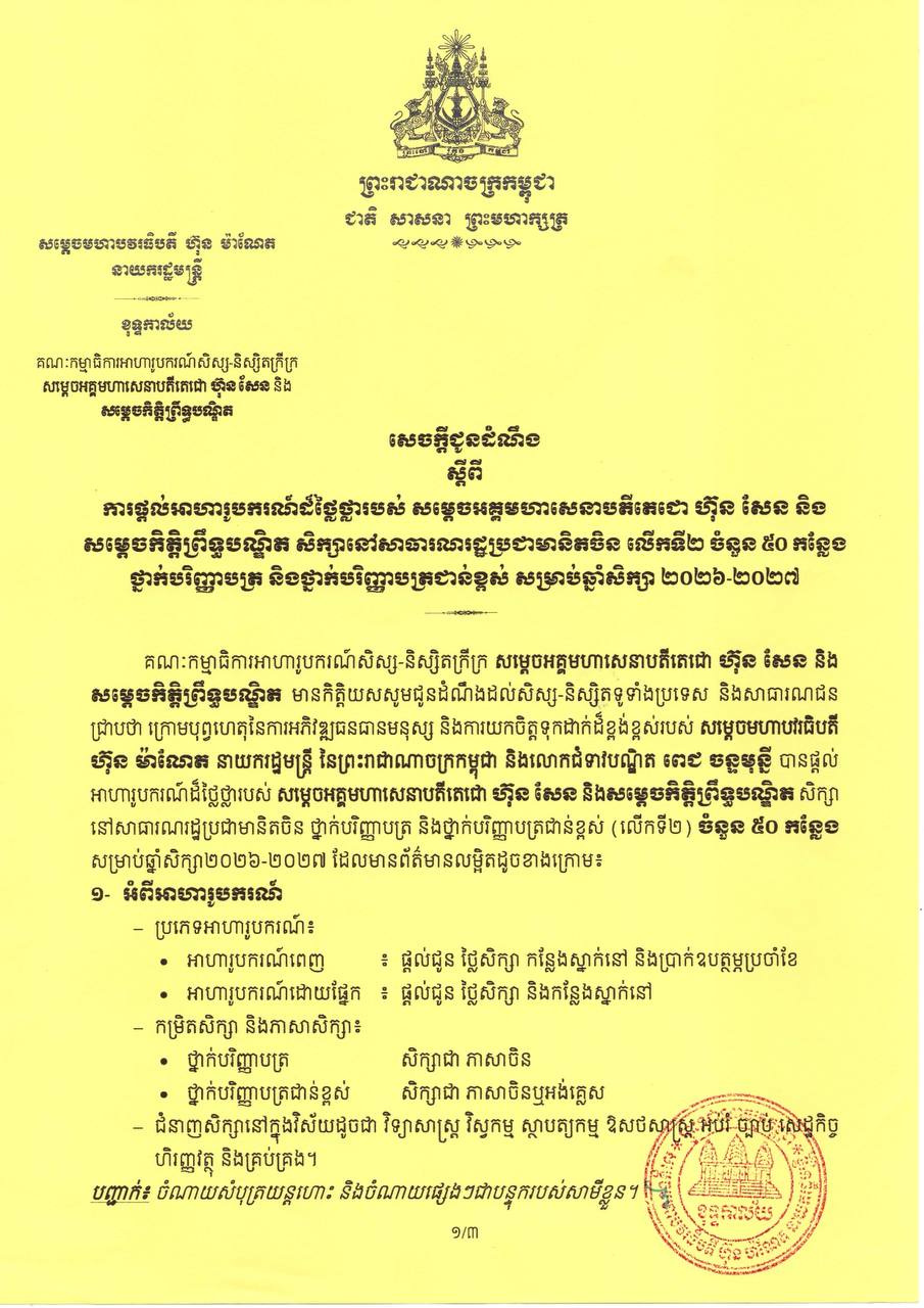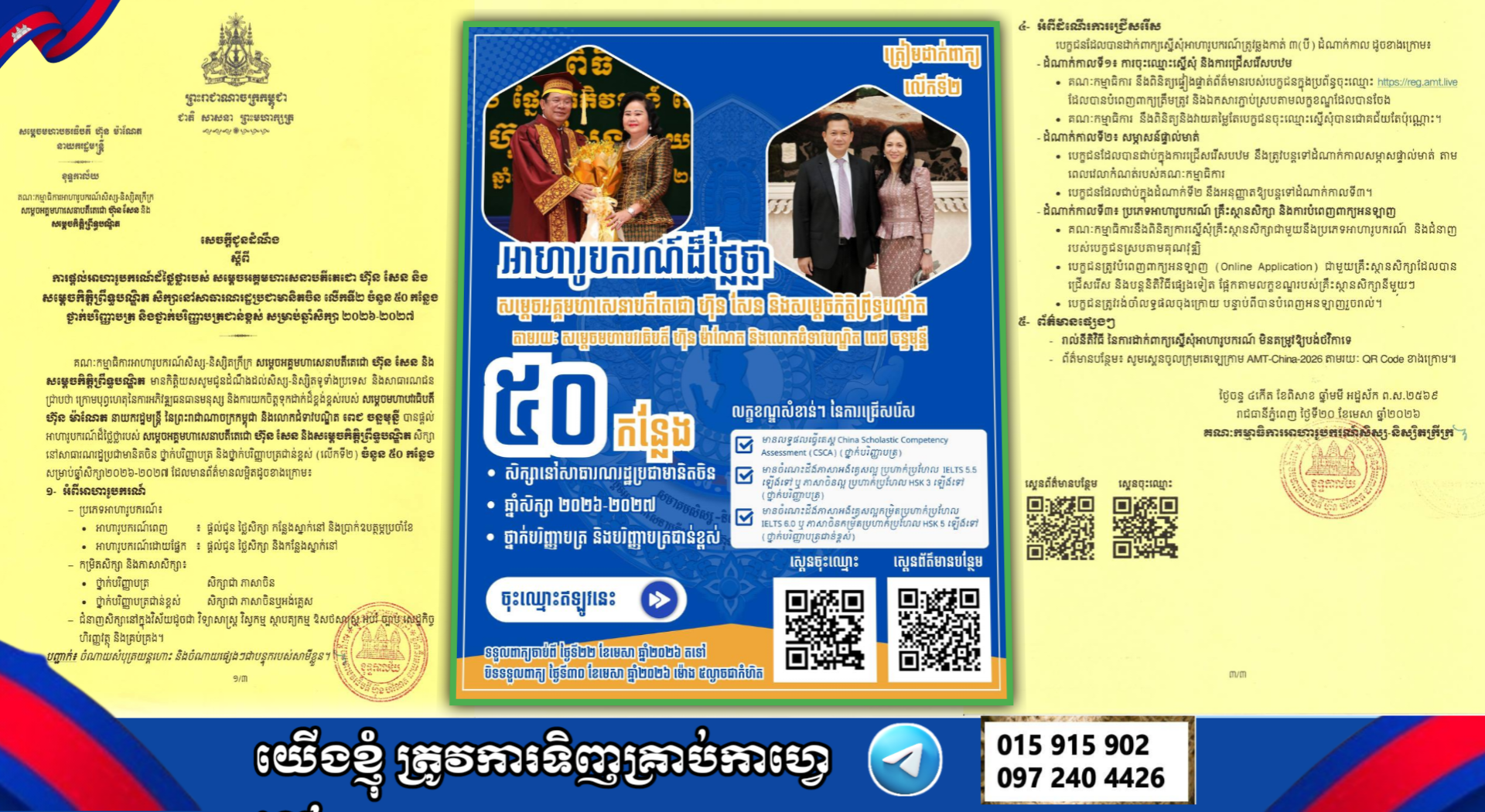 សម្តេចមហាបវរធិបតី ហ៊ុន ម៉ាណែត និង លោកជំទាវបណ្ឌិត ពេជ ចន្ទមុន្នី ហ៊ុនម៉ាណែ ត ផ្តល់អាហារូបករណ៍ដ៏ថ្លៃថ្លារបស់ សម្តេច អគ្គមហាសេនាបតីតេជោ ហ៊ុន សែន និងសម្តេច កិត្តិព្រឹទ្ធបណ្ឌិត (អ.ម.ត) នៅសាធារណរដ្ឋ ប្រជាមានិតចិន ថ្នាក់បរិញ្ញាបត្រ និងថ្នាក់ បរិញ្ញាបត្រជាន់ខ្ពស់ សម្រាប់ឆ្នាំសិក្សា ២០២៦-២០២៧ ចំនួន ៥០ កន្លែង ដោយ ឆ្លងកាត់ការប្រឡង។ កាលបរិច្ឆេទទទួលពាក្យ៖ ចាប់ពីថ្ងៃទី២២ ខែមេសា ឆ្នាំ២០២៦ រហូតដល់ថ្ងៃទី៣០ ខែមេសា ឆ្នាំ២០២៦ វេលាម៉ោង ១៧:០០ នាទី ជាកំហិត។