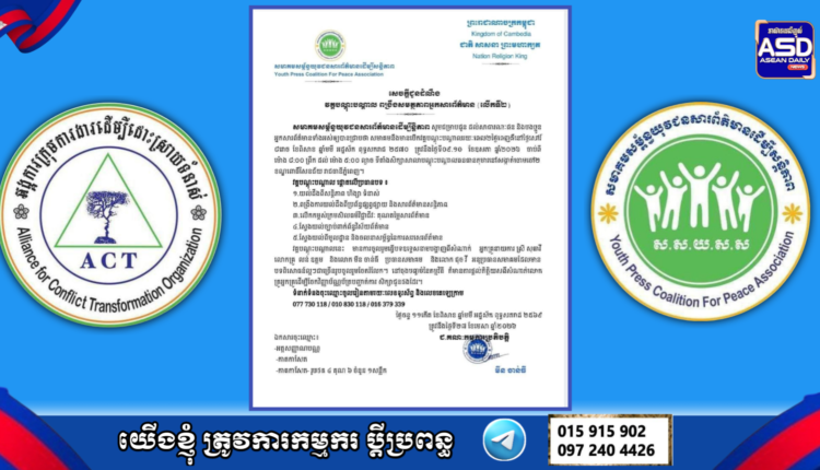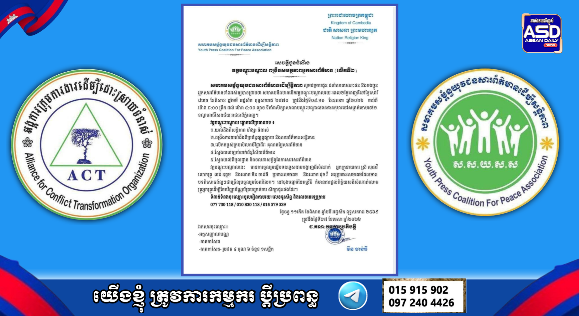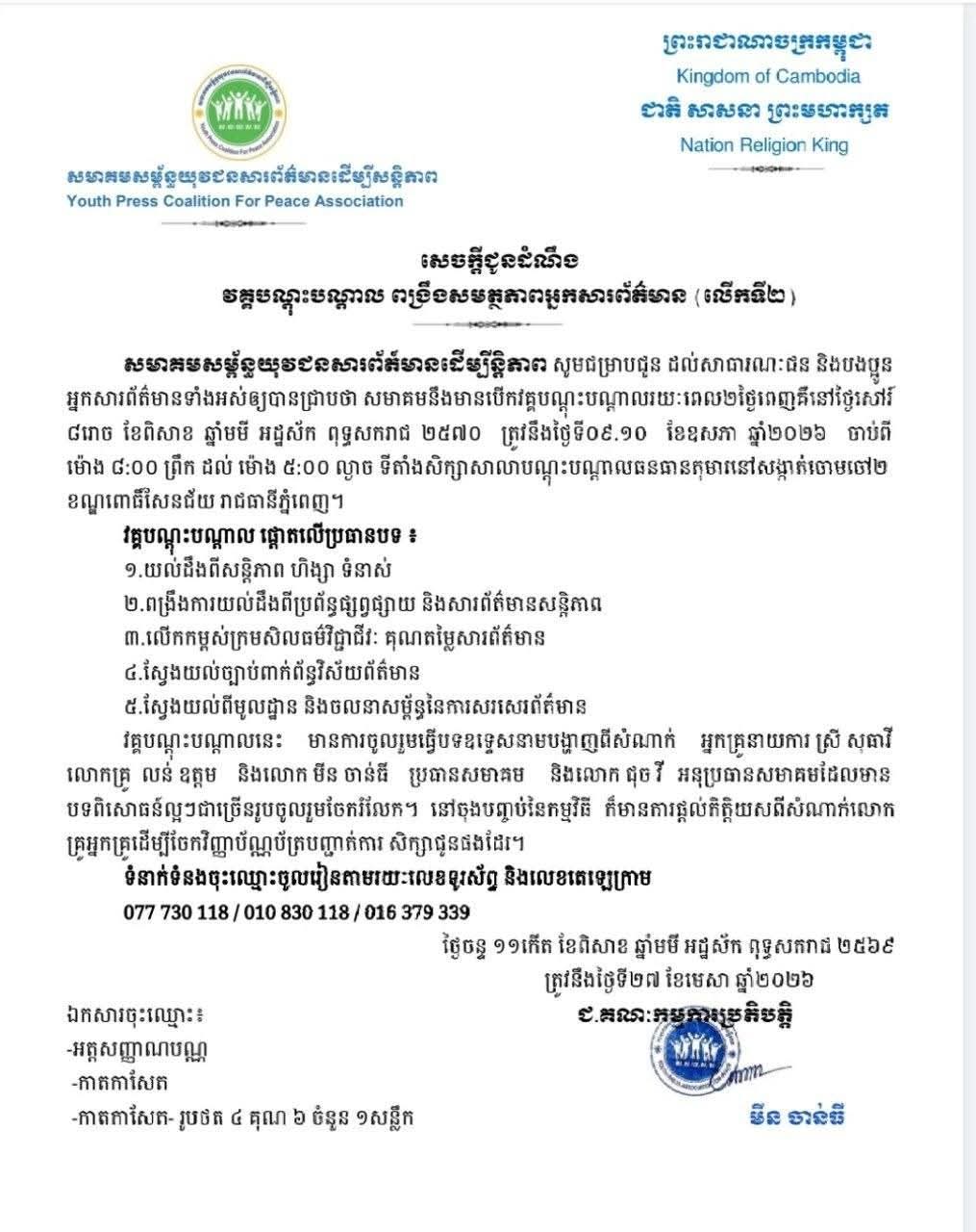 សមាគមសម្ព័ន្ធយុវជនសារព័ត៌មានដើម្បីសន្តិភាព និងអង្គការក្រុមការងារដេីម្បីដោះស្រាយទំនាស់(ACT) នឹងរៀបចំវគ្គបណ្តុះបណ្តាល ពង្រឹងសមត្ថភាពអ្នកសារព័ត៌មាន (លើកទី២)ដែលមានរយ:ពេល២ថ្ងៃ ចាប់ពីថ្ងៃទី០៩-១០ ឧសភា ឆ្នាំ២០២៦