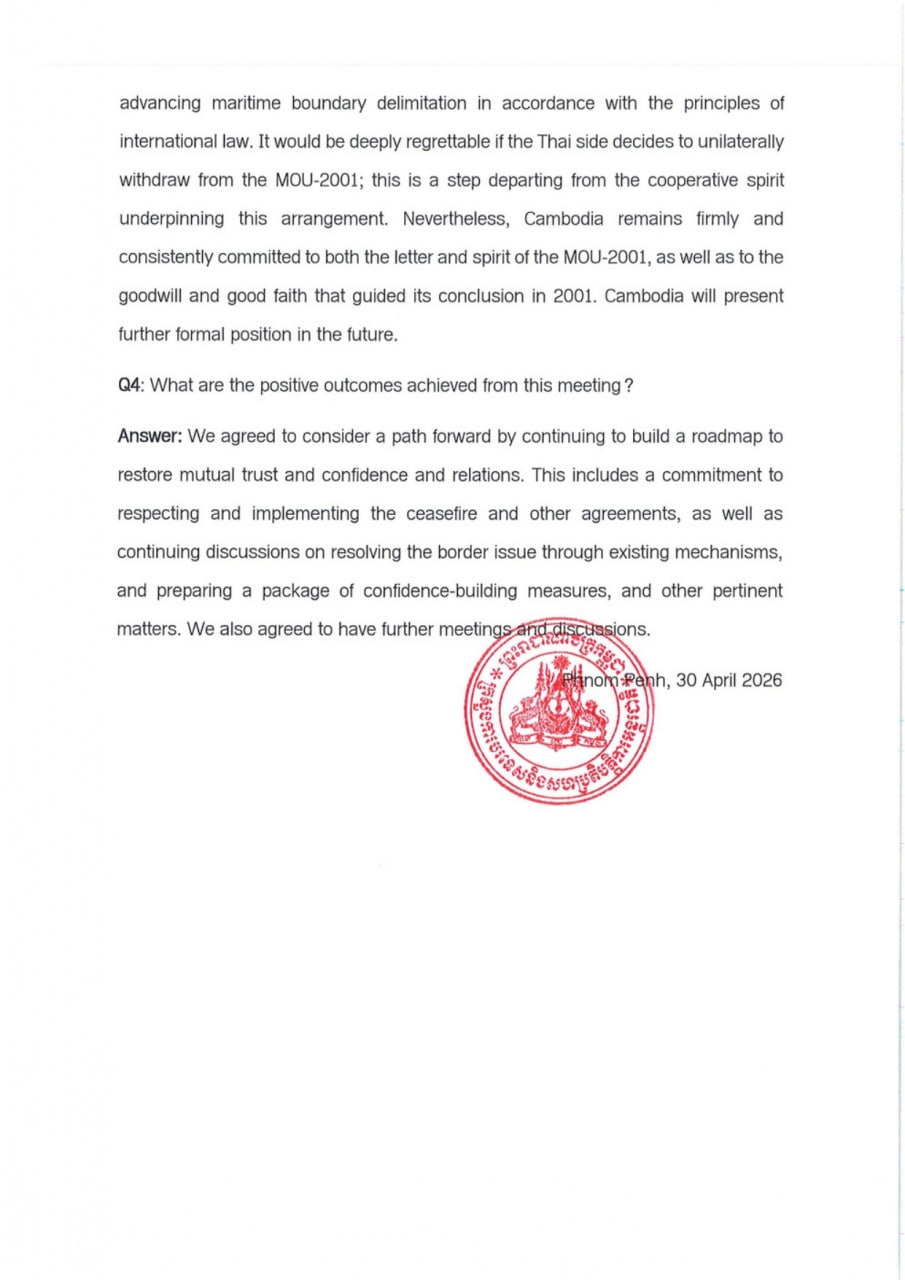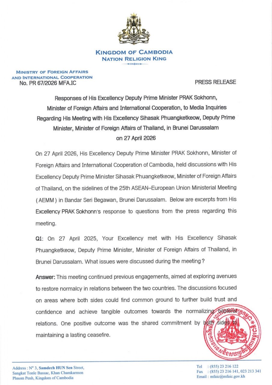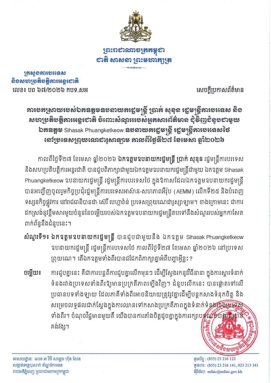 ការបកស្រាយរបស់ឯកឧត្តមឧបនាយករដ្ឋមន្ត្រី ប្រាក់ សុខុន រដ្ឋមន្ត្រីការបរទេស និងសហប្រតិបត្តិការអន្តរជាតិ ចំពោះសំណួររបស់អ្នកសារព័ត៌មាន ជុំវិញជំនួបជាមួយ ឯកឧត្តម Sihasak Phuangketkeow ឧបនាយករដ្ឋមន្ត្រី រដ្ឋមន្ត្រីការបរទេសថៃ នៅប្រទេសព្រុយណេដារូសាឡាម កាលពីថ្ងៃទី២៧ ខែមេសា ឆ្នាំ២០២៦ Responses of His Excellency Deputy Prime Minister PRAK Sokhonn, Minister of Foreign Affairs and International Cooperation, to Media Inquiries Regarding His Meeting with His Excellency Sihasak Phuangketkeow, Deputy Prime Minister, Minister of Foreign Affairs of Thailand, in Brunei Darussalam on 27 April 2026