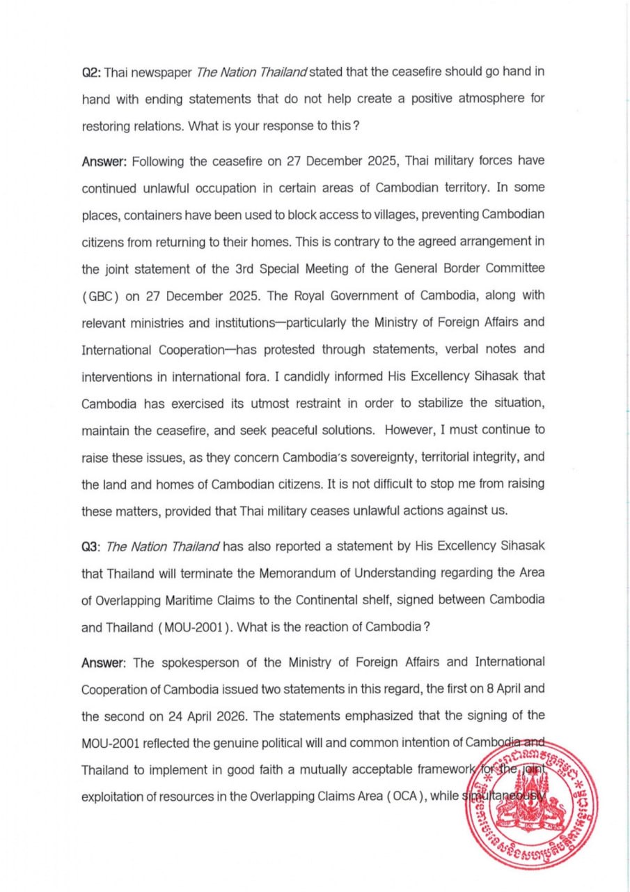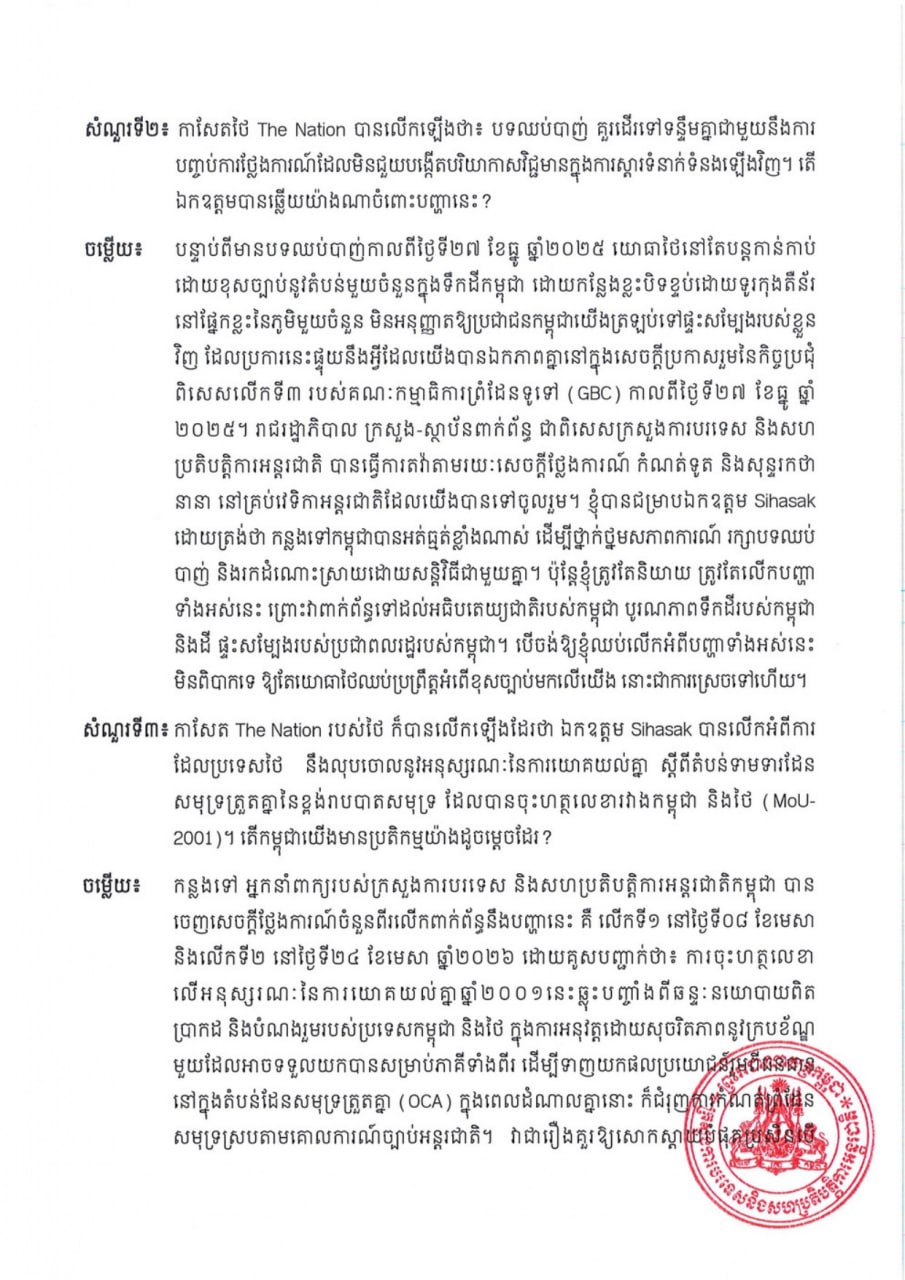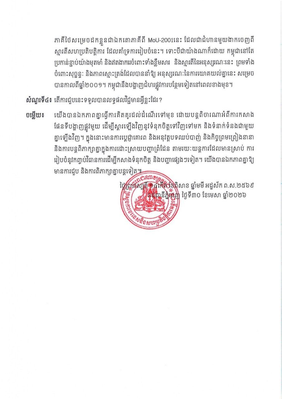 ការបកស្រាយរបស់ឯកឧត្តមឧបនាយករដ្ឋមន្ត្រី ប្រាក់ សុខុន រដ្ឋមន្ត្រីការបរទេស និងសហប្រតិបត្តិការអន្តរជាតិ ចំពោះសំណួររបស់អ្នកសារព័ត៌មាន ជុំវិញជំនួបជាមួយ ឯកឧត្តម Sihasak Phuangketkeow ឧបនាយករដ្ឋមន្ត្រី រដ្ឋមន្ត្រីការបរទេសថៃ នៅប្រទេសព្រុយណេដារូសាឡាម កាលពីថ្ងៃទី២៧ ខែមេសា ឆ្នាំ២០២៦ Responses of His Excellency Deputy Prime Minister PRAK Sokhonn, Minister of Foreign Affairs and International Cooperation, to Media Inquiries Regarding His Meeting with His Excellency Sihasak Phuangketkeow, Deputy Prime Minister, Minister of Foreign Affairs of Thailand, in Brunei Darussalam on 27 April 2026